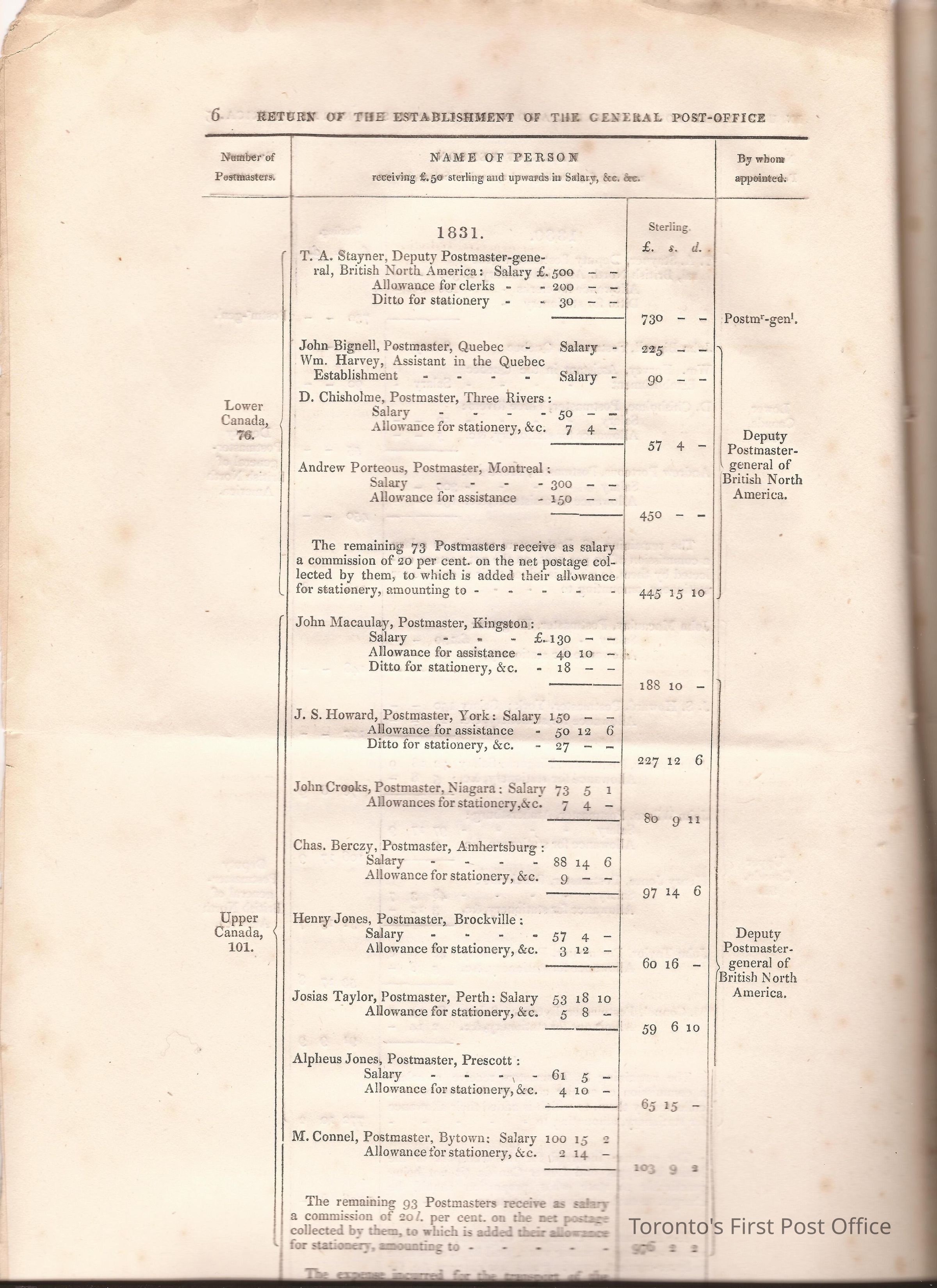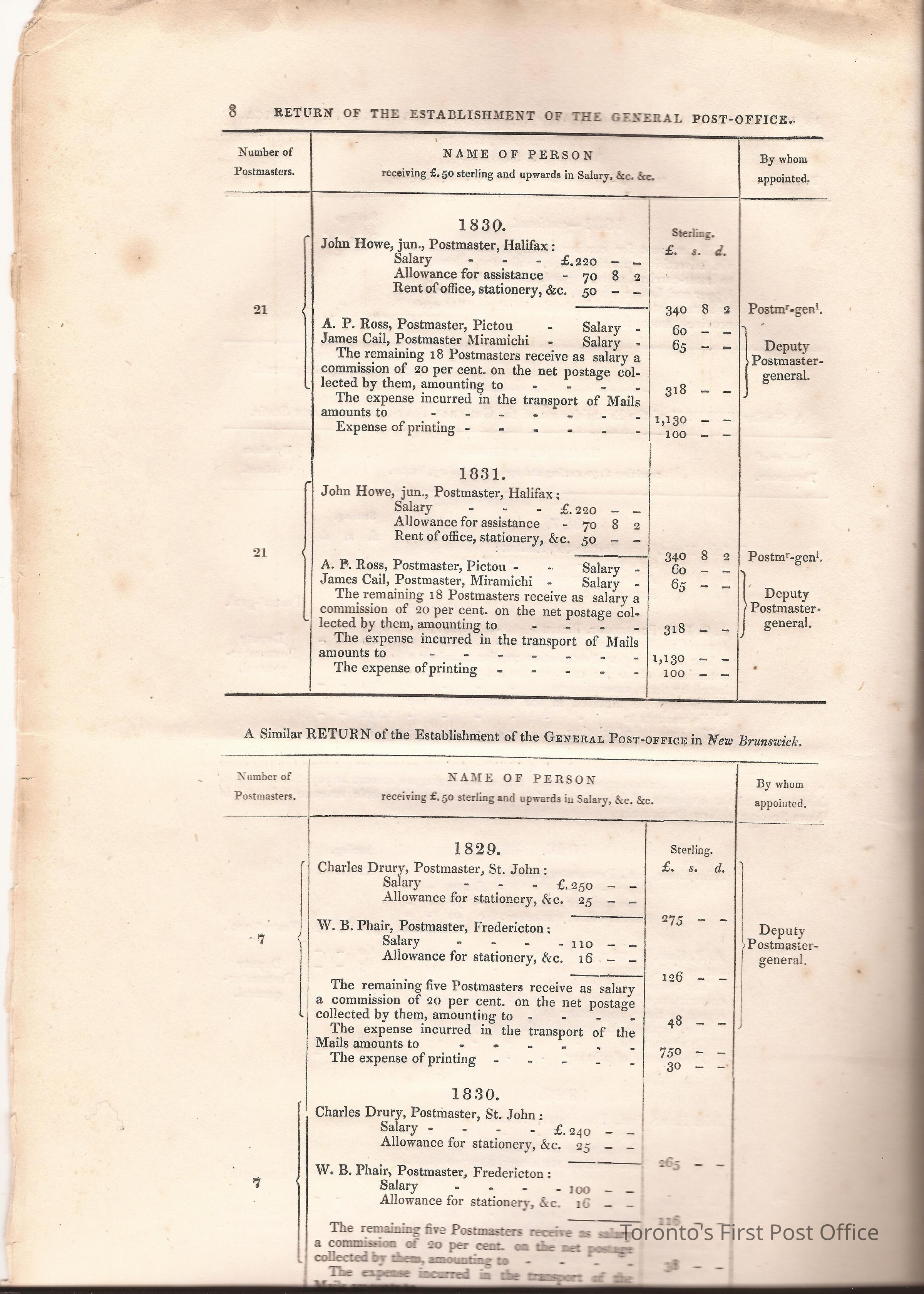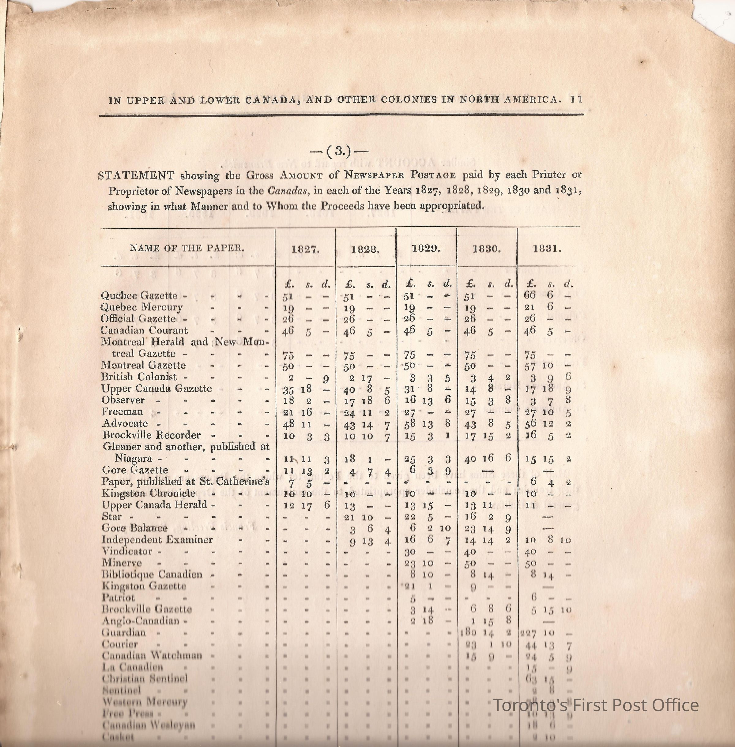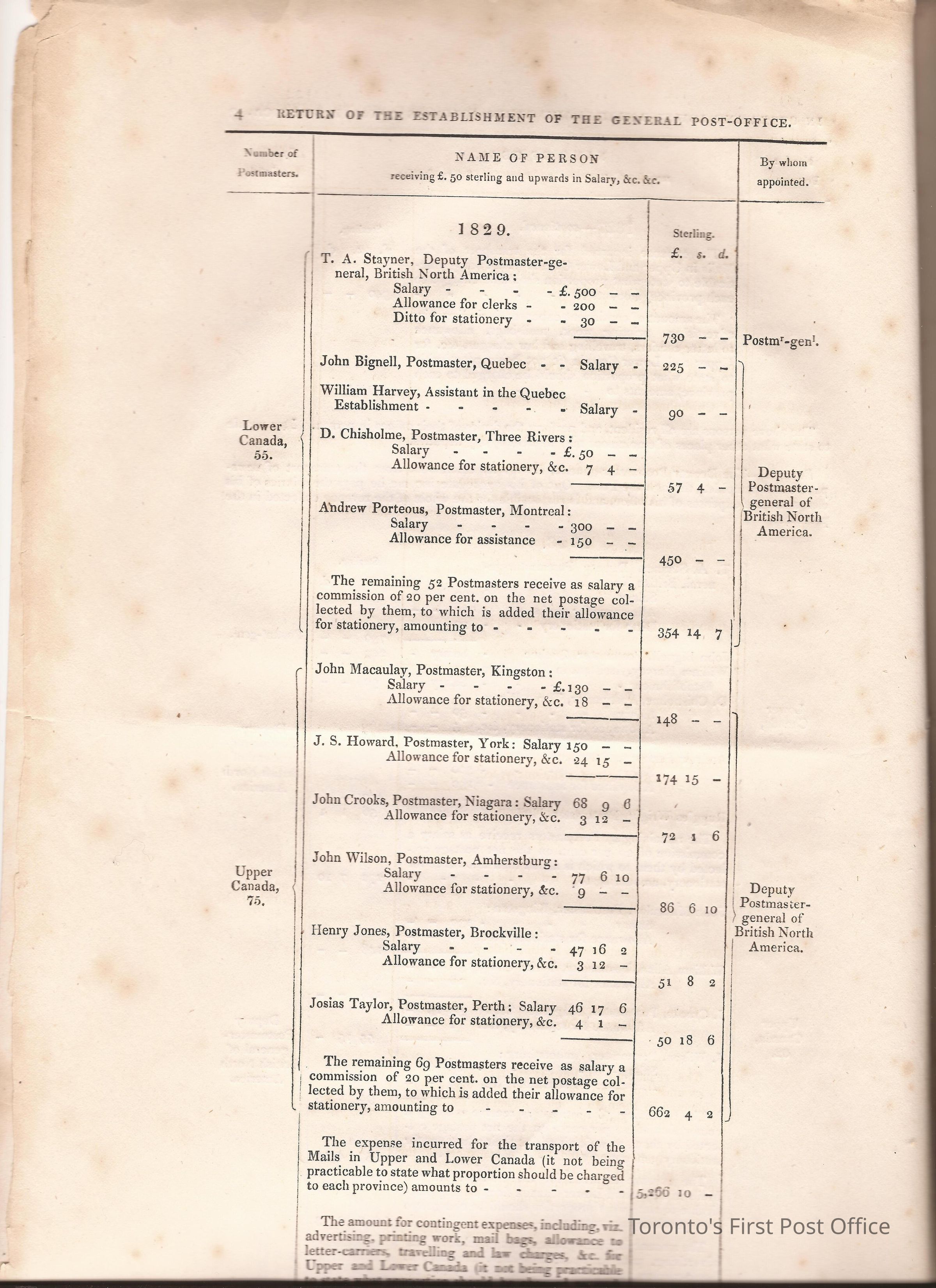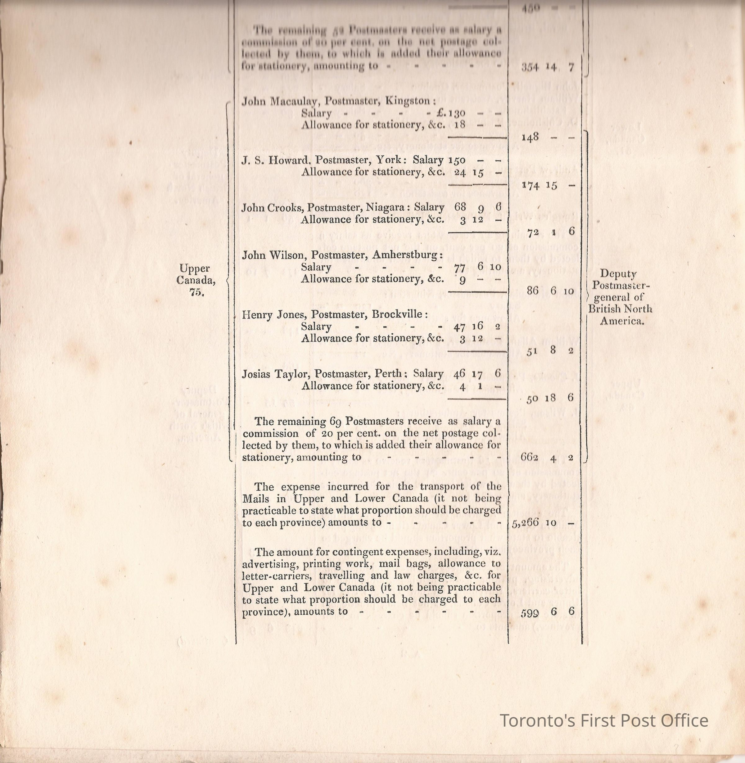 Document titled: "Canada Post Office"; re: number of postmasters and deputy postmasters in each province, their salary, allowance, what other offices these persons held and similar; pages divided into four columns: number of postmasters, name of person, monies received, by whom appointed; last two pages outline postage in U.C./L.C./N.S./N.B. in 1827, 1828, 1829, 1830, and 1831 for letter and newspaper rate; 7 pp, 14 sides of print; cotton thread bound; unbleached paper.Update Date