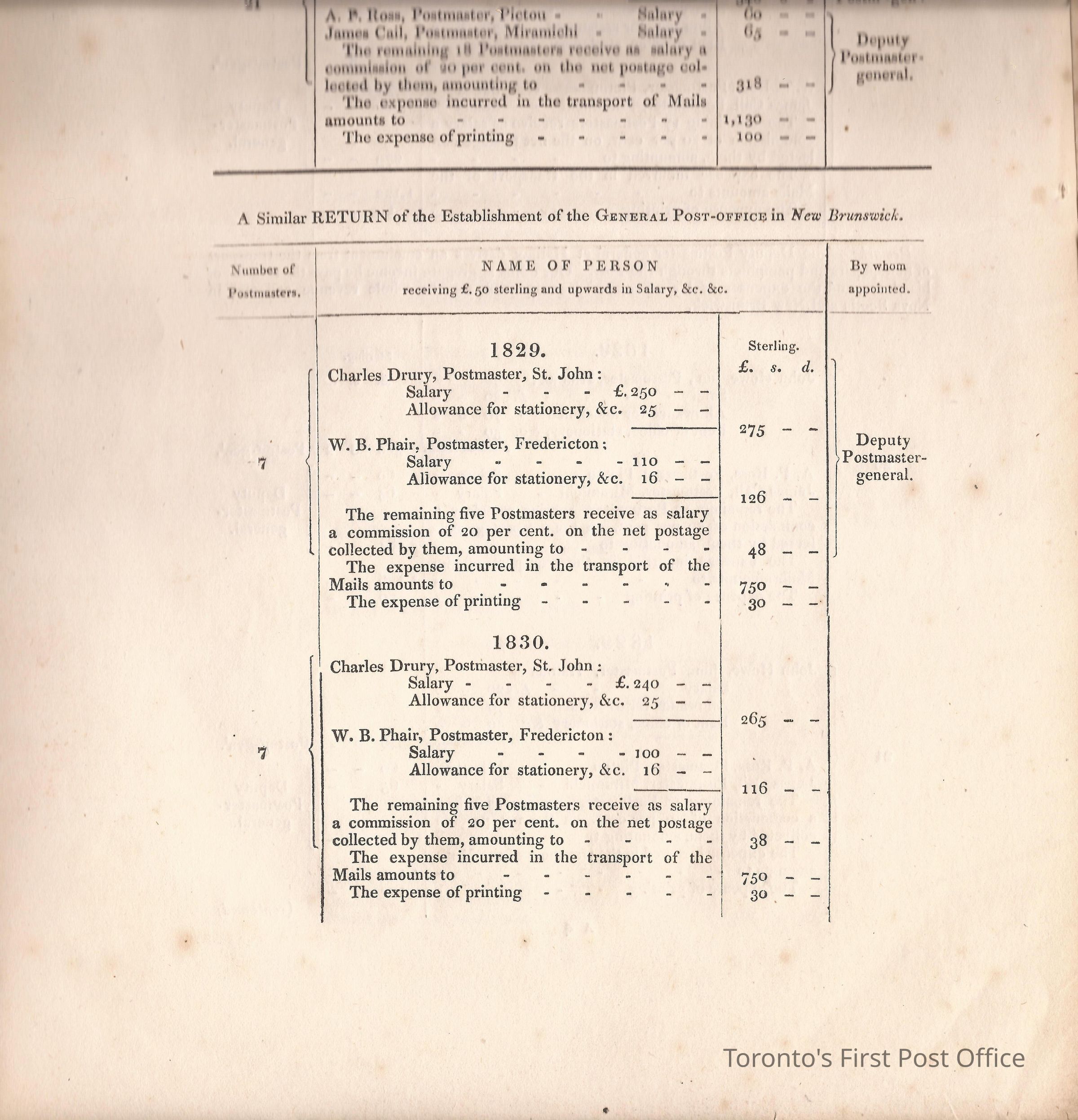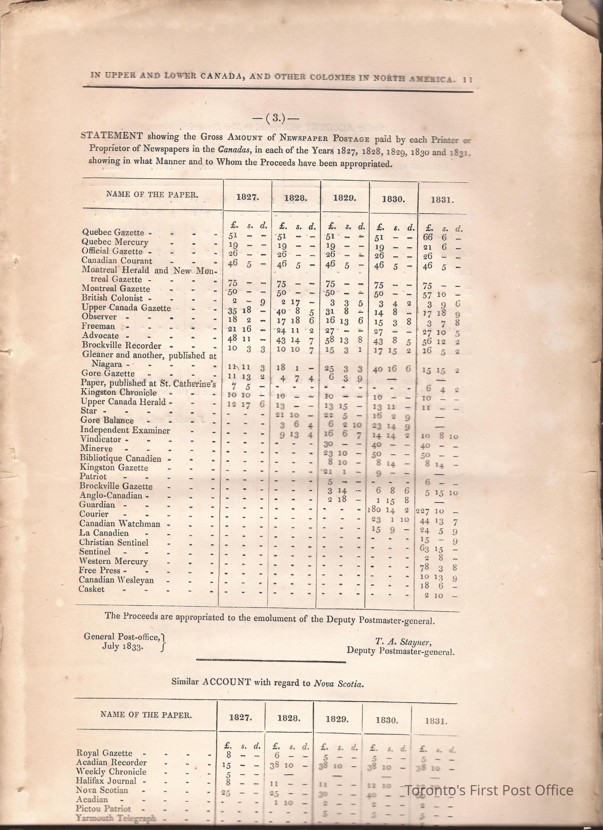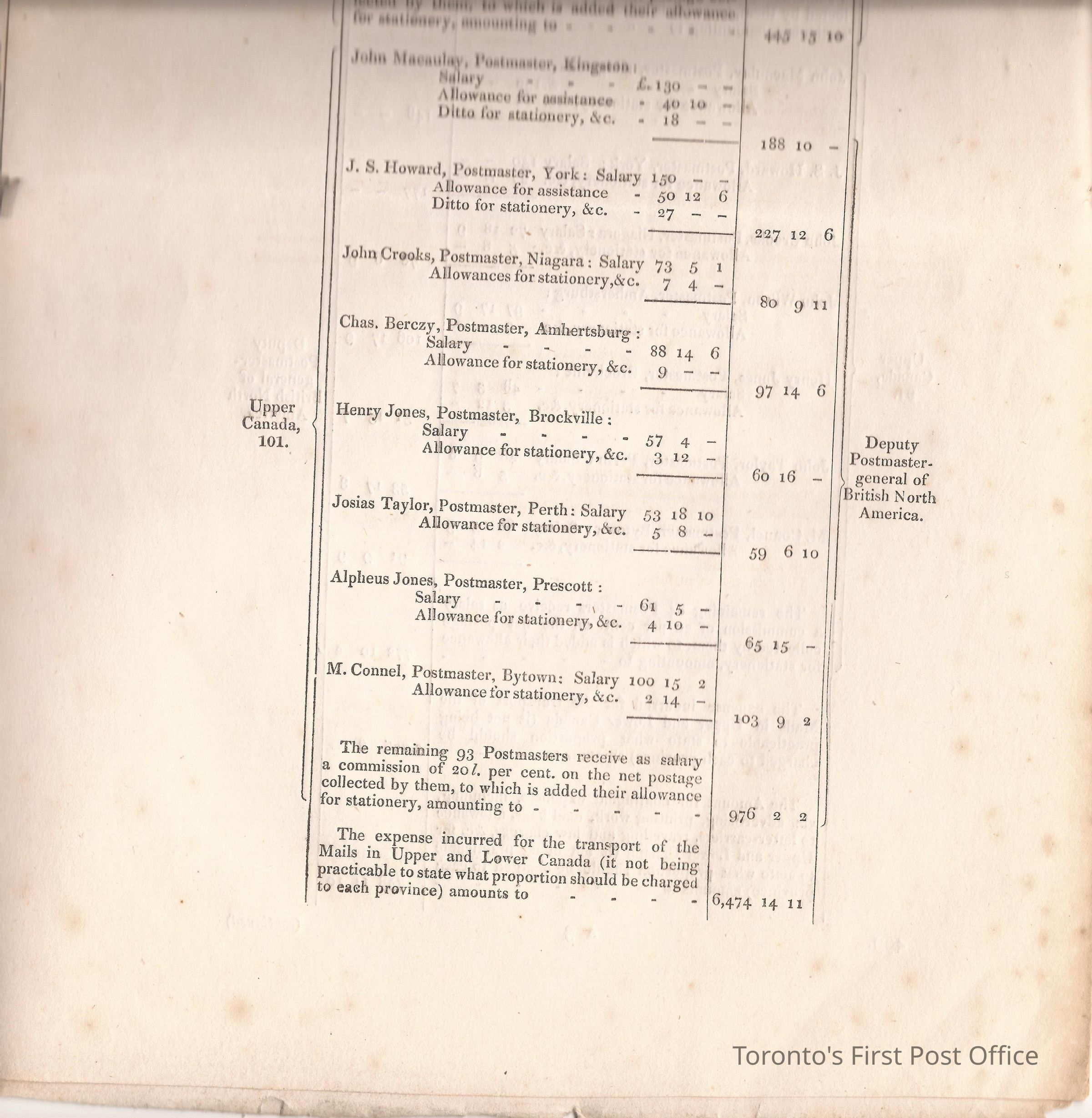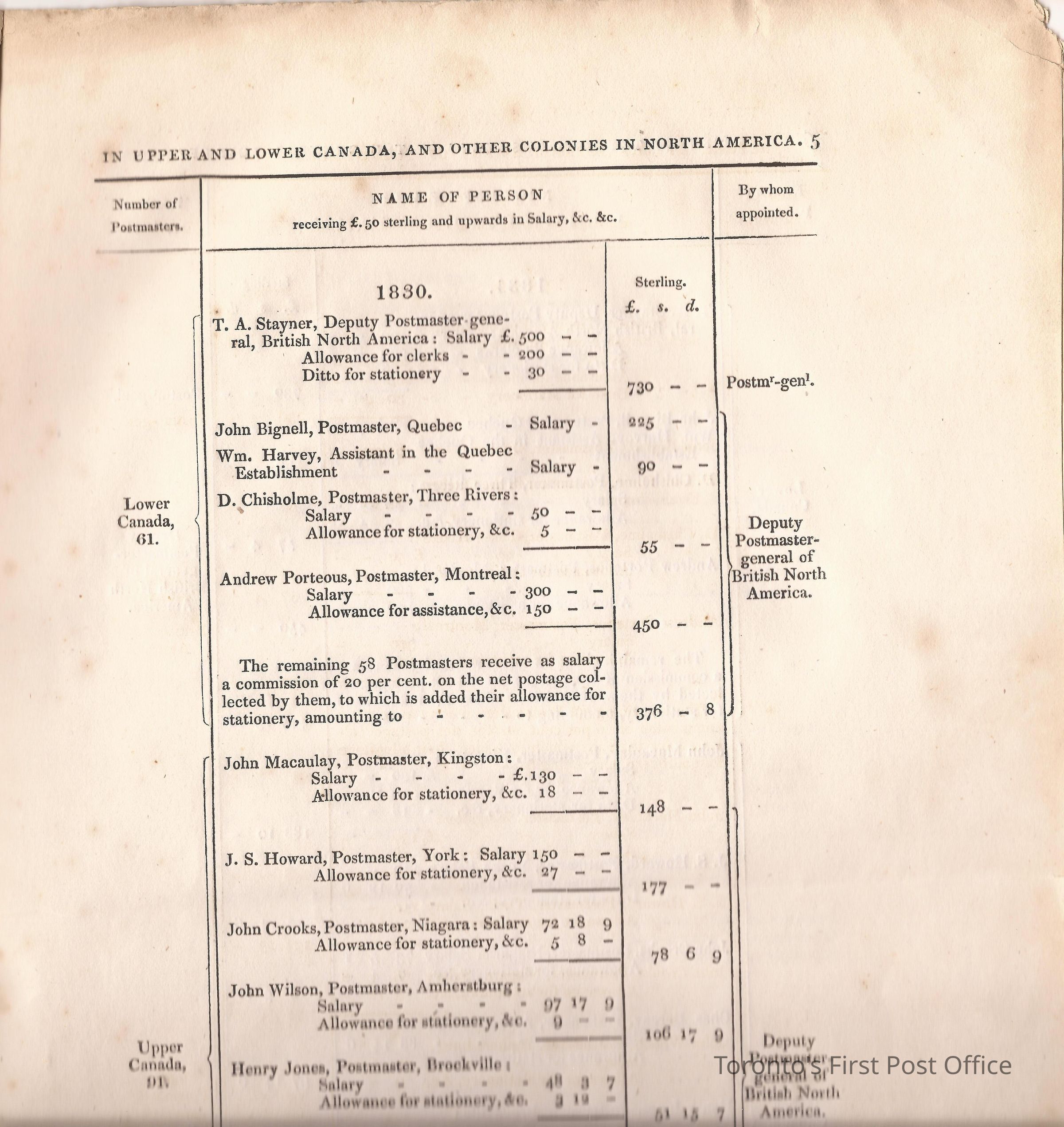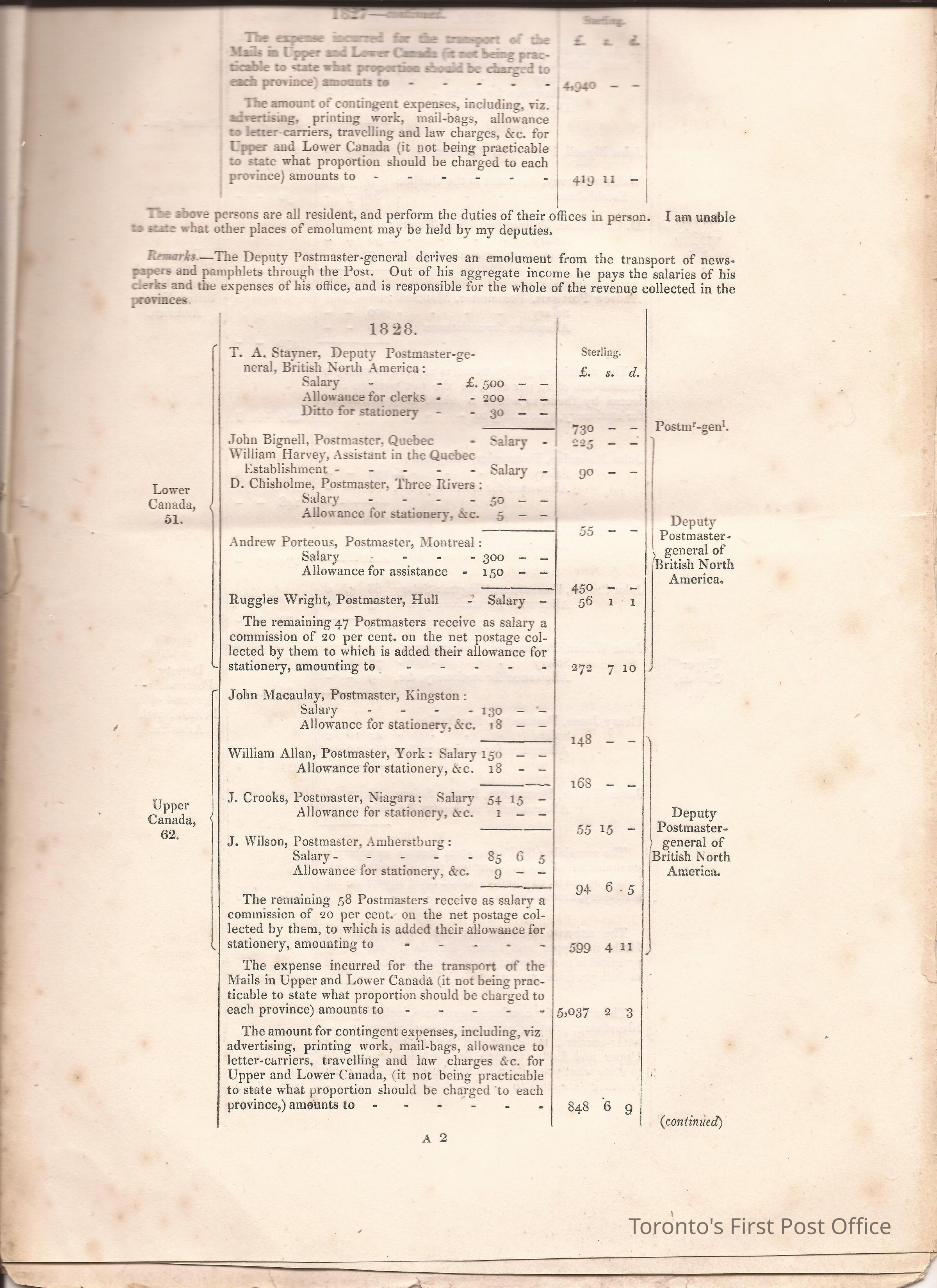 Document titled: "Canada Post Office"; re: number of postmasters and deputy postmasters in each province, their salary, allowance, what other offices these persons held and similar; pages divided into four columns: number of postmasters, name of person, monies received, by whom appointed; last two pages outline postage in U.C./L.C./N.S./N.B. in 1827, 1828, 1829, 1830, and 1831 for letter and newspaper rate; 7 pp, 14 sides of print; cotton thread bound; unbleached paper.Update Date