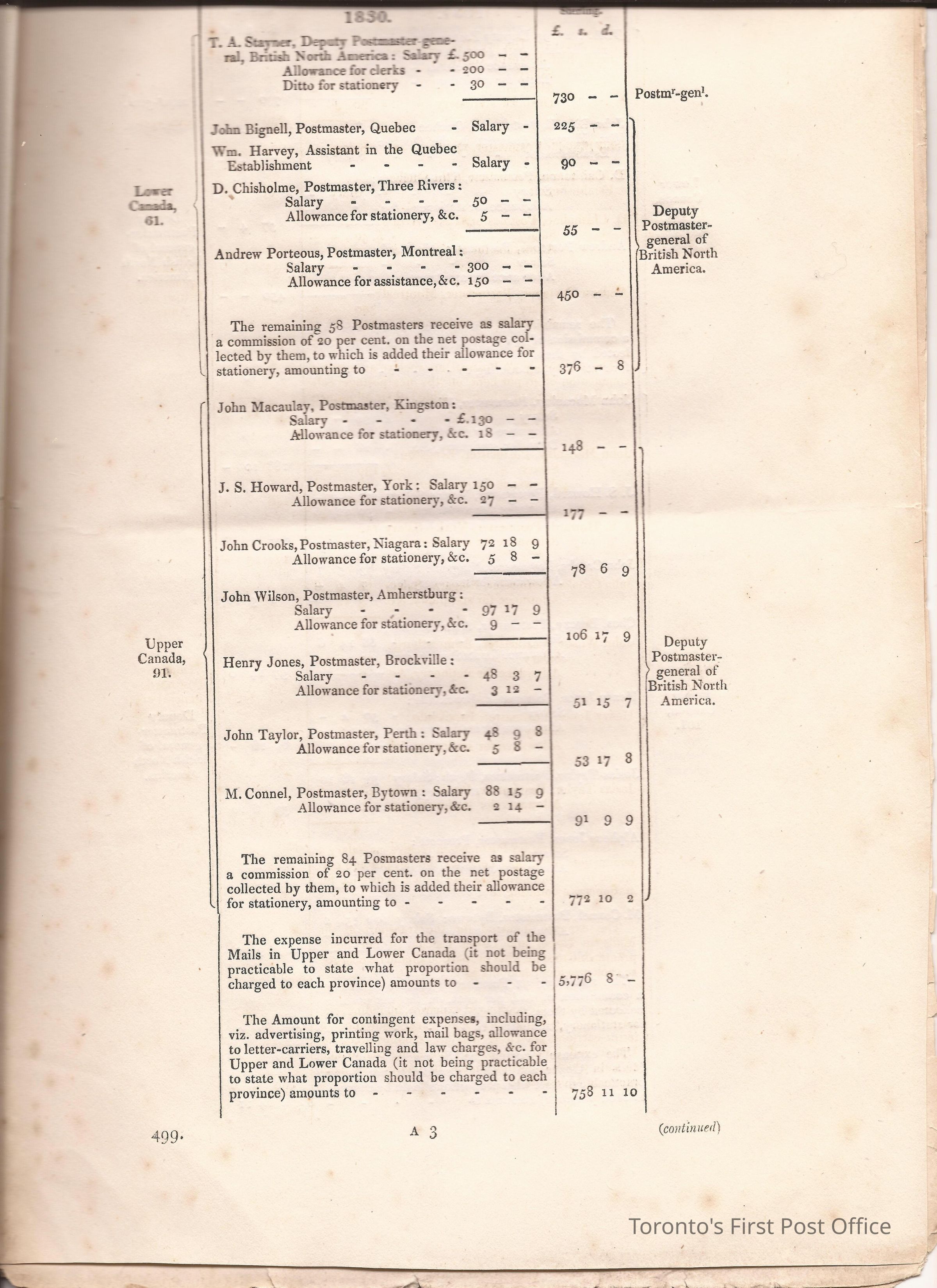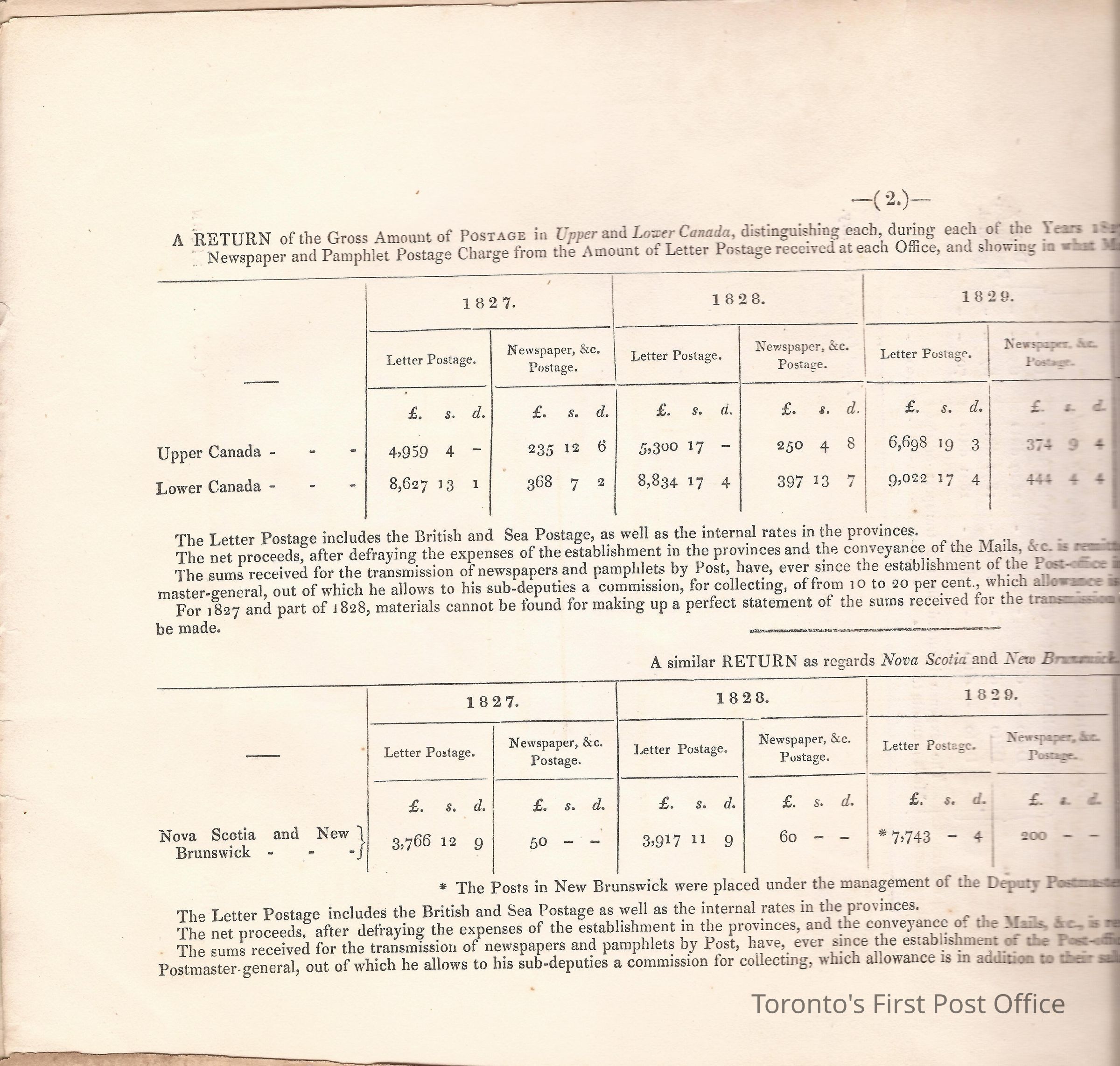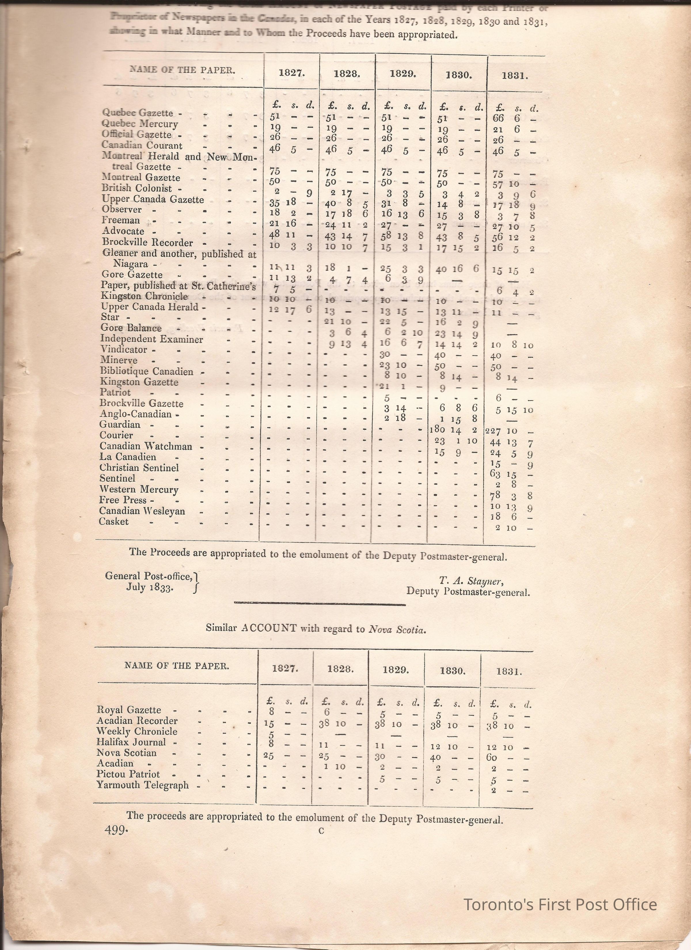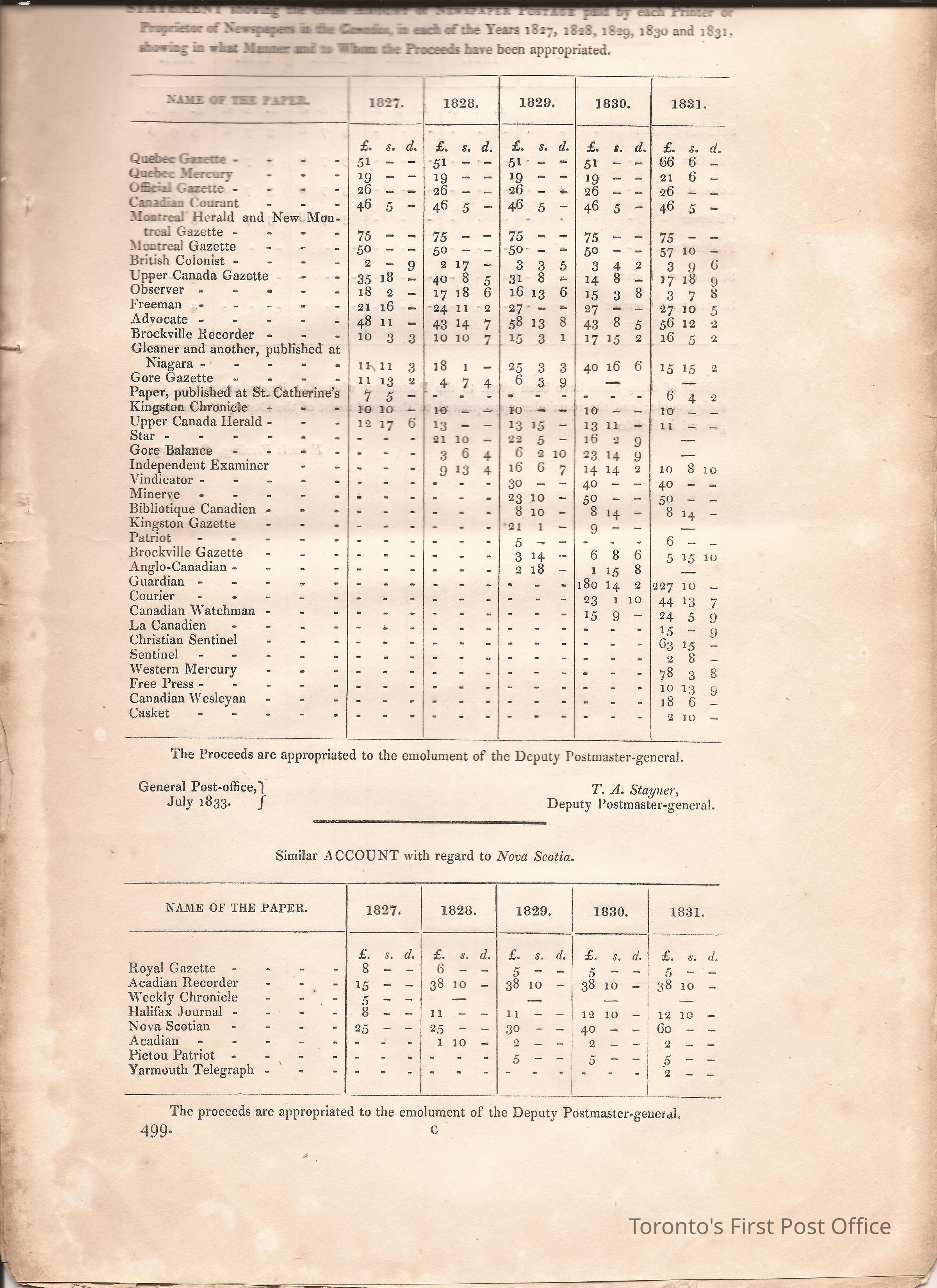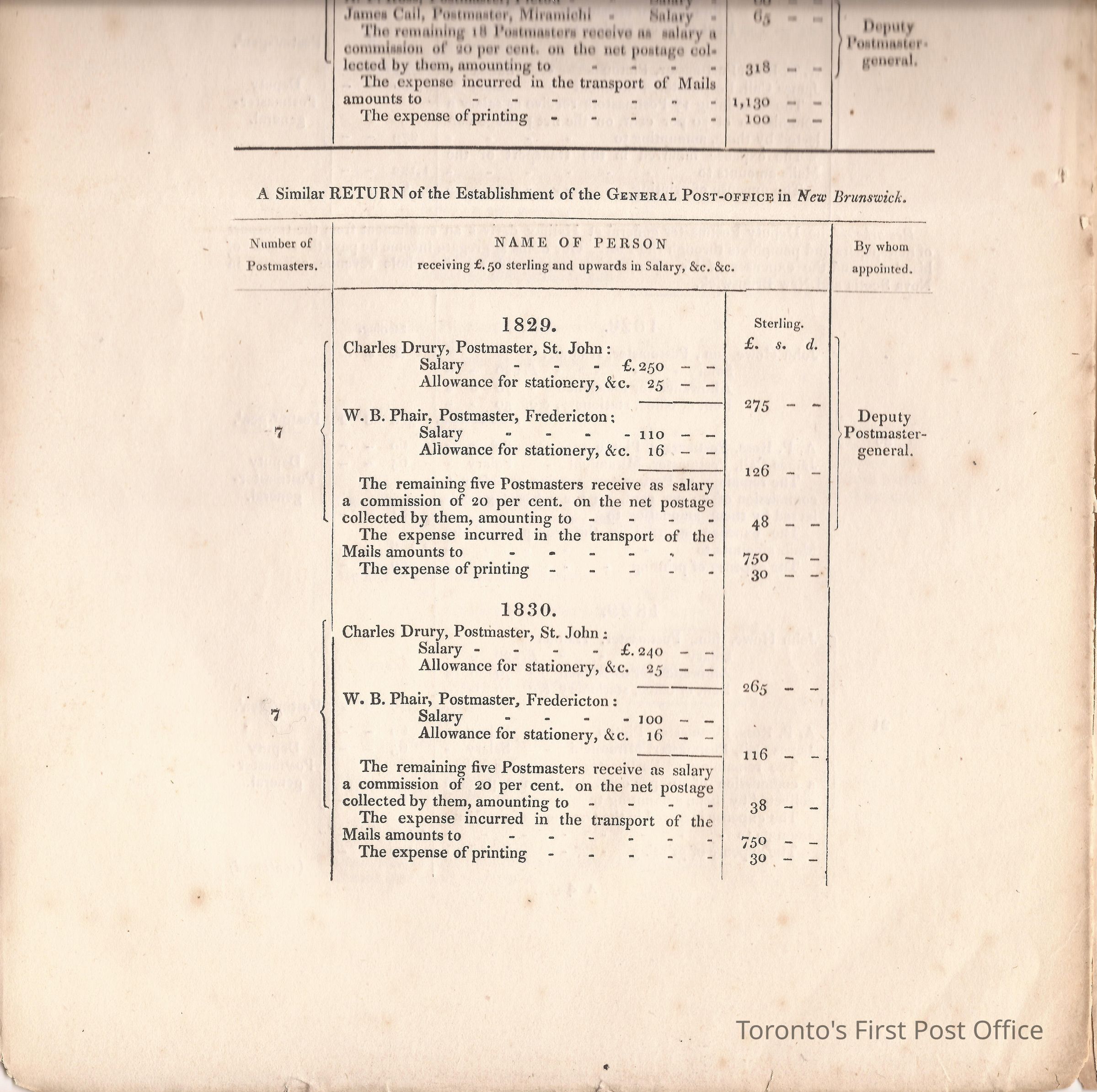Document titled: "Canada Post Office"; re: number of postmasters and deputy postmasters in each province, their salary, allowance, what other offices these persons held and similar; pages divided into four columns: number of postmasters, name of person, monies received, by whom appointed; last two pages outline postage in U.C./L.C./N.S./N.B. in 1827, 1828, 1829, 1830, and 1831 for letter and newspaper rate; 7 pp, 14 sides of print; cotton thread bound; unbleached paper.Update Date