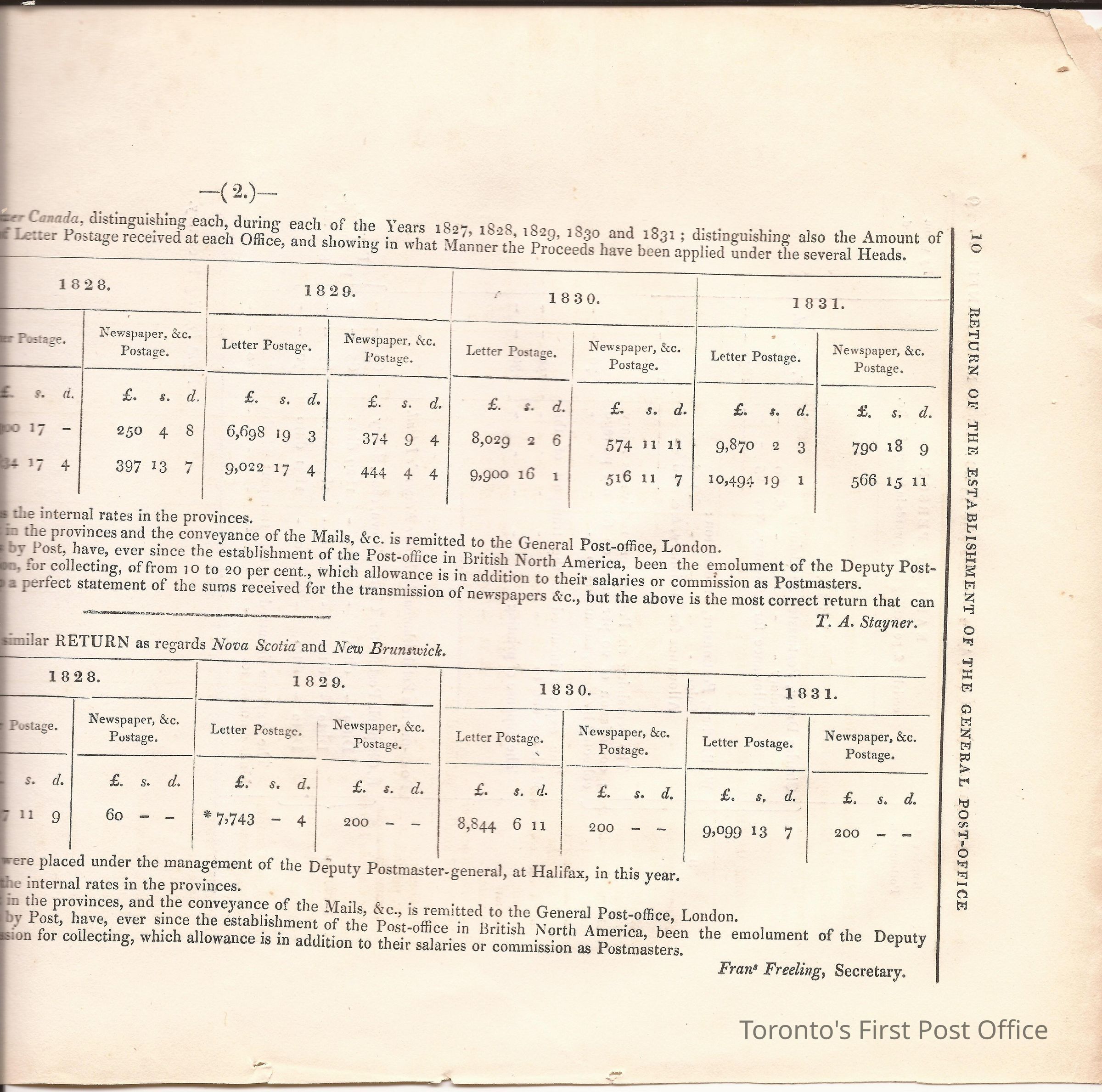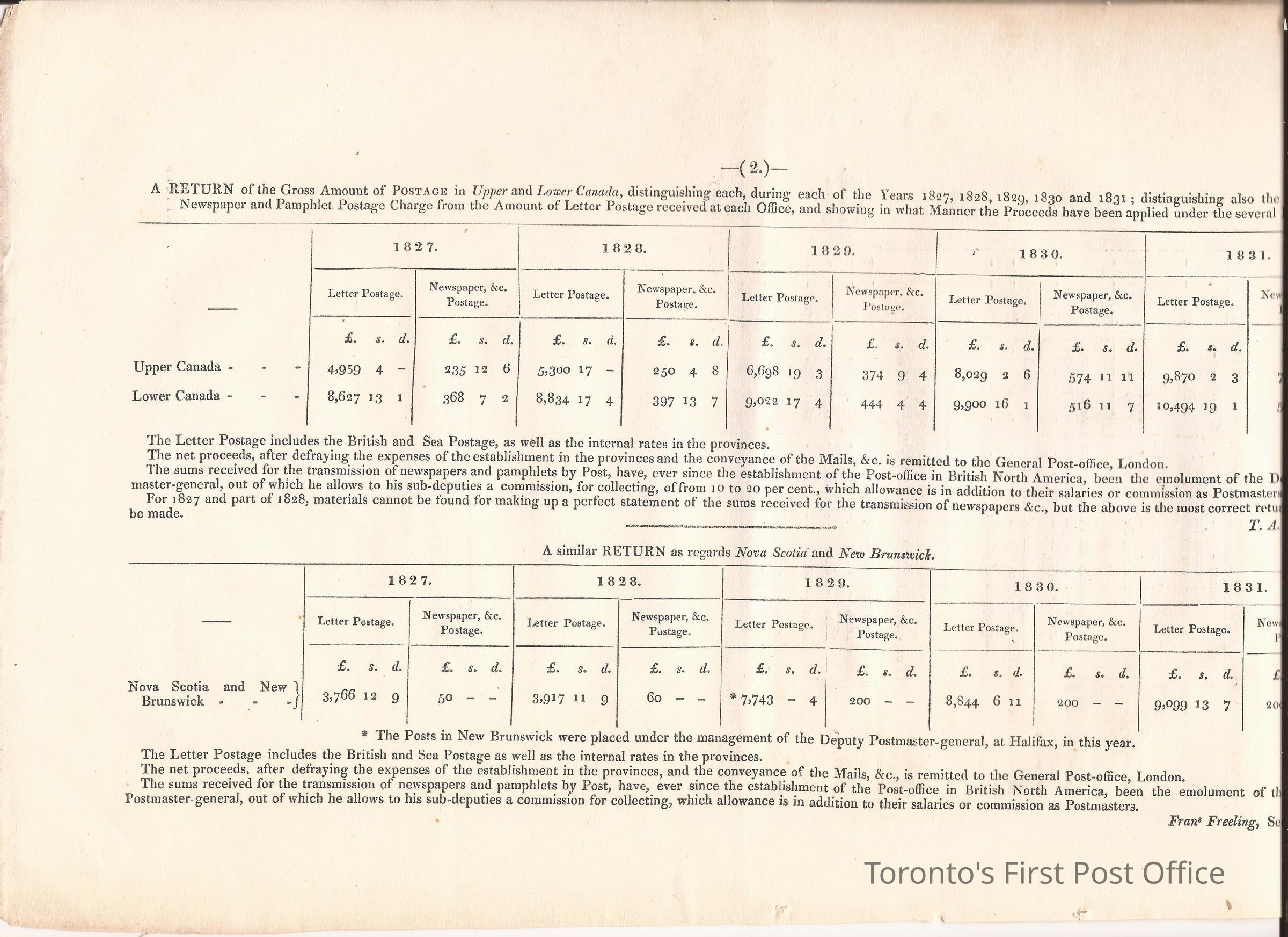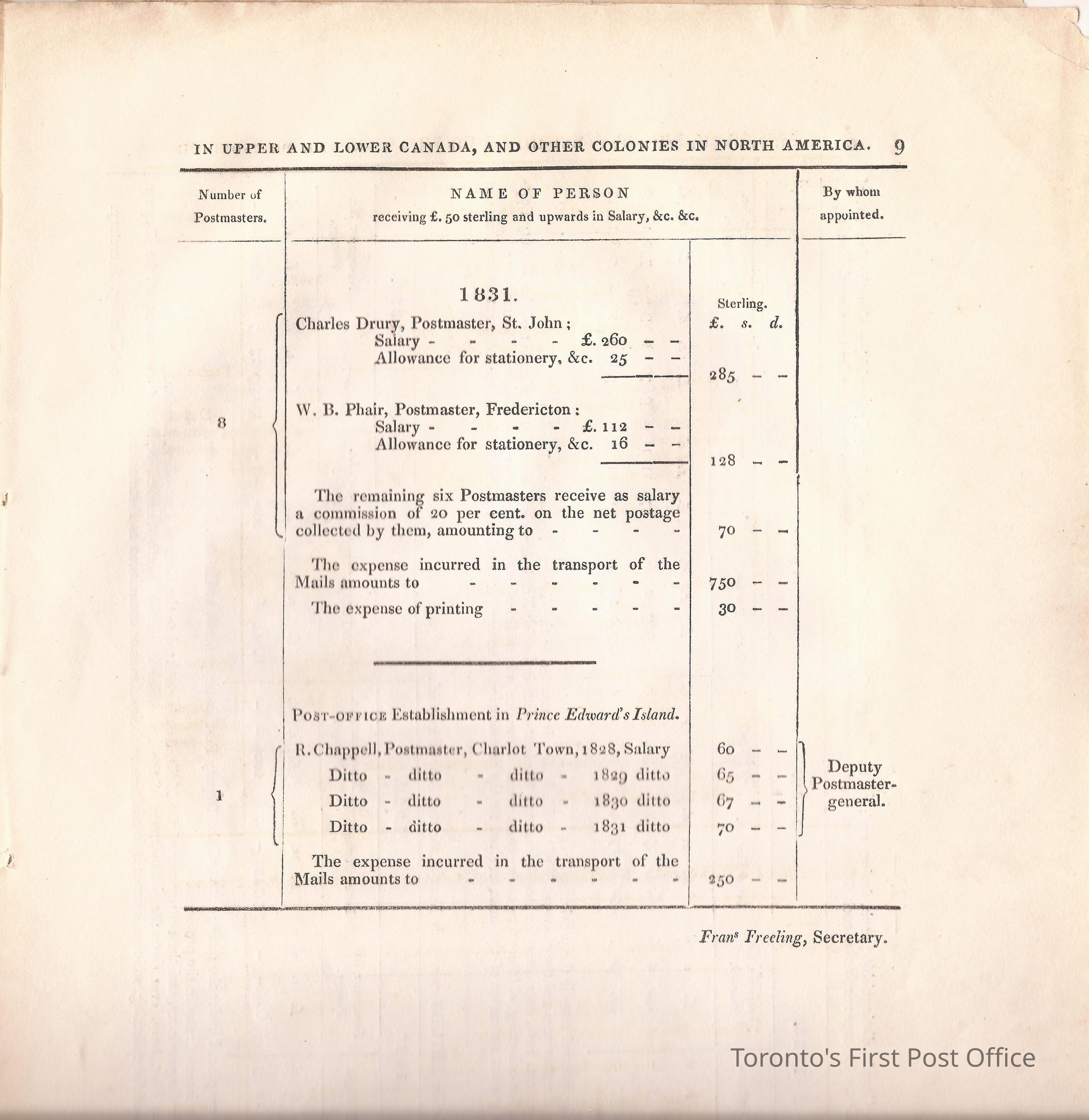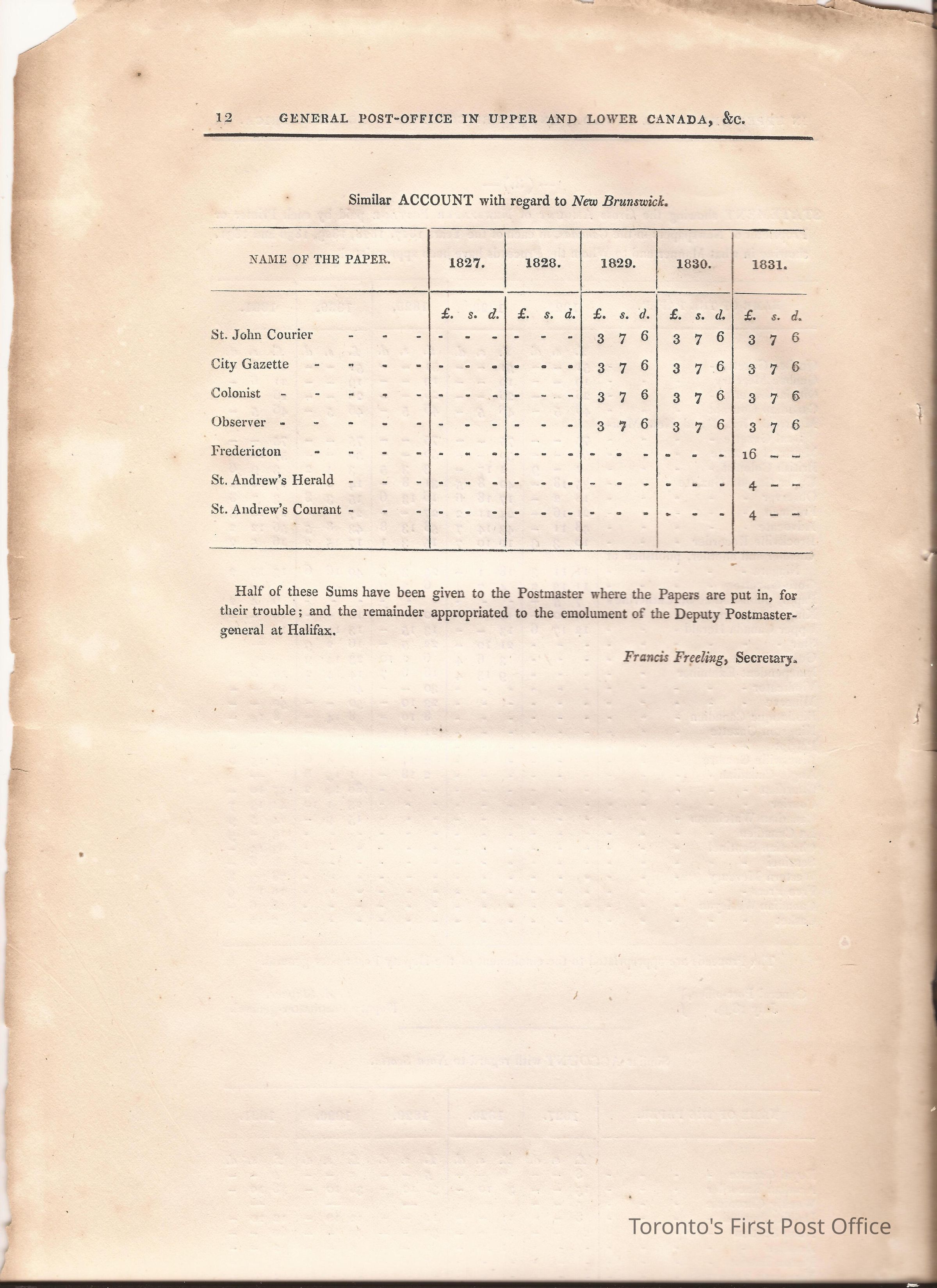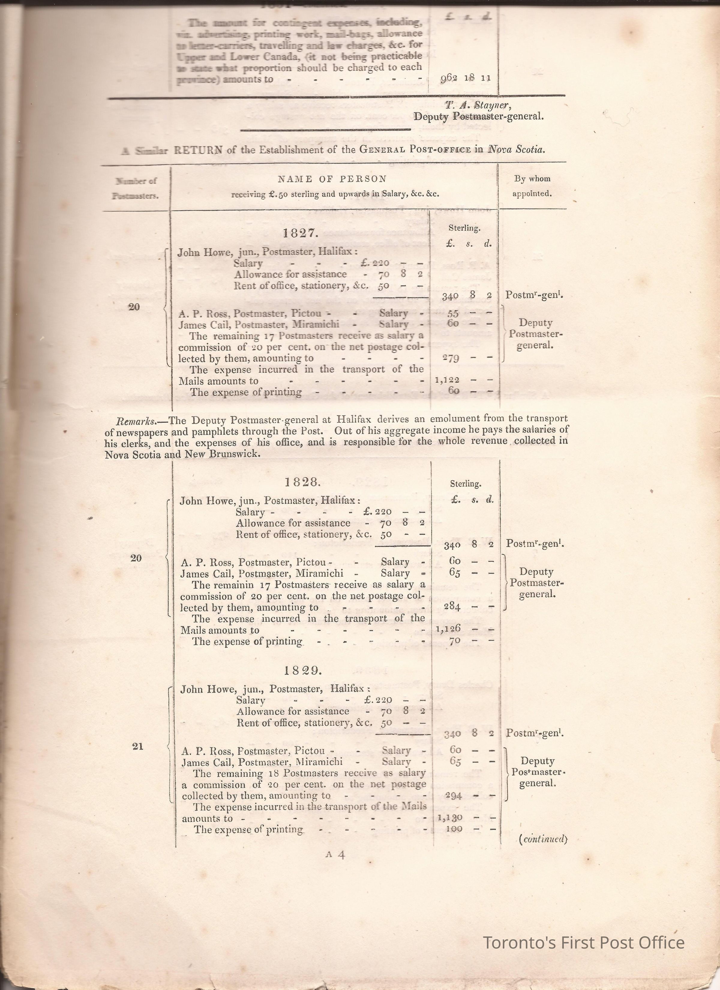 Document titled: "Canada Post Office"; re: number of postmasters and deputy postmasters in each province, their salary, allowance, what other offices these persons held and similar; pages divided into four columns: number of postmasters, name of person, monies received, by whom appointed; last two pages outline postage in U.C./L.C./N.S./N.B. in 1827, 1828, 1829, 1830, and 1831 for letter and newspaper rate; 7 pp, 14 sides of print; cotton thread bound; unbleached paper.Update Date