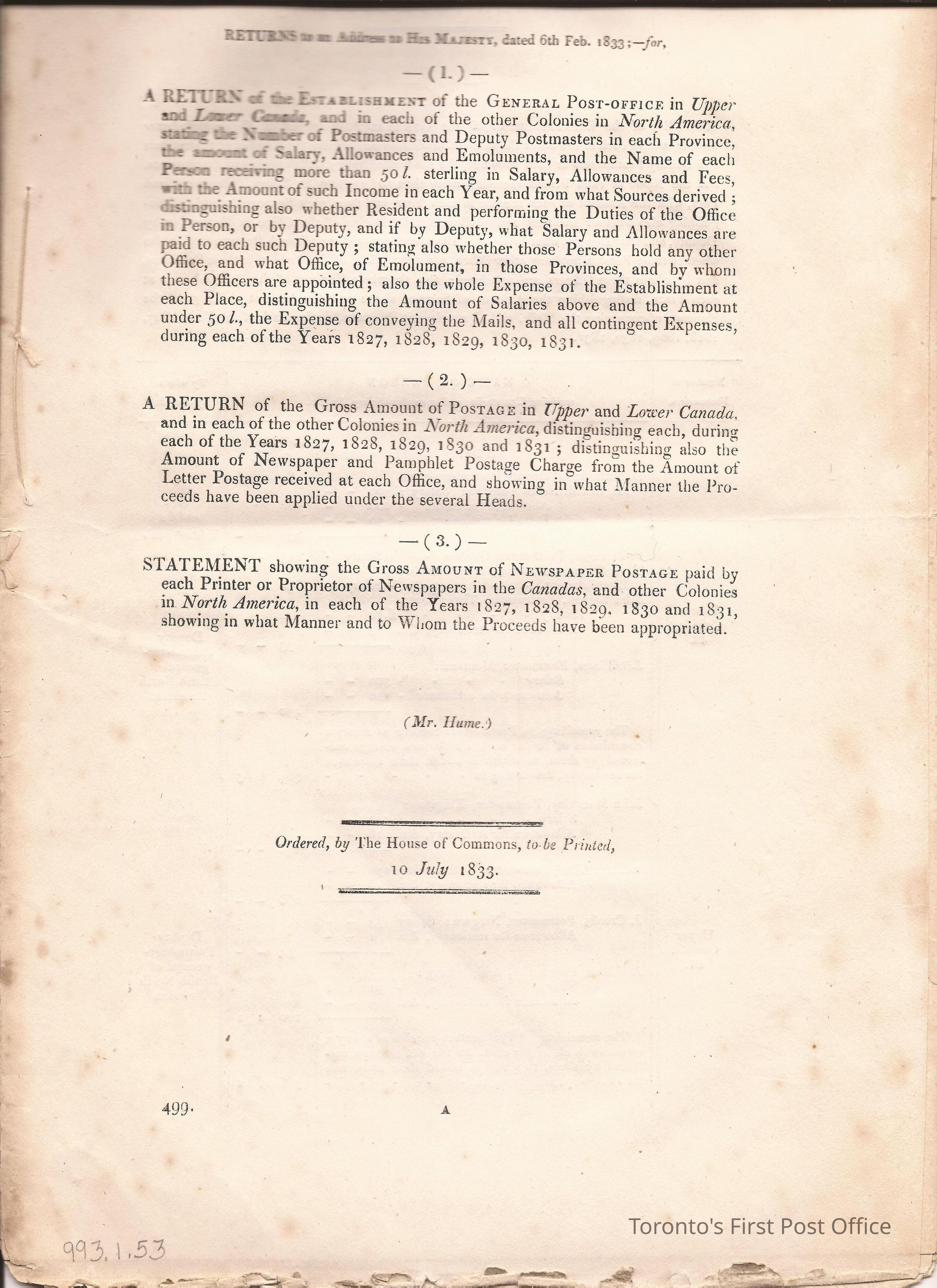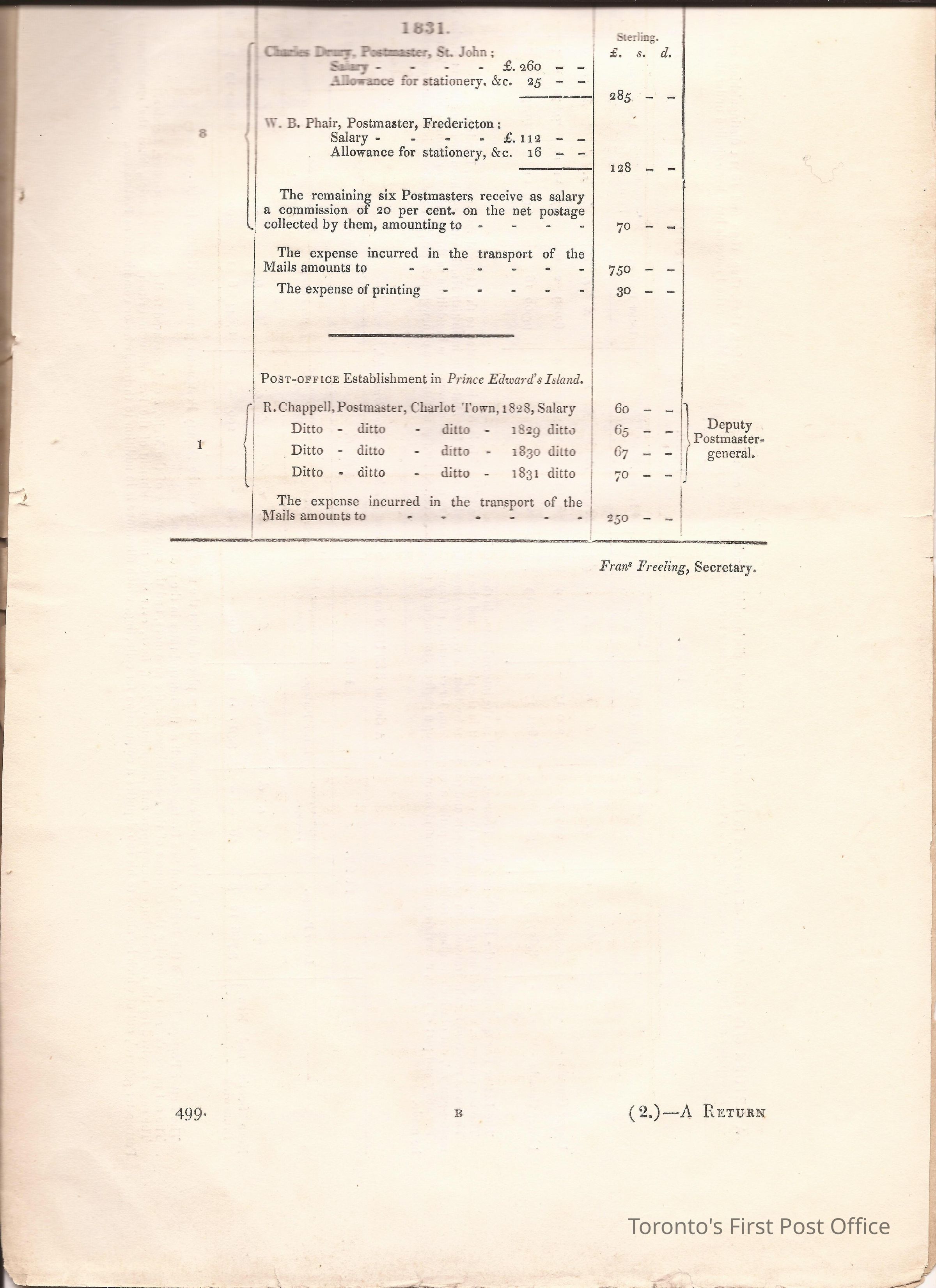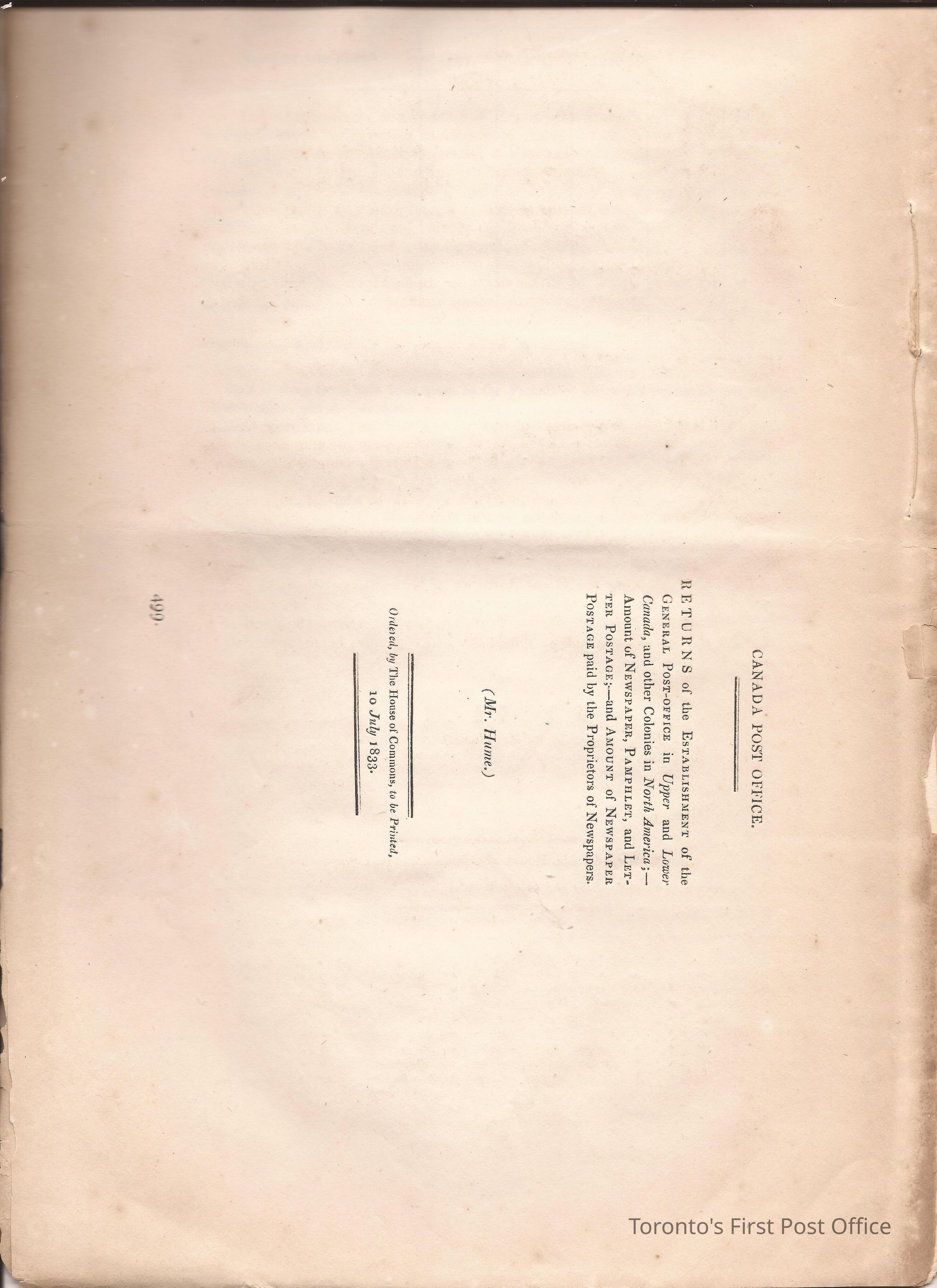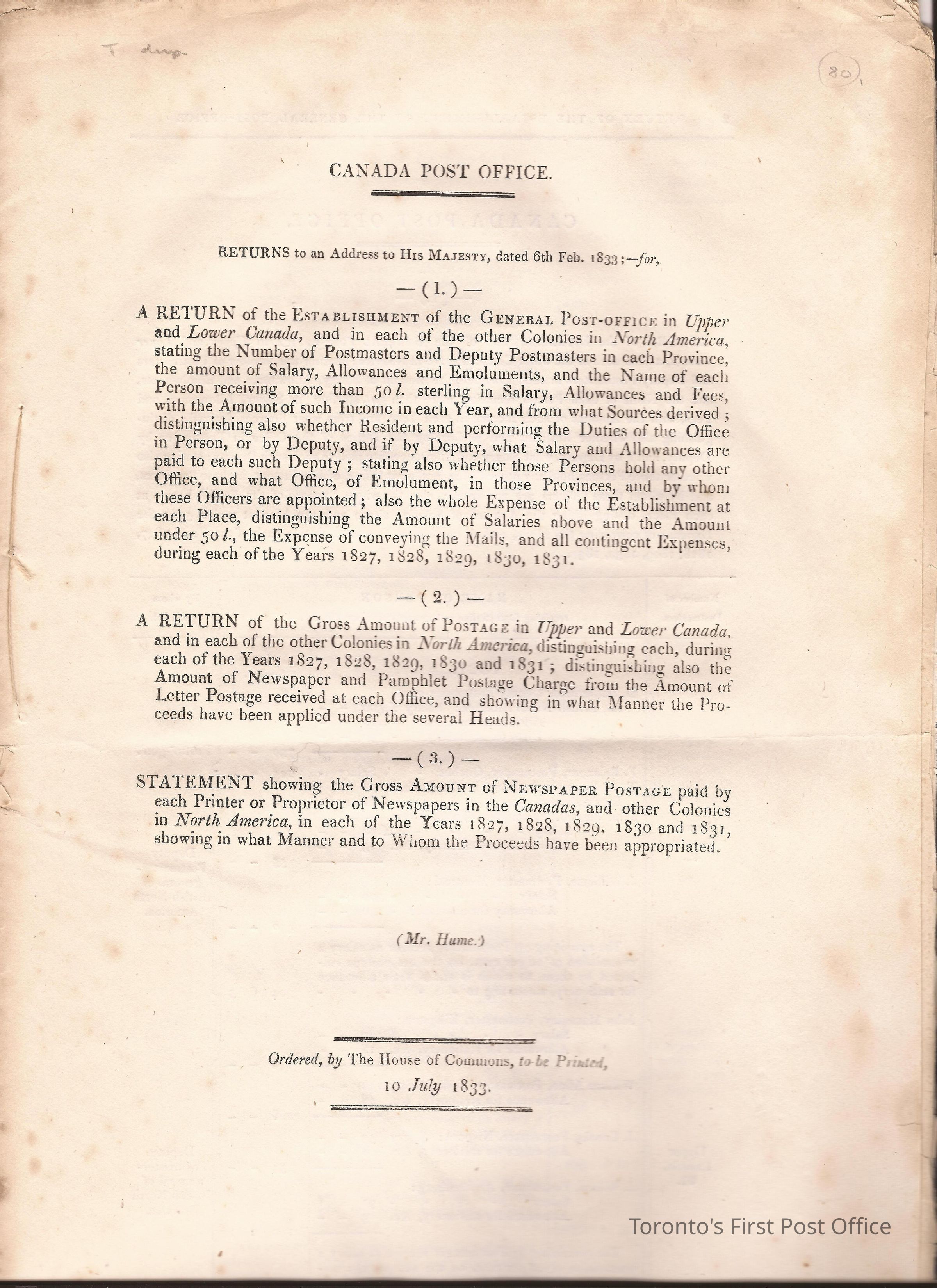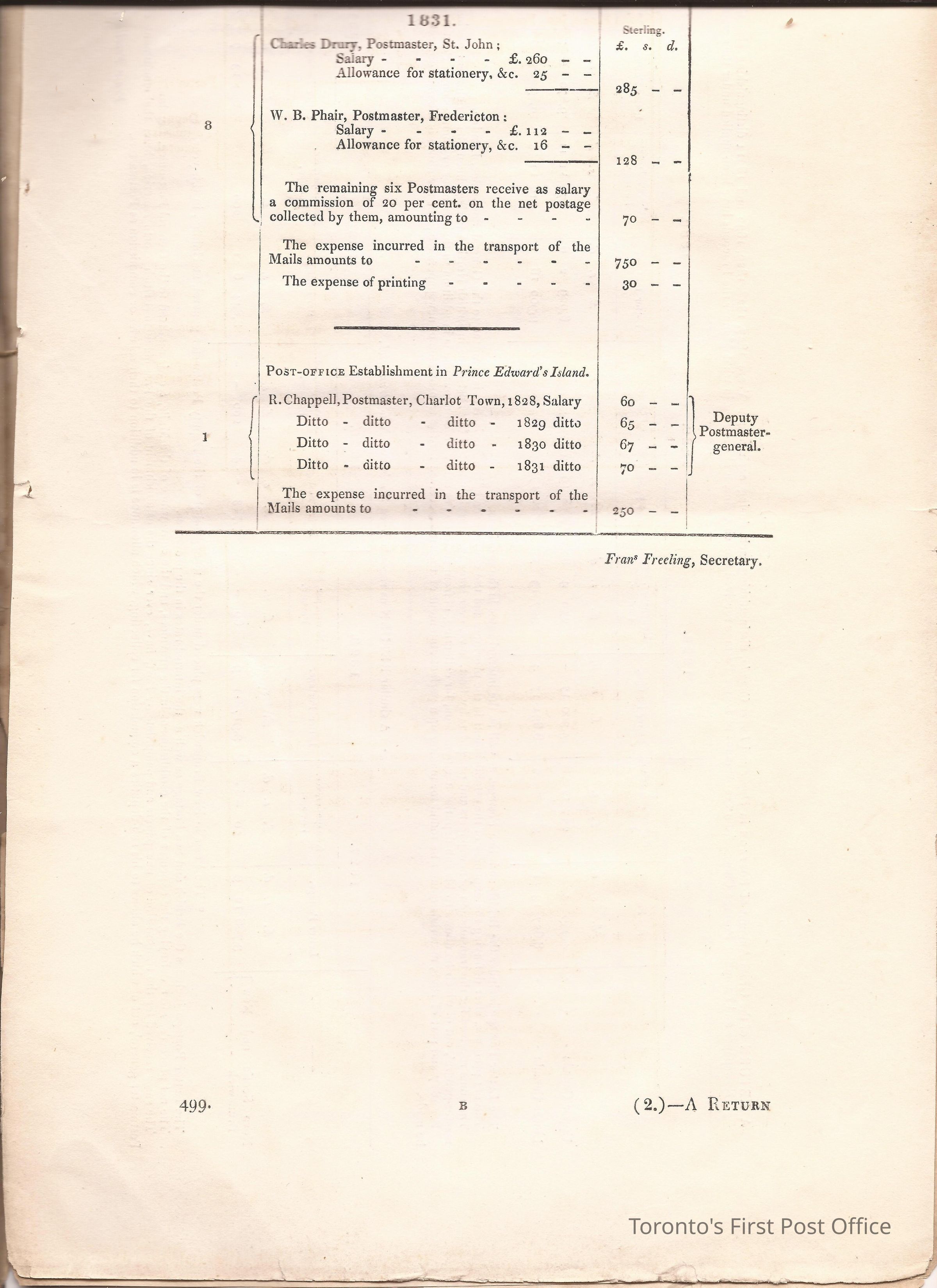 Document titled: "Canada Post Office"; re: number of postmasters and deputy postmasters in each province, their salary, allowance, what other offices these persons held and similar; pages divided into four columns: number of postmasters, name of person, monies received, by whom appointed; last two pages outline postage in U.C./L.C./N.S./N.B. in 1827, 1828, 1829, 1830, and 1831 for letter and newspaper rate; 7 pp, 14 sides of print; cotton thread bound; unbleached paper.Update Date