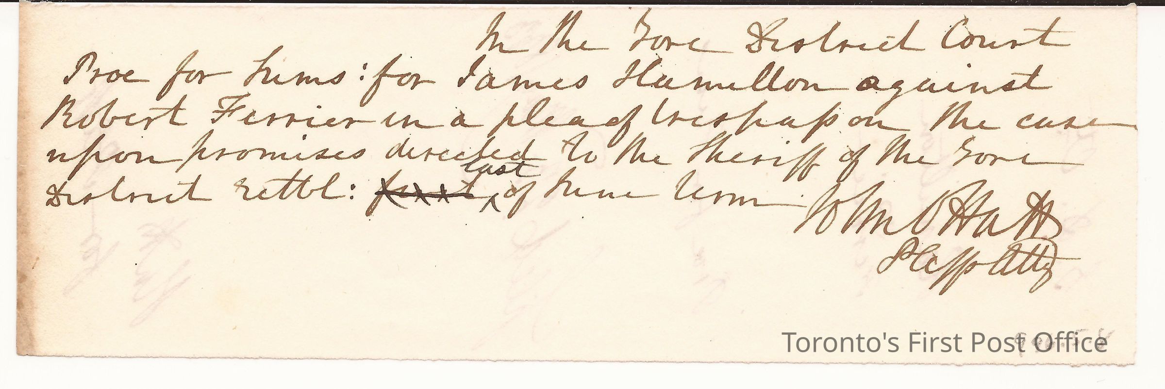Partial note; written on two sides in different direction; black ink faded to brown; dated 23 May 1833; signed by John Hatt Plff. Atty; re: Hamilton vs. Ferrier, re: trespassing; related to 996.5.6, 7.Update Date