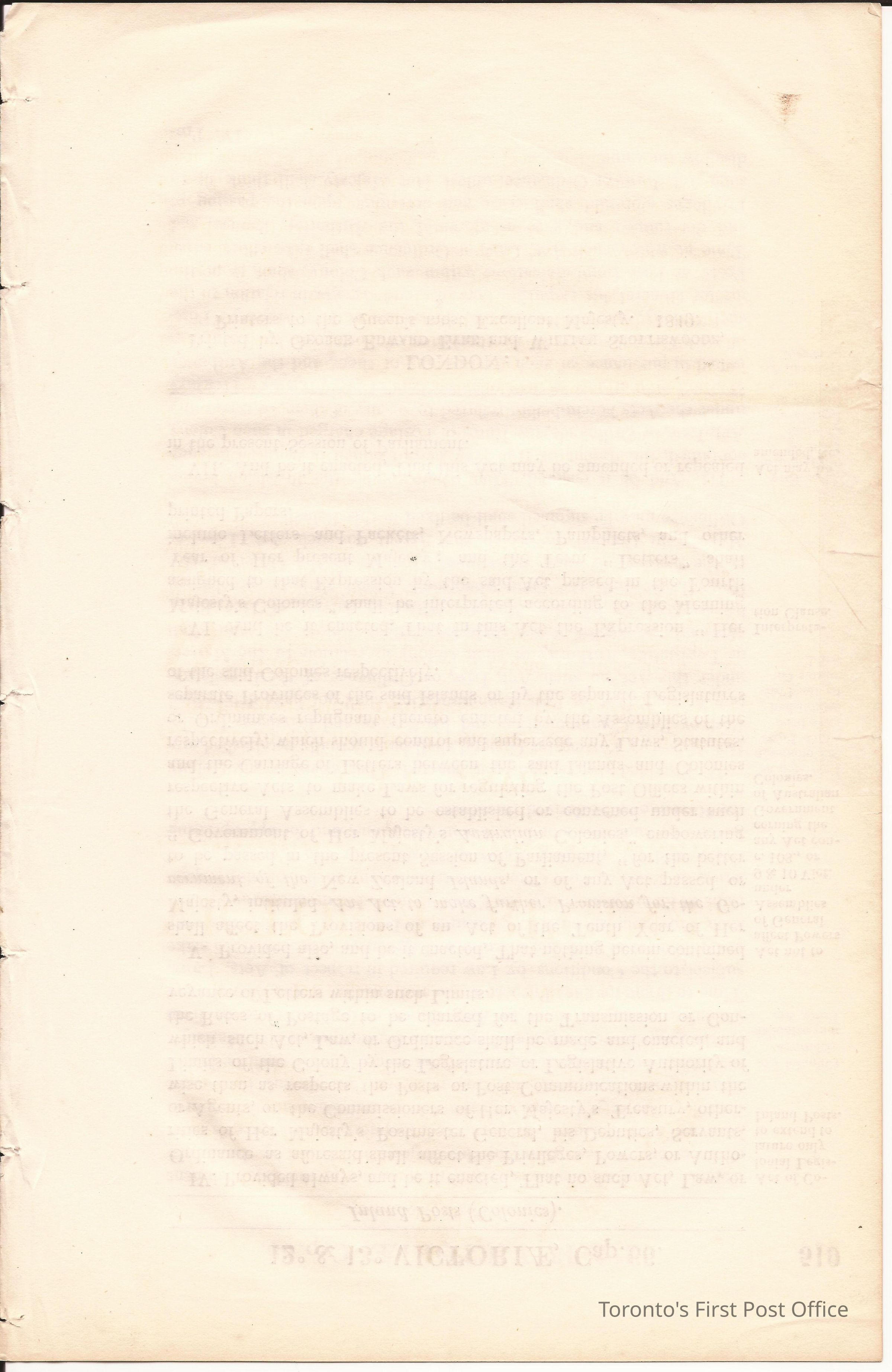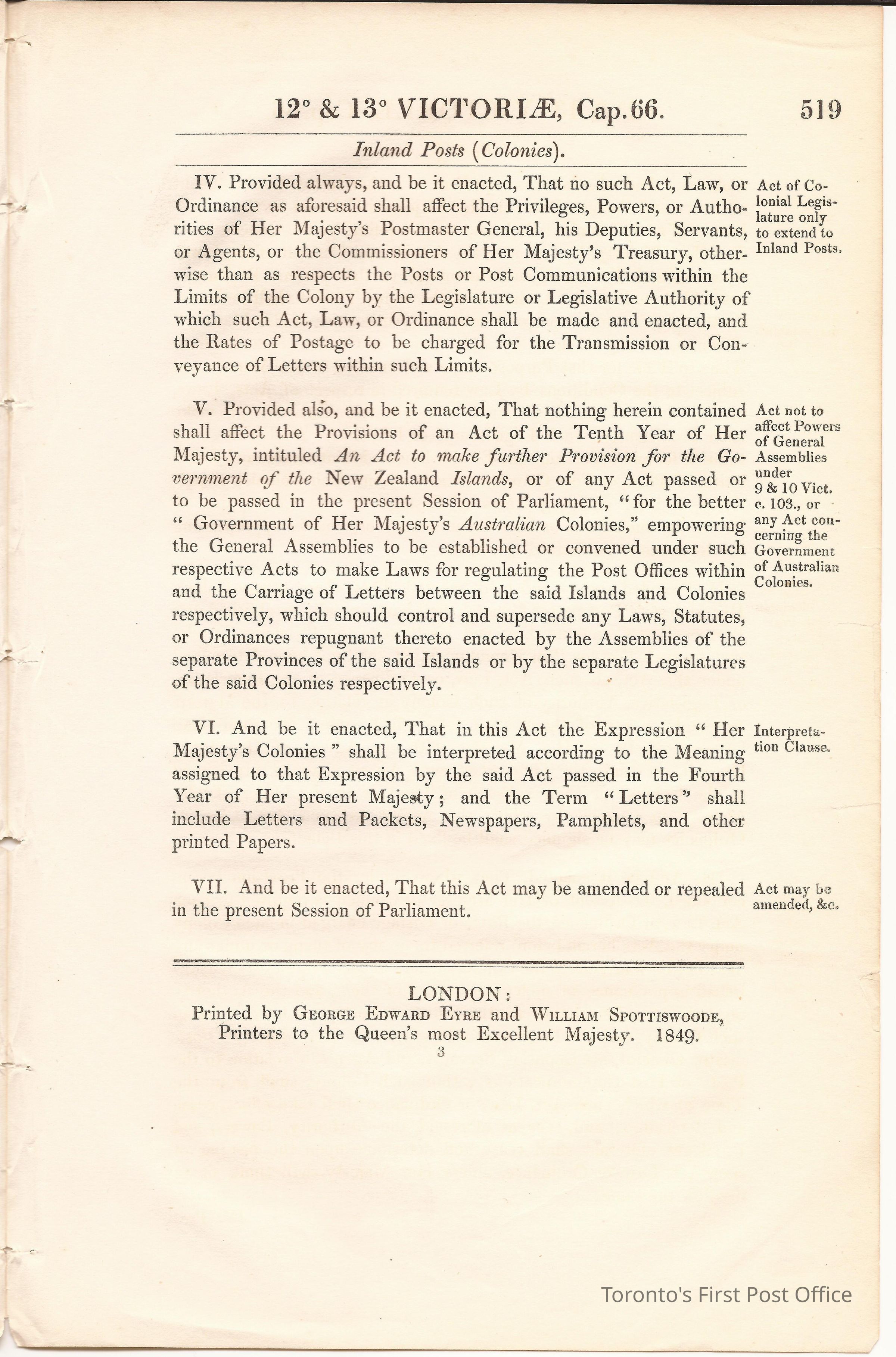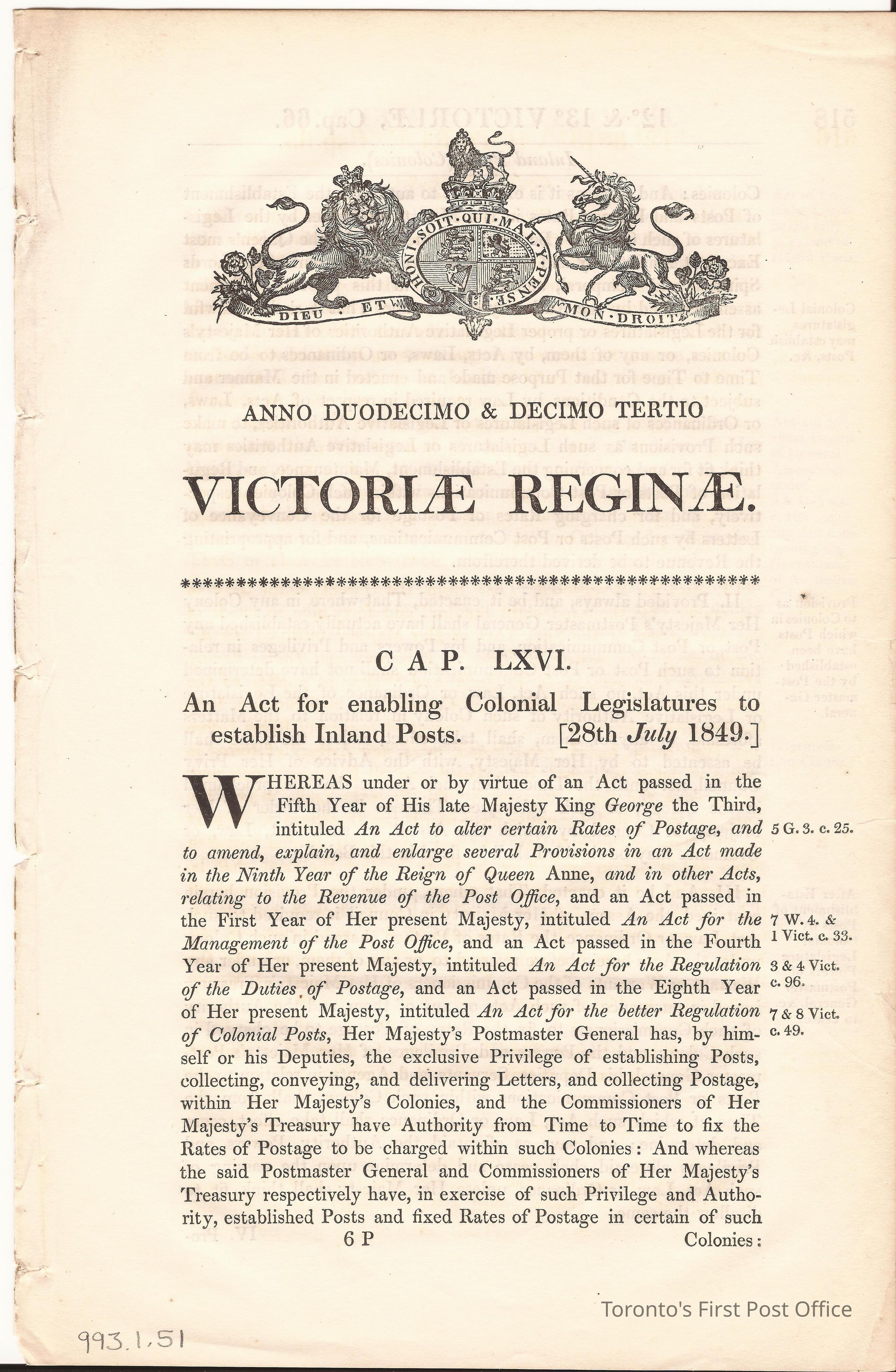 Post Office document: "ANNO DUODECIMO & DECIMO TERTIO VICTORIAE REGINAE CAP LXVI"; an act for enabling Colonial Legislatures to establish Inland Posts; dated July 28, 1849; 3 pp.; thread bound.Dimensions