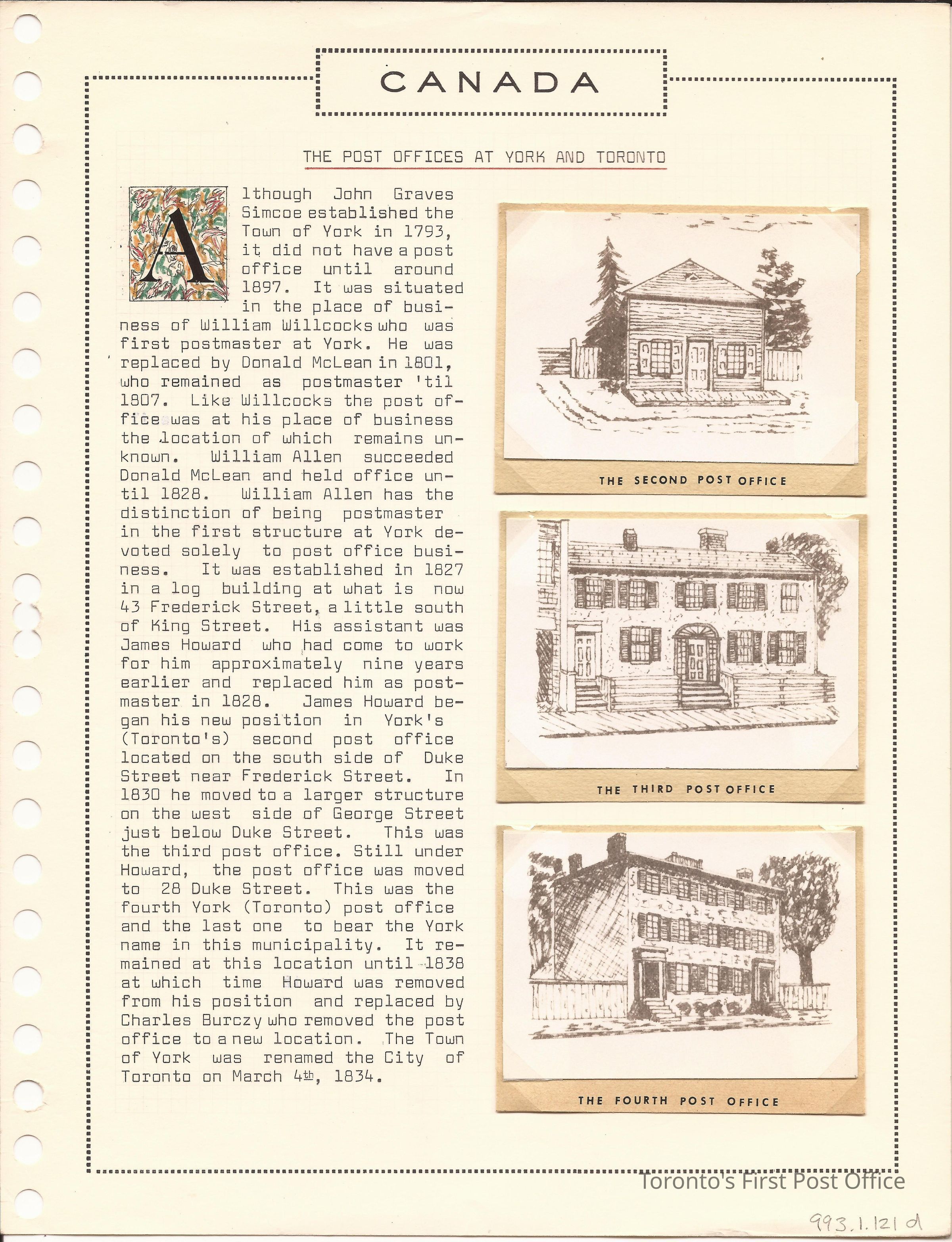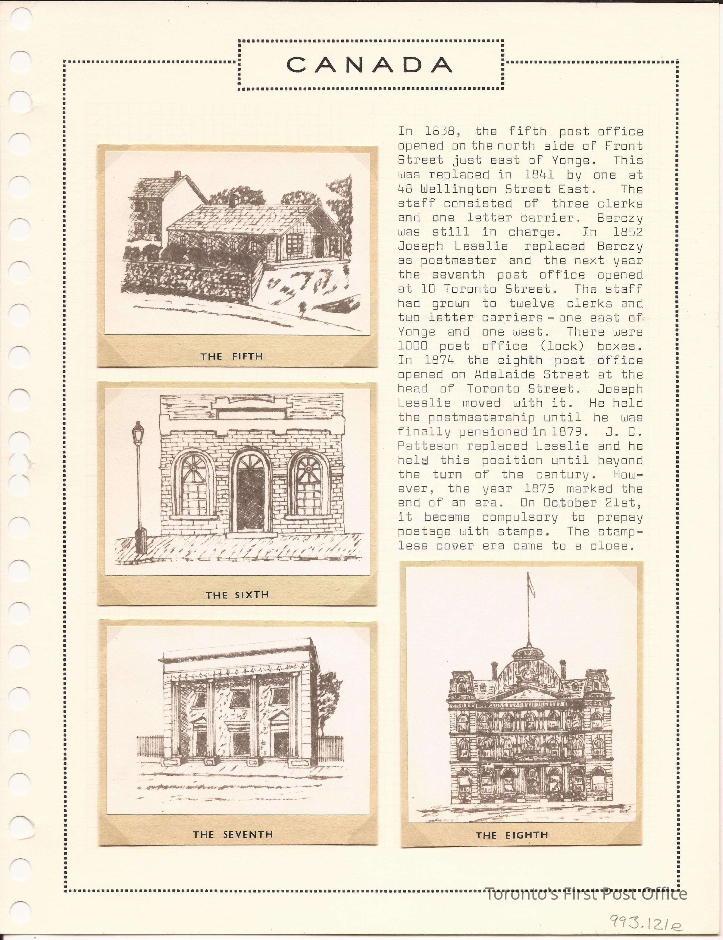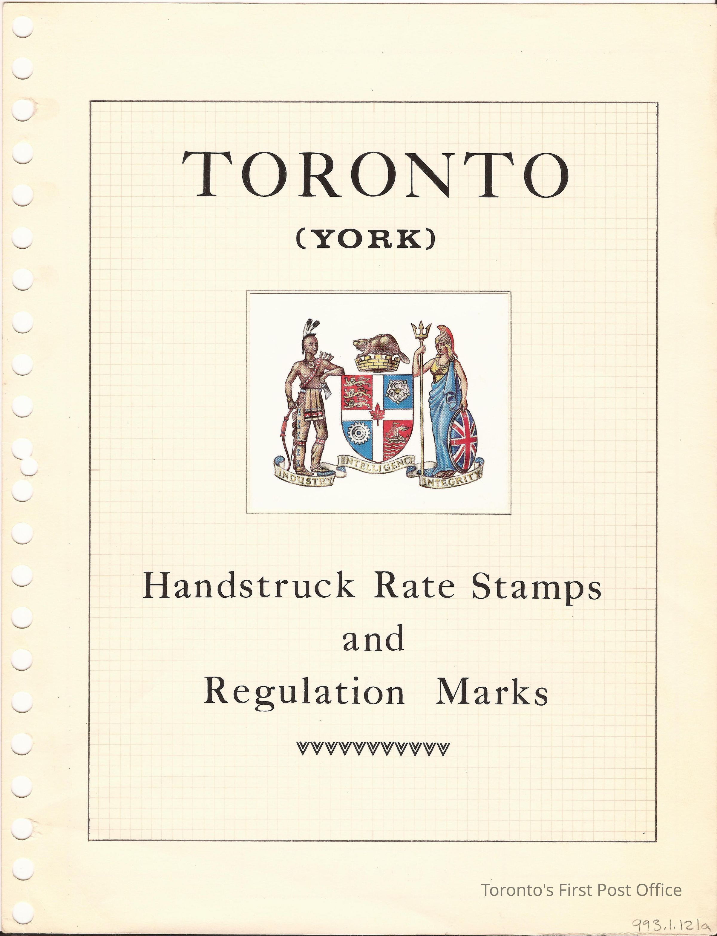 Typed notes and handdrawn illustrations on the following subjects: .1: "Toronto (York) Handstruck Rate Stamps and Regulation Marks", grid paper; .2: "Upper Canada Post Offices Named York and Toronto", map and description of post office; .3: "Postage Rates (Letters) - 1771 to 1875"; .4, .5: "The Post Offices at York and Toronto depicting 2nd, 3rd, 4th, 5th, 6th, 7th, and 8th post office buildings"; all from the Fred Stulberg Philatelic Collection, Toronto.Dimensions
