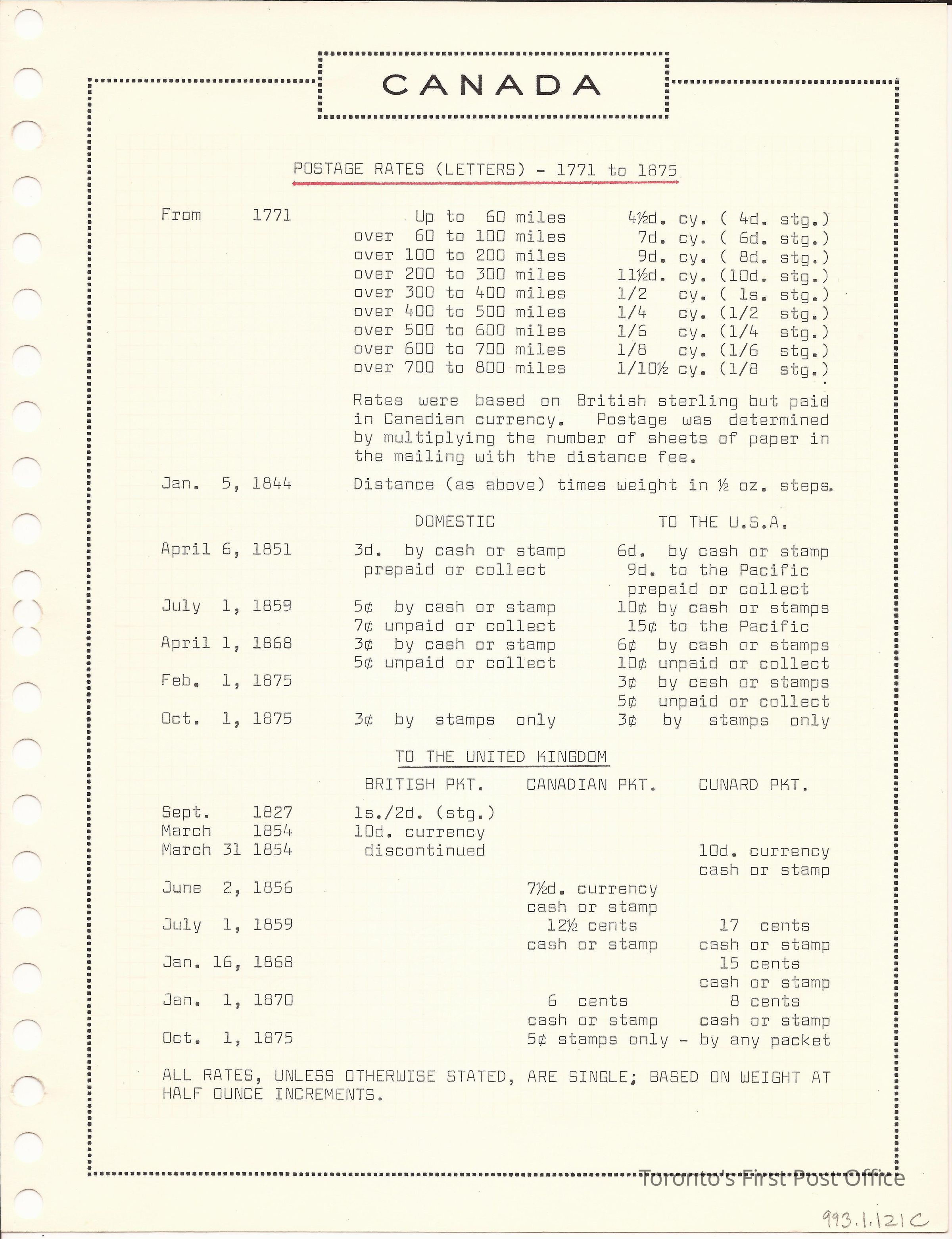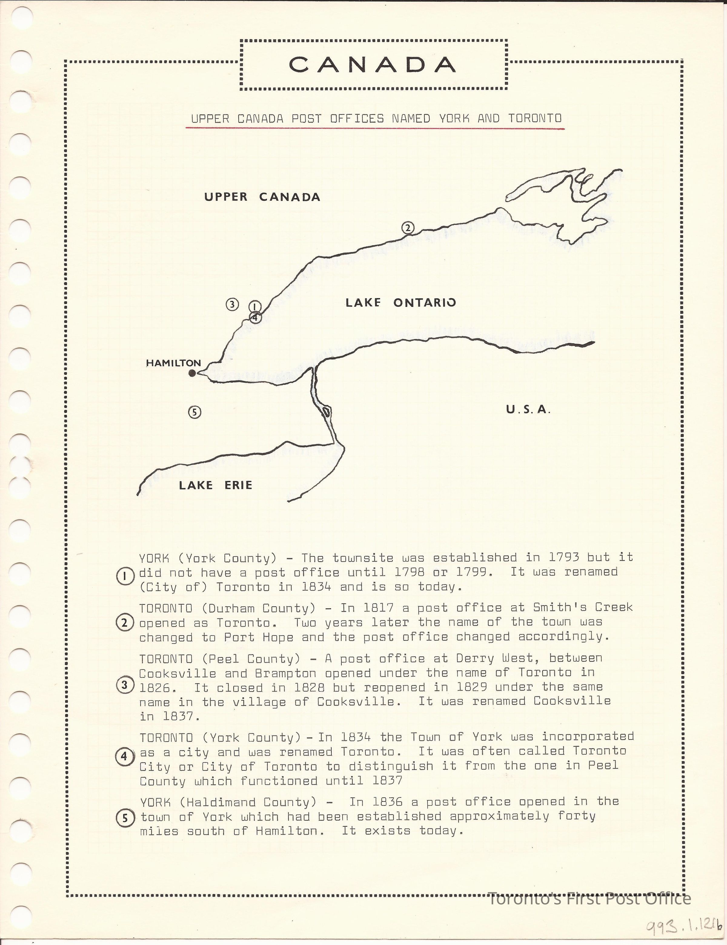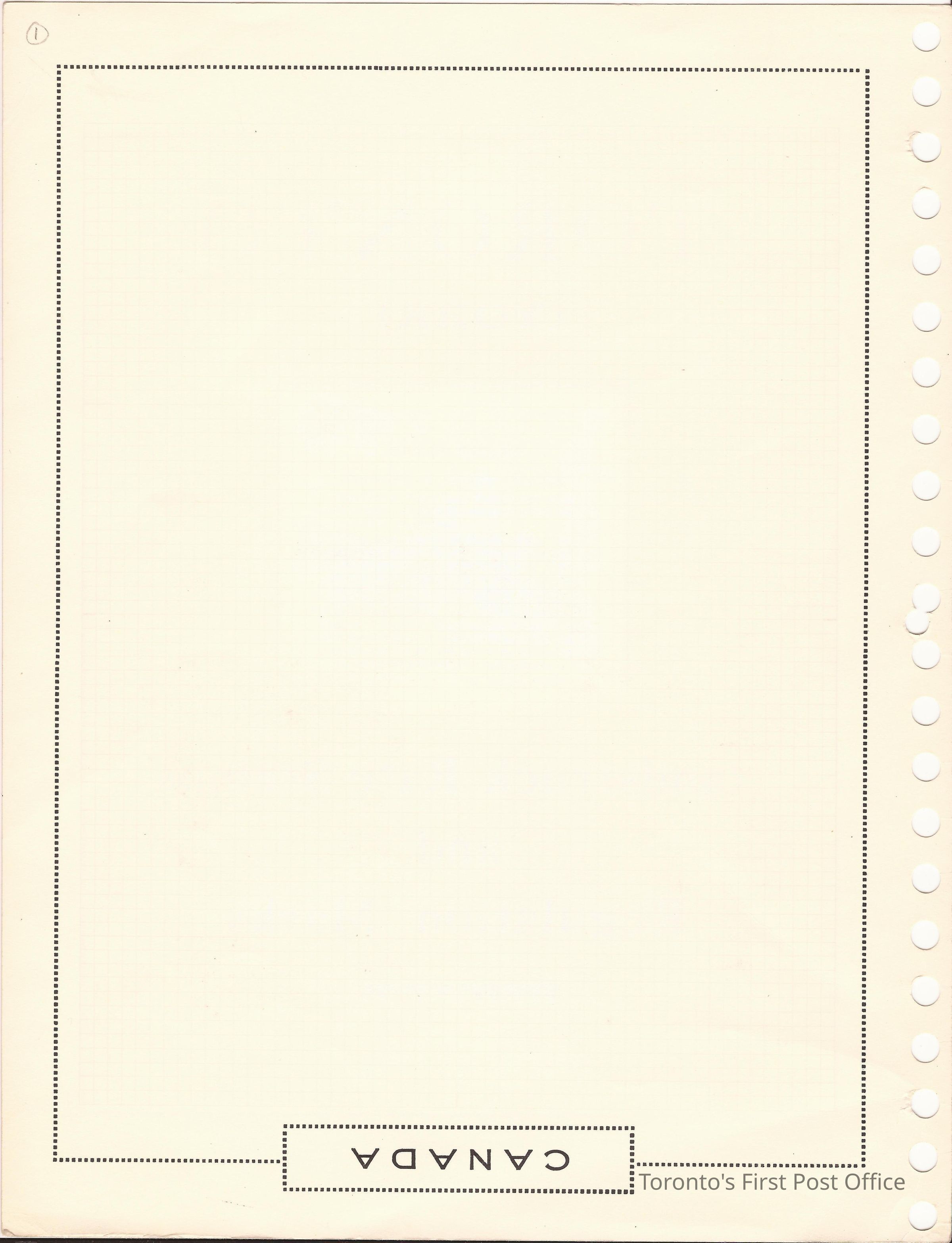 Typed notes and handdrawn illustrations on the following subjects: .1: "Toronto (York) Handstruck Rate Stamps and Regulation Marks", grid paper; .2: "Upper Canada Post Offices Named York and Toronto", map and description of post office; .3: "Postage Rates (Letters) - 1771 to 1875"; .4, .5: "The Post Offices at York and Toronto depicting 2nd, 3rd, 4th, 5th, 6th, 7th, and 8th post office buildings"; all from the Fred Stulberg Philatelic Collection, Toronto.Dimensions