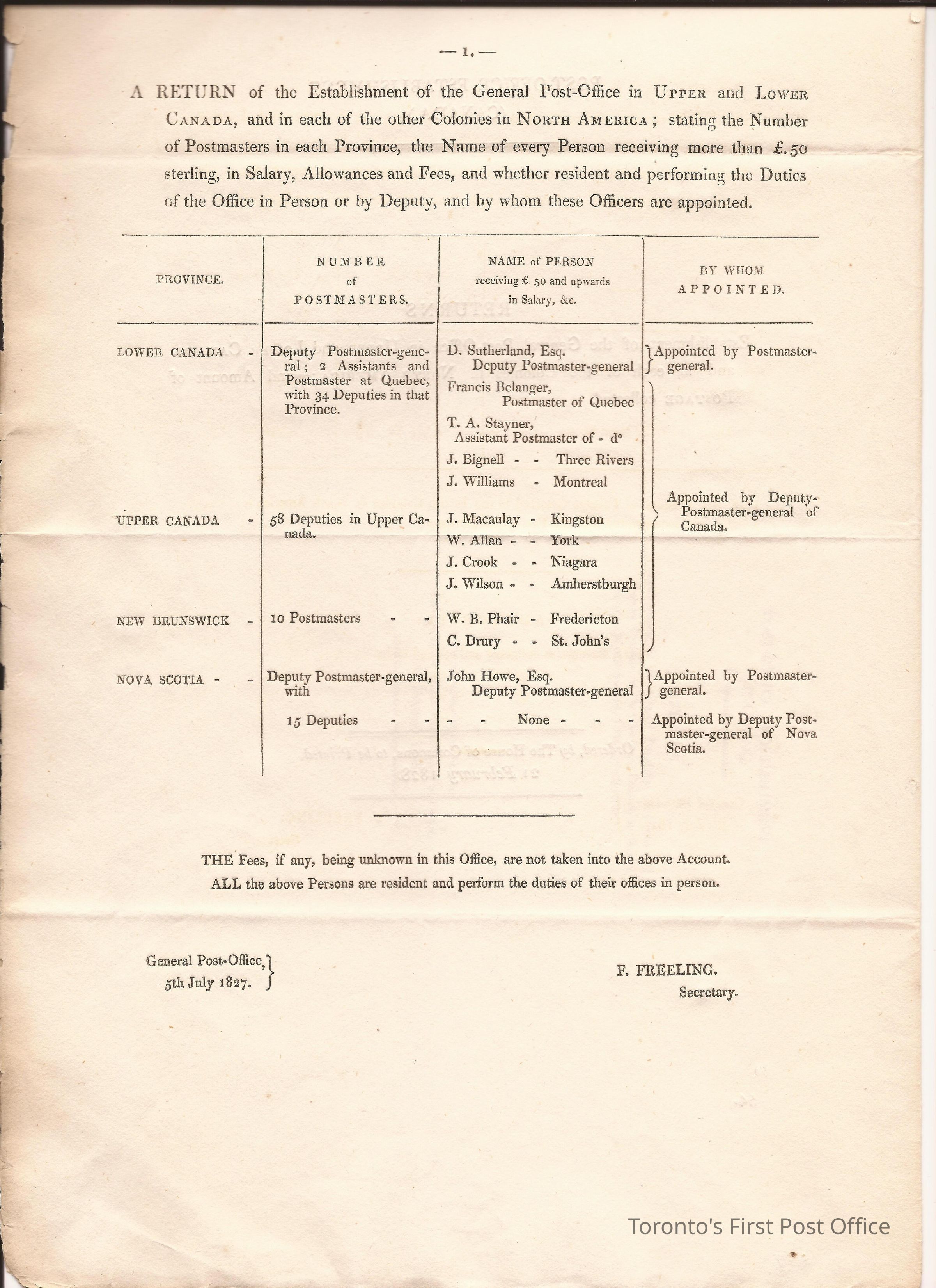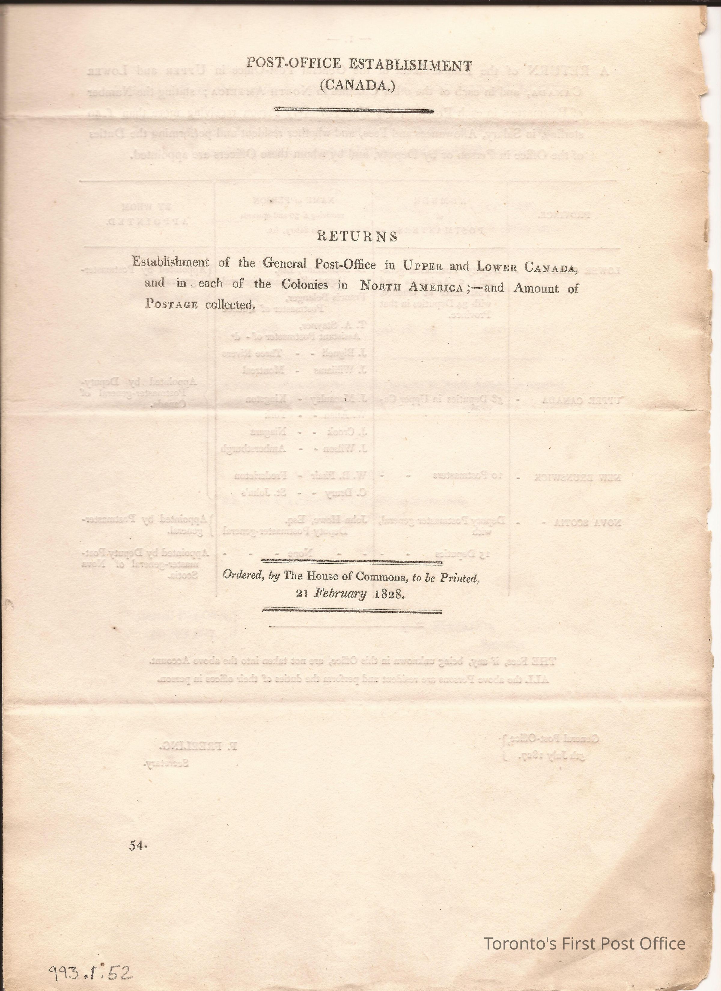Document titled: "Post-Office Establishment (Canada) Returns - Establishment of the General Post Office in Upper and Lower Canada, and in each of the Colonies in North America; and the Amount of Postage collected"; dated 21 February 1828.Dimensions