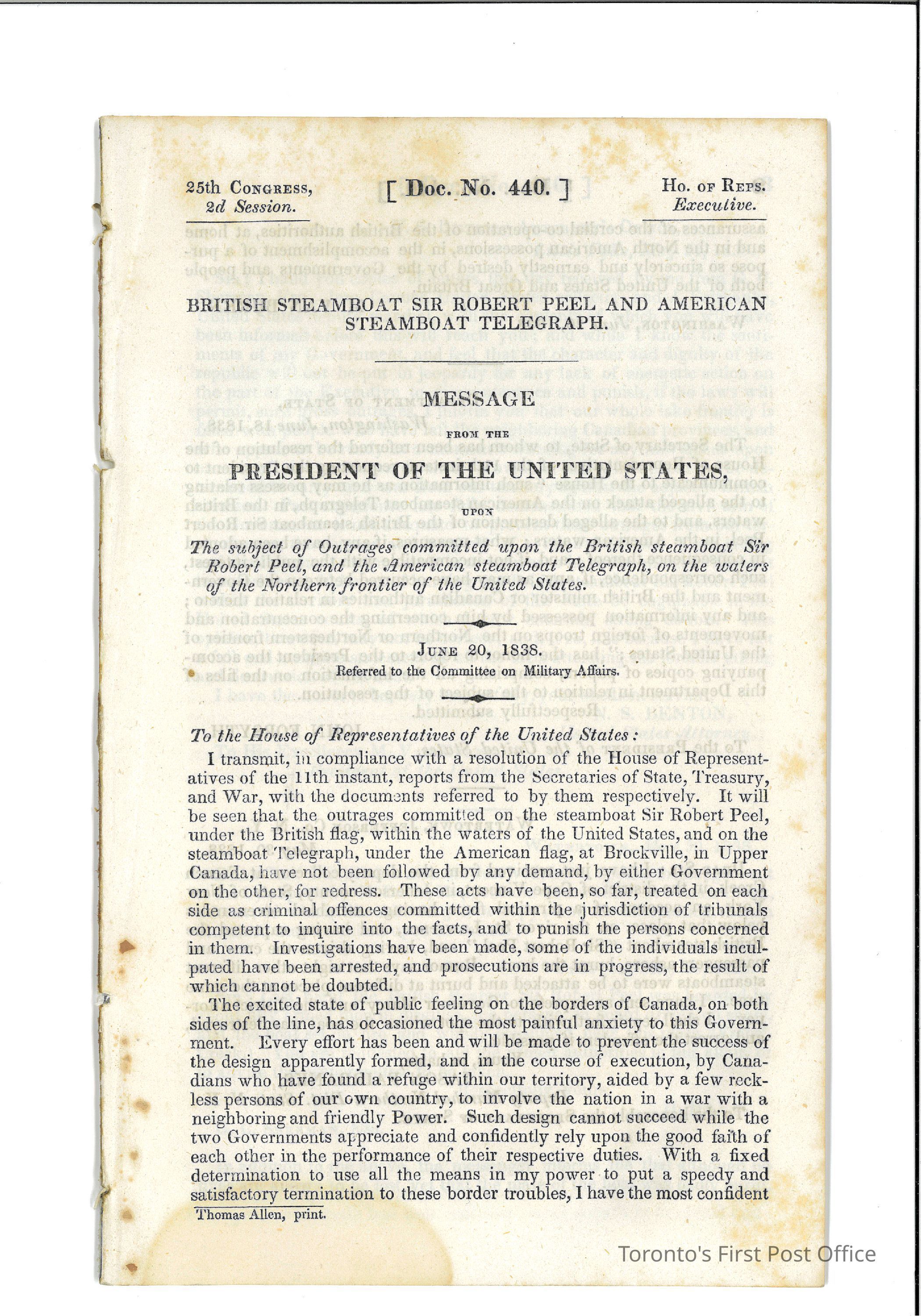 Section of a printed booklet, disbound, black ink on white paper. Titled "British Steamboat Sir Robert Peel and American Steamboat Telegraph/ message/ from the/ President of the United States,/ upon/ the subject of outrages committed upon the British steamboat Sir Robert Peel, and the American steamboat Telegraph, on the Waters of the northern frontier of the United States".Update Date