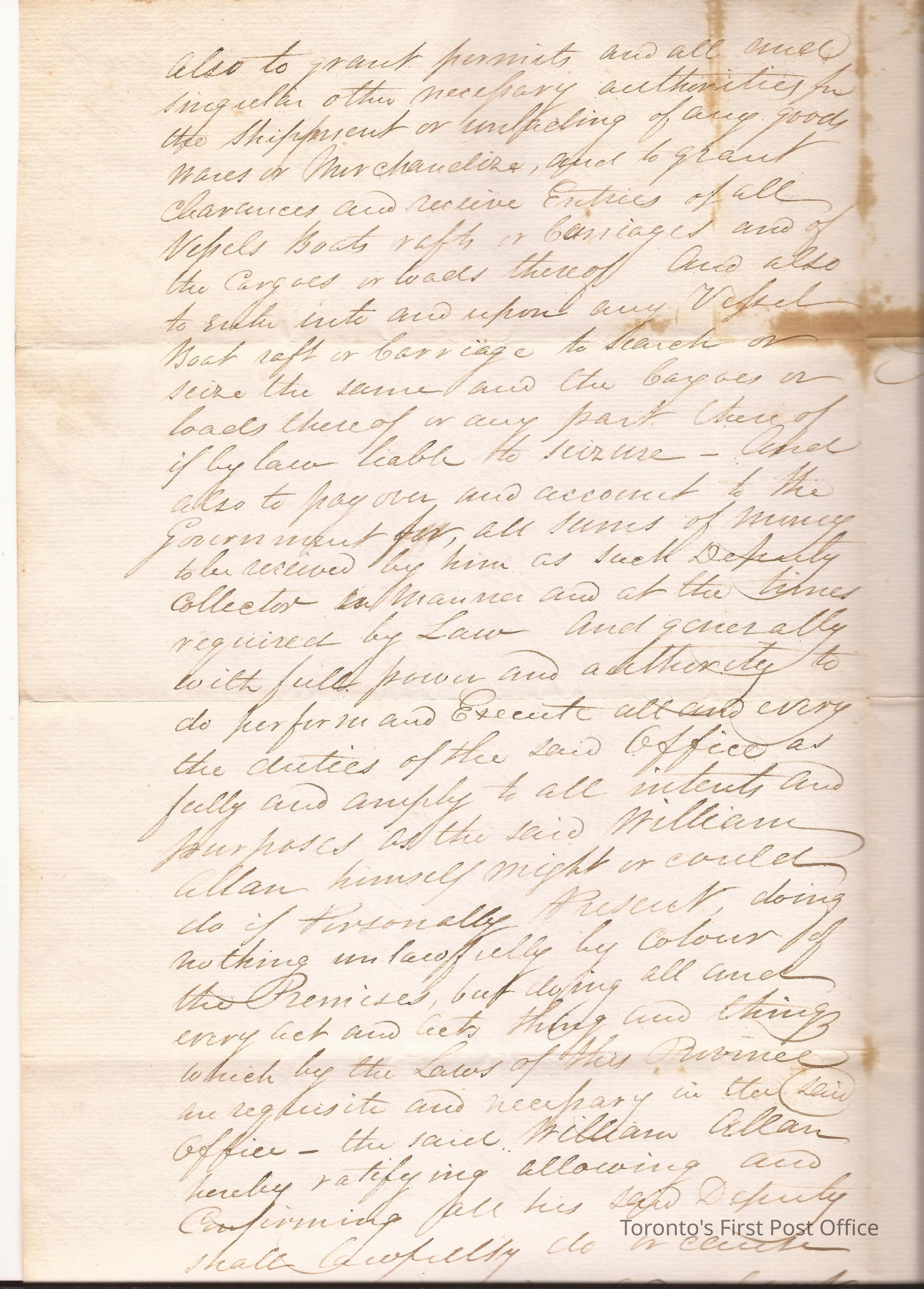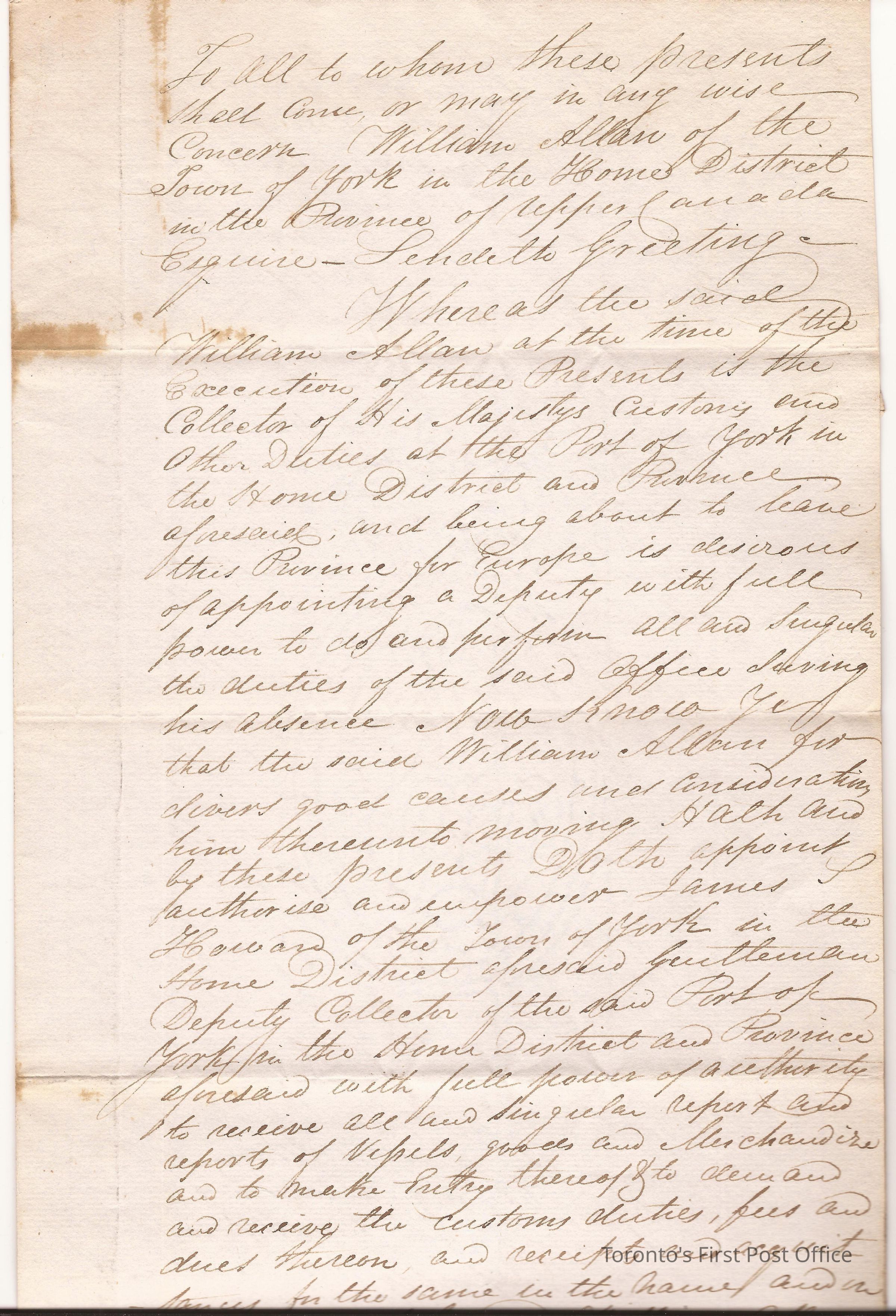 Appointment of James Scott Howard as Deputy Collector of Customs; signed by William Allan and witnessed by J Macaulay; brown ink manuscript on one sheet of double foolscap paper; 3 pp. of writing; one side labelled "W Allan to J.S. Howard Deputation as Collector"; white laid paper.Update Date