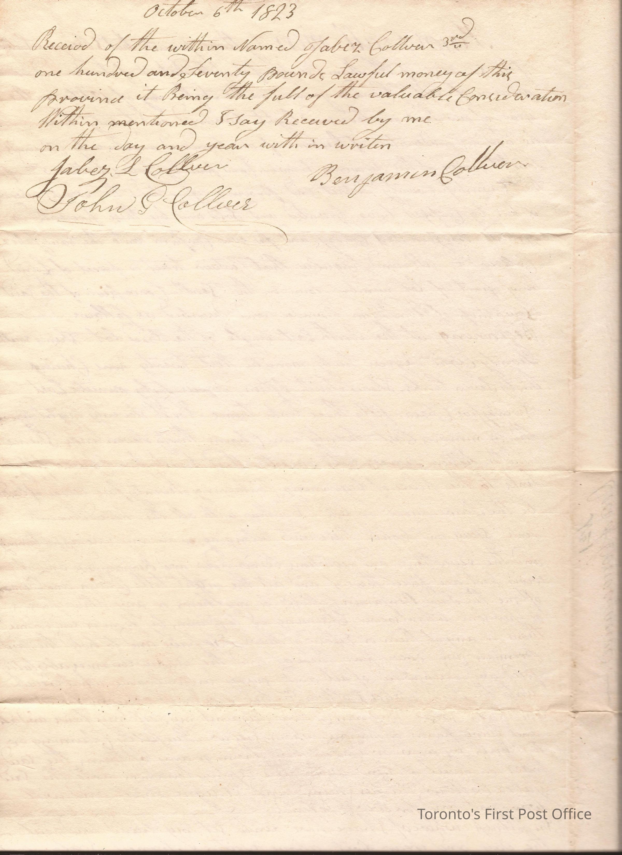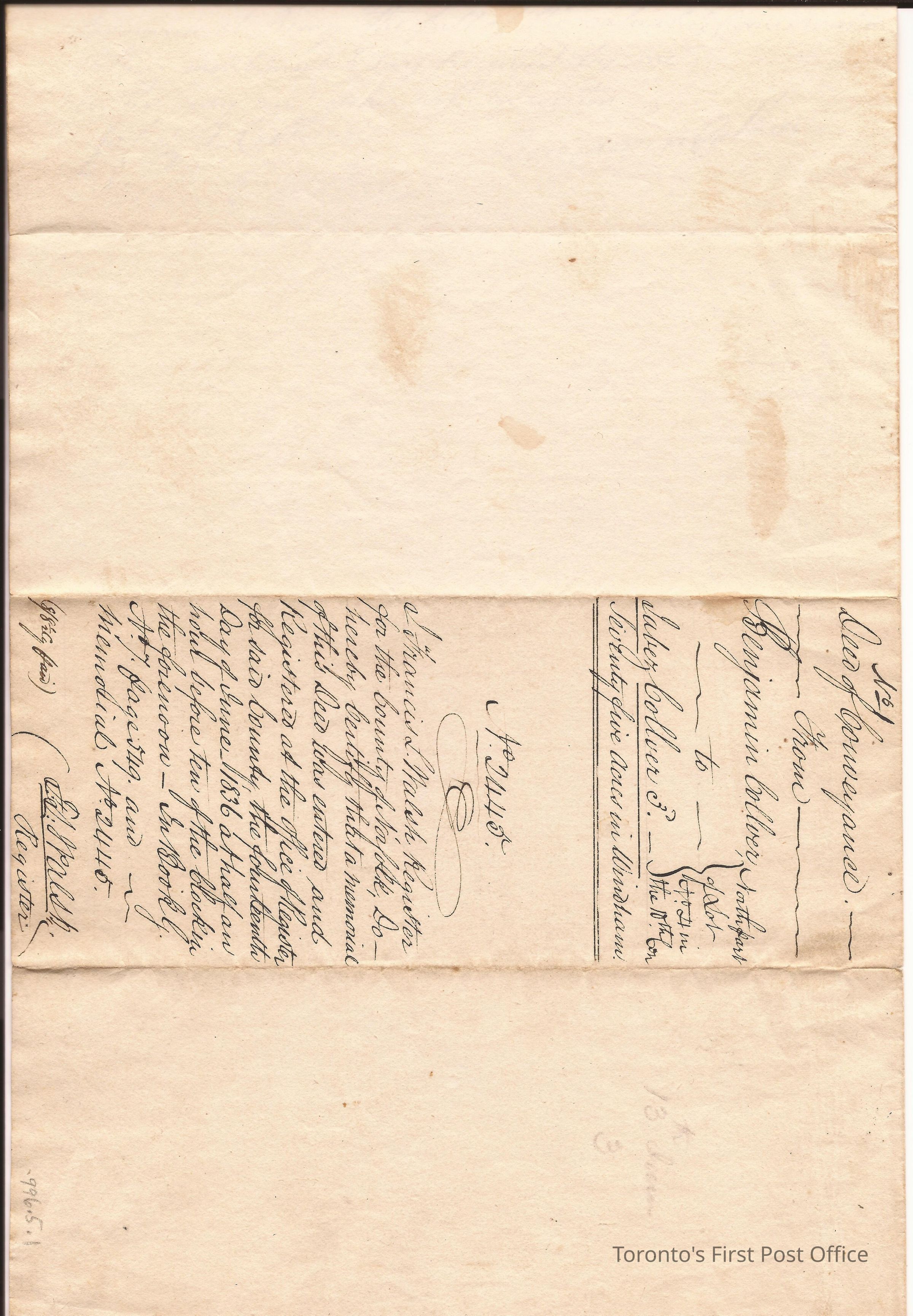 Deed of conveyance of 75 acres in Windham, north part of Lot No 4 in 10th Concession; from Benjamin Collver to Jabez(?) Collver; received £170 for property; registered by F.S. Walsh on 14th June 1836; black ink manuscript; red wafer seal at bottom right and covered in paper.Dimensions