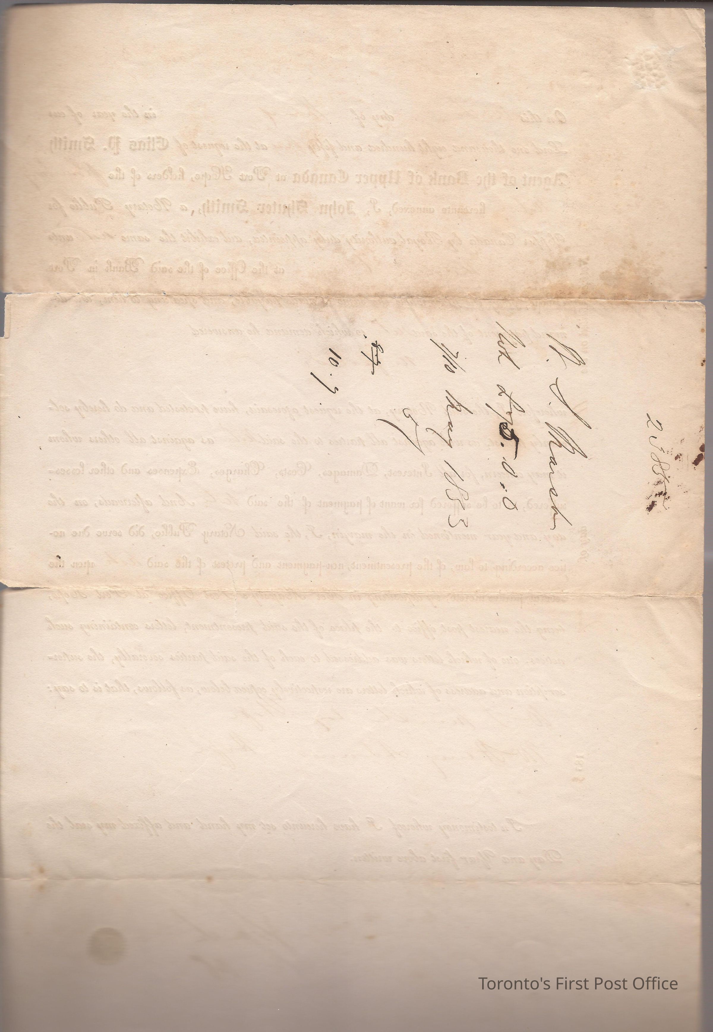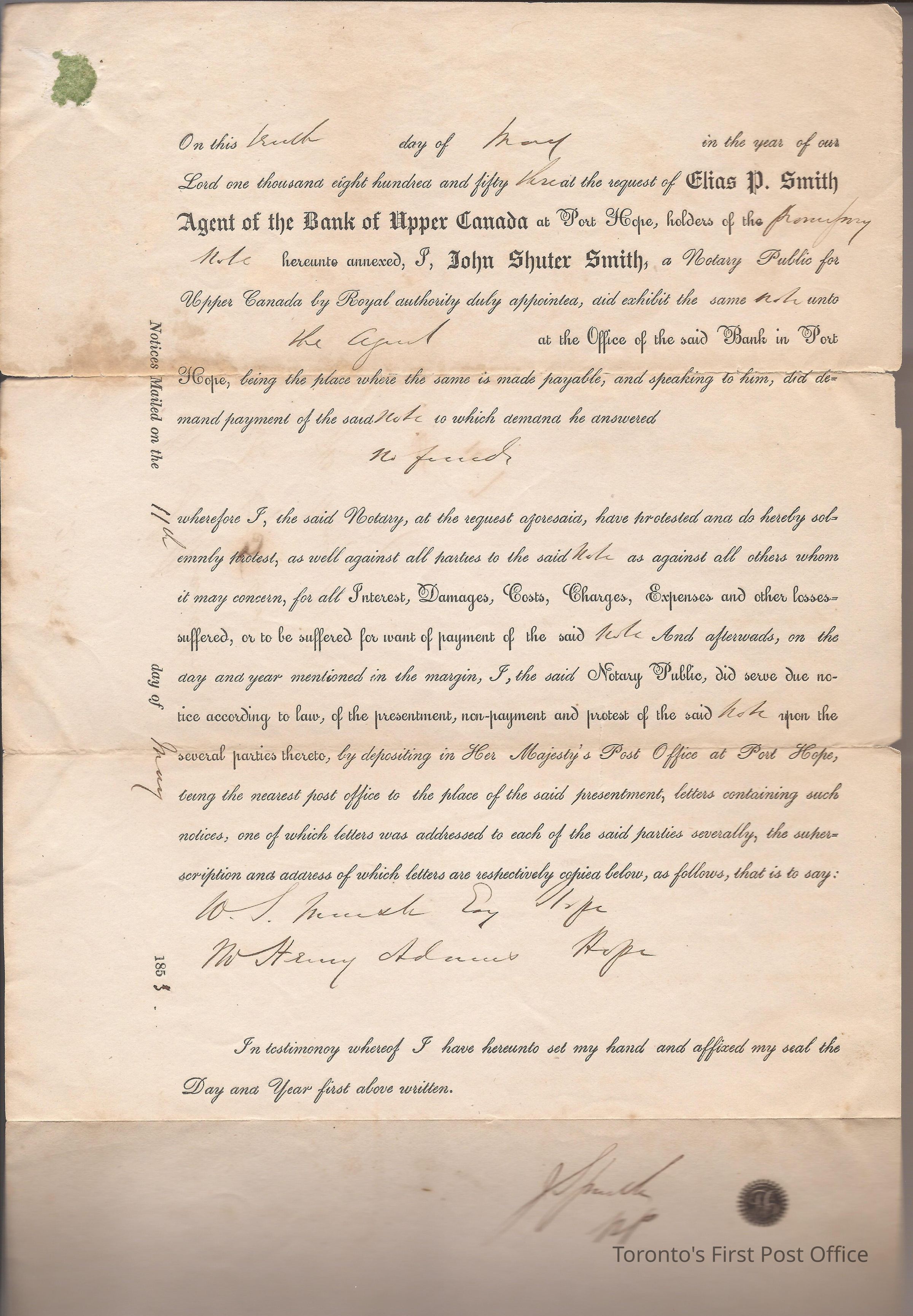 Notorized protest form to W.S. March; printed form letter, filled in manuscript with black ink; dated May 10 1853; signed John Shuter Smith, Notory Public; re: stating "no funds", original note signed by Wm. S. March for £75; unbleached paper; remnant of green wafer seal.Update Date