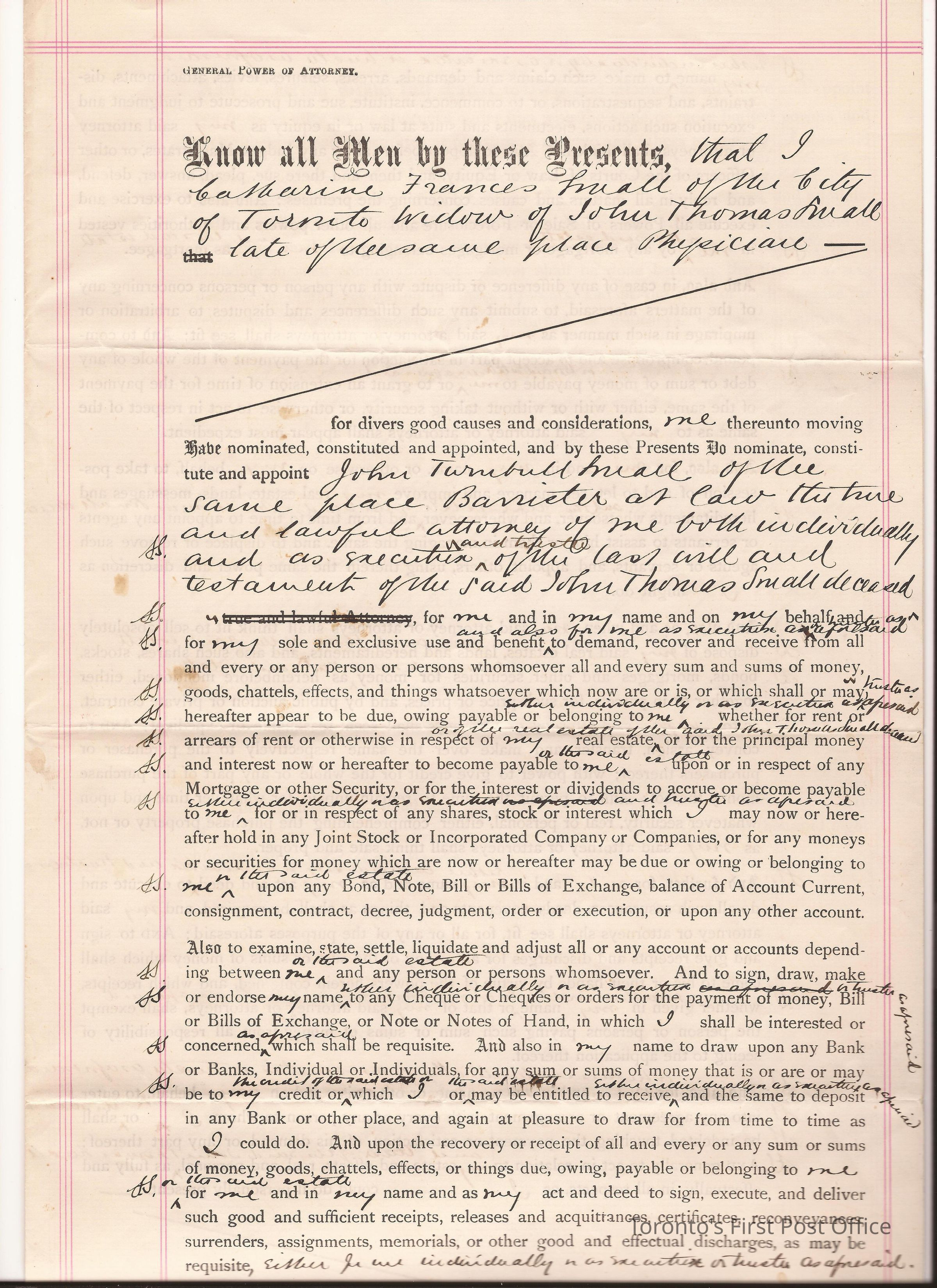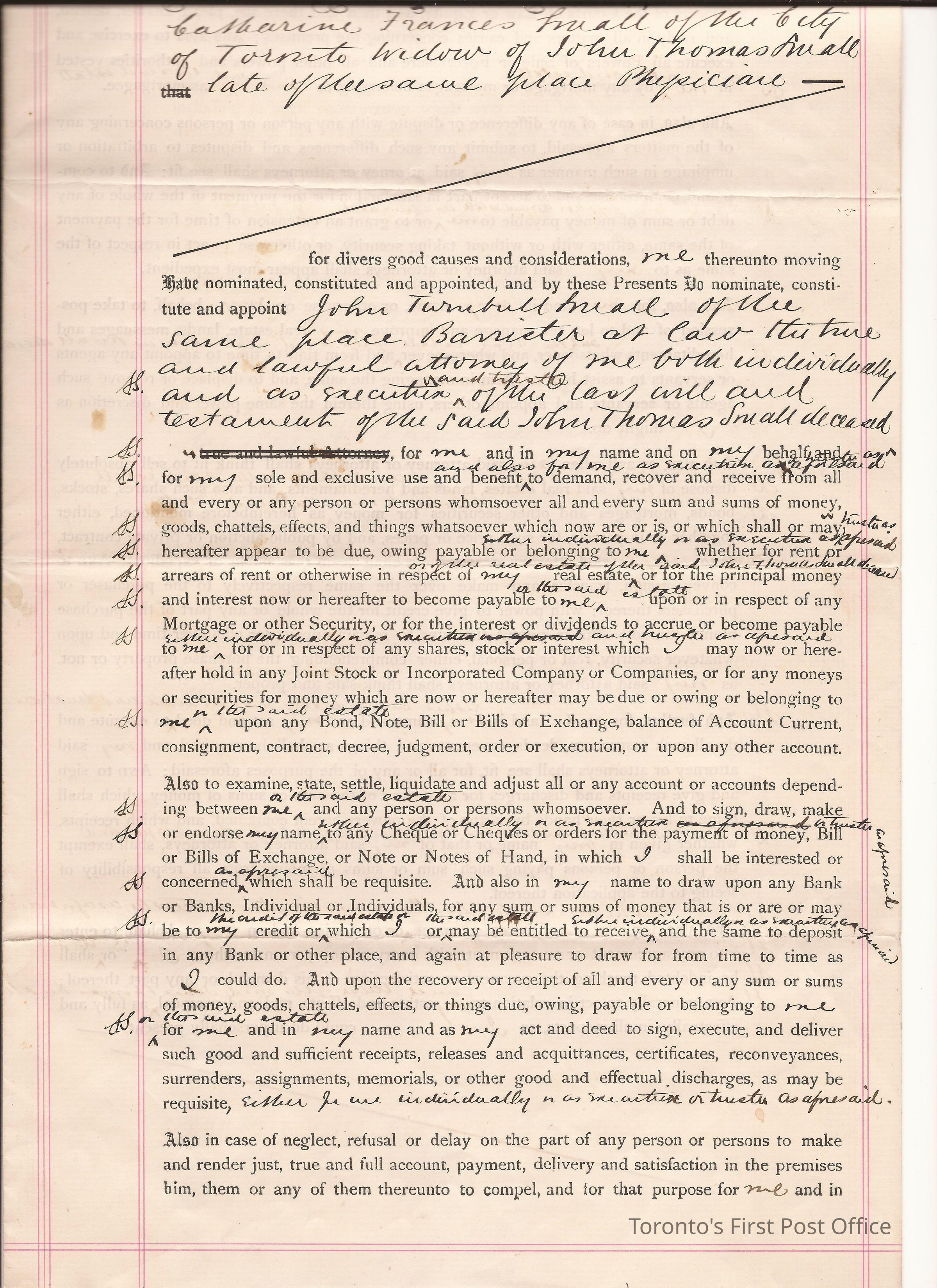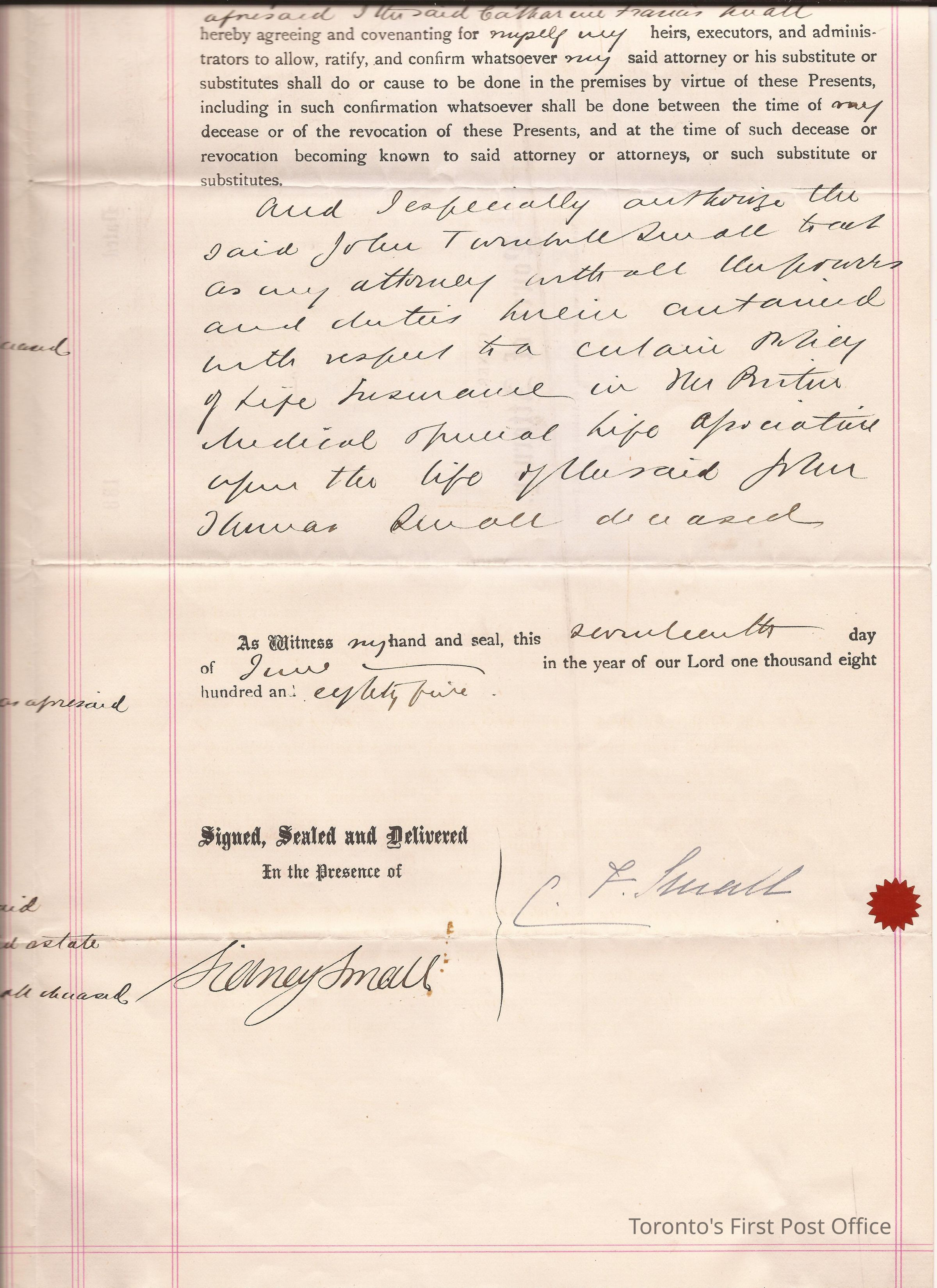 Document; re: C.F. Small is naming John Turnbull Small as her attorney and executor of her husband's John Thomas Small's will and testament; signed by C.F. Small, Sidney Small; small red, paper seal attached.Dimensions