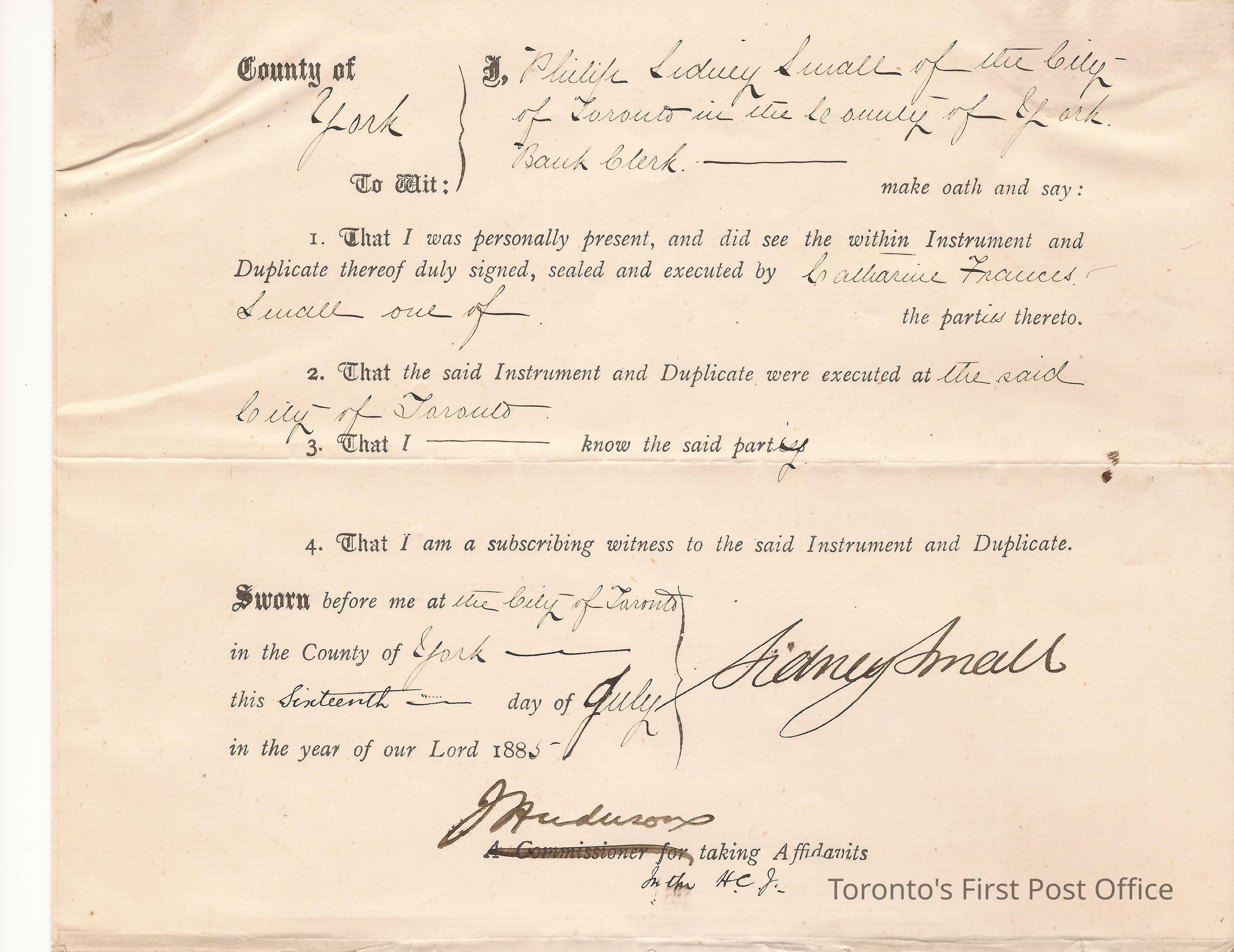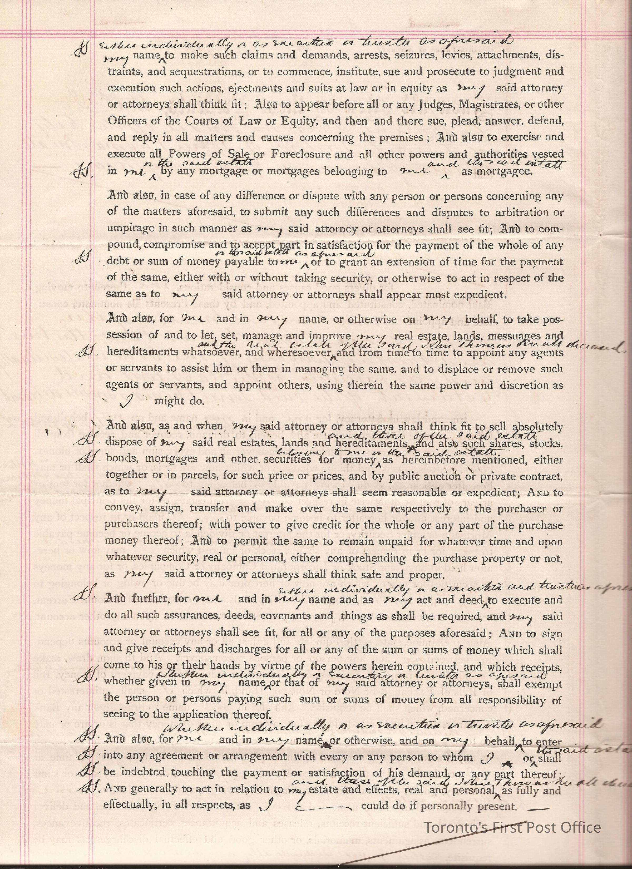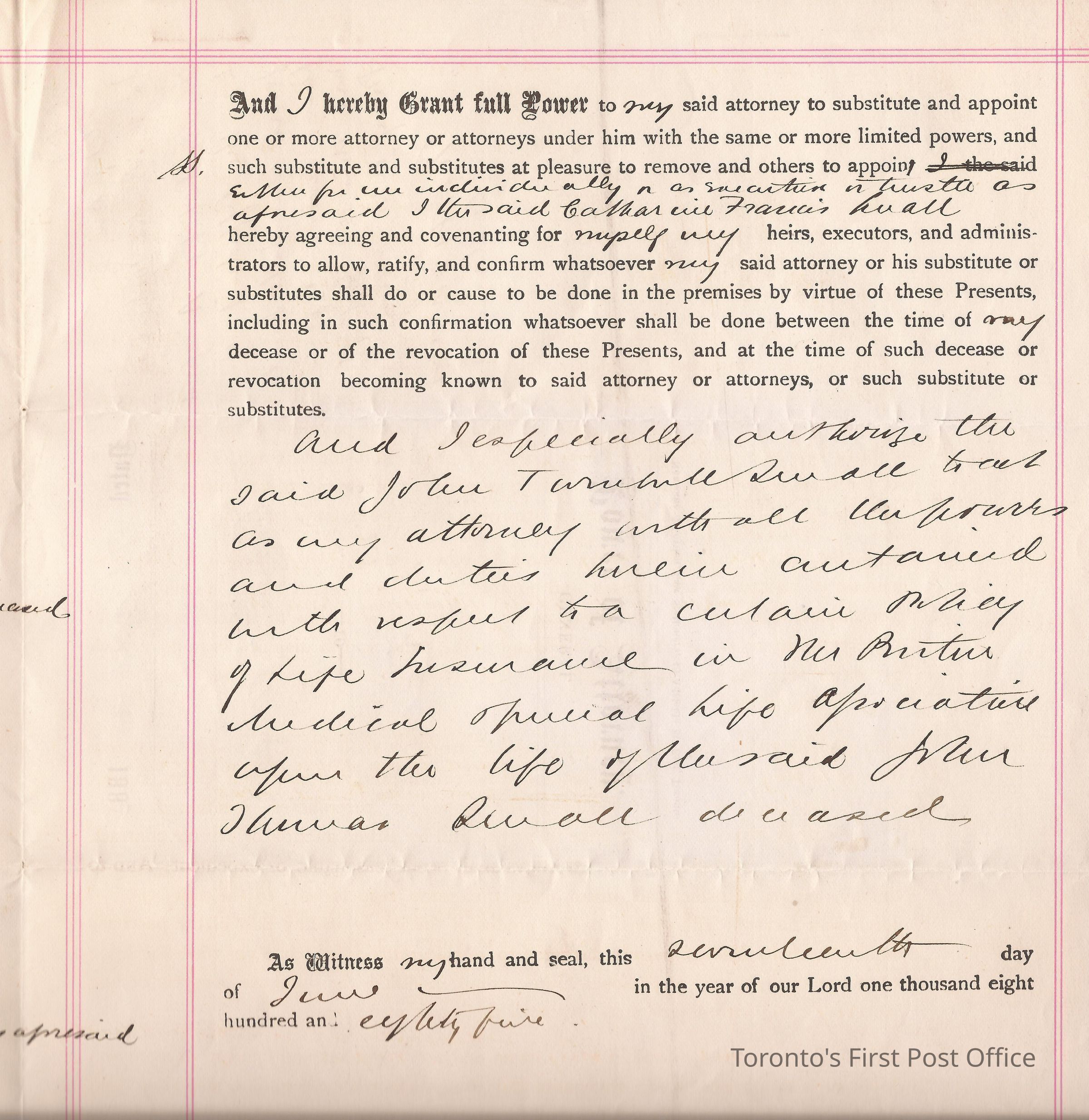 Document; re: C.F. Small is naming John Turnbull Small as her attorney and executor of her husband's John Thomas Small's will and testament; signed by C.F. Small, Sidney Small; small red, paper seal attached.Dimensions