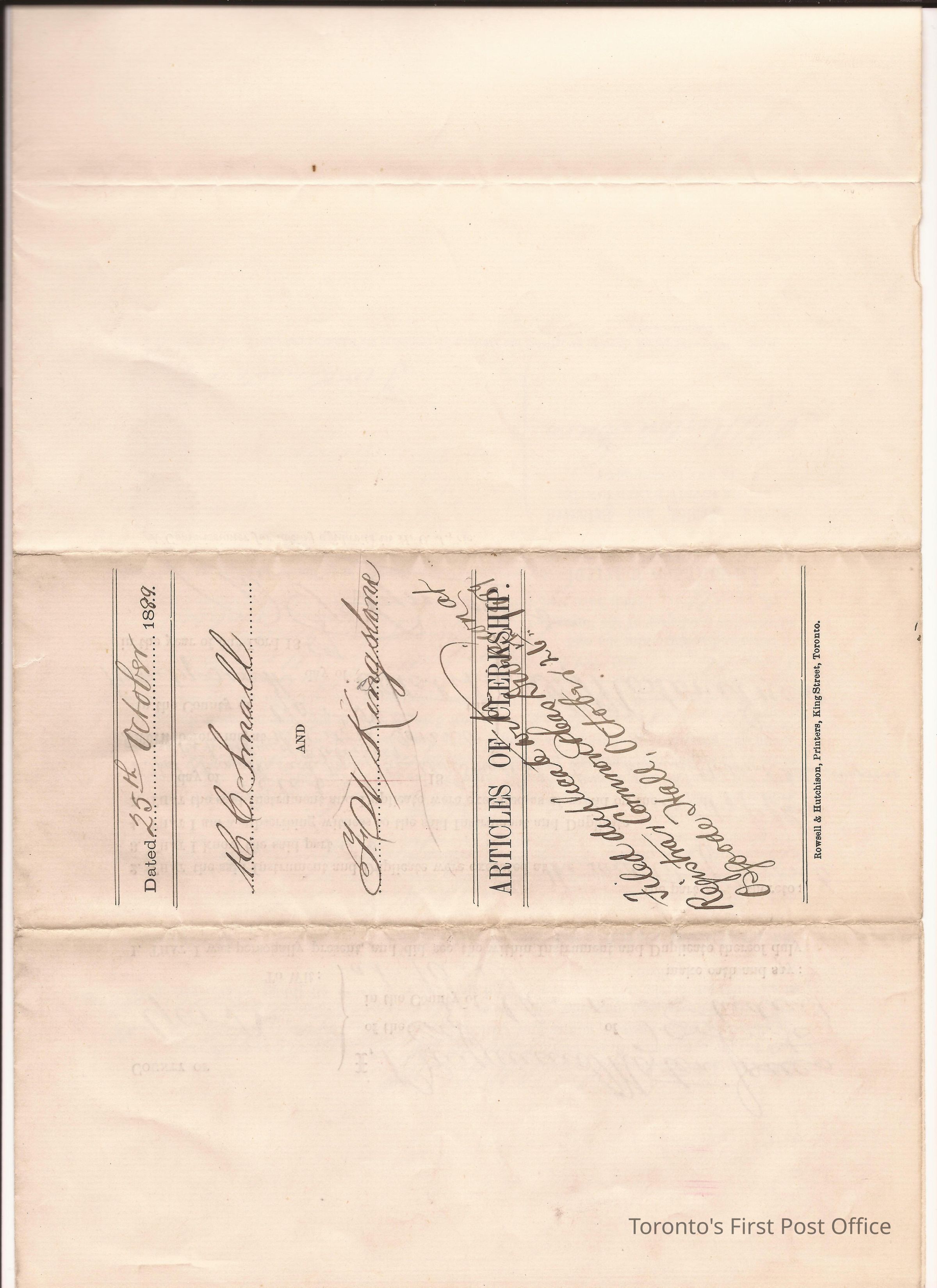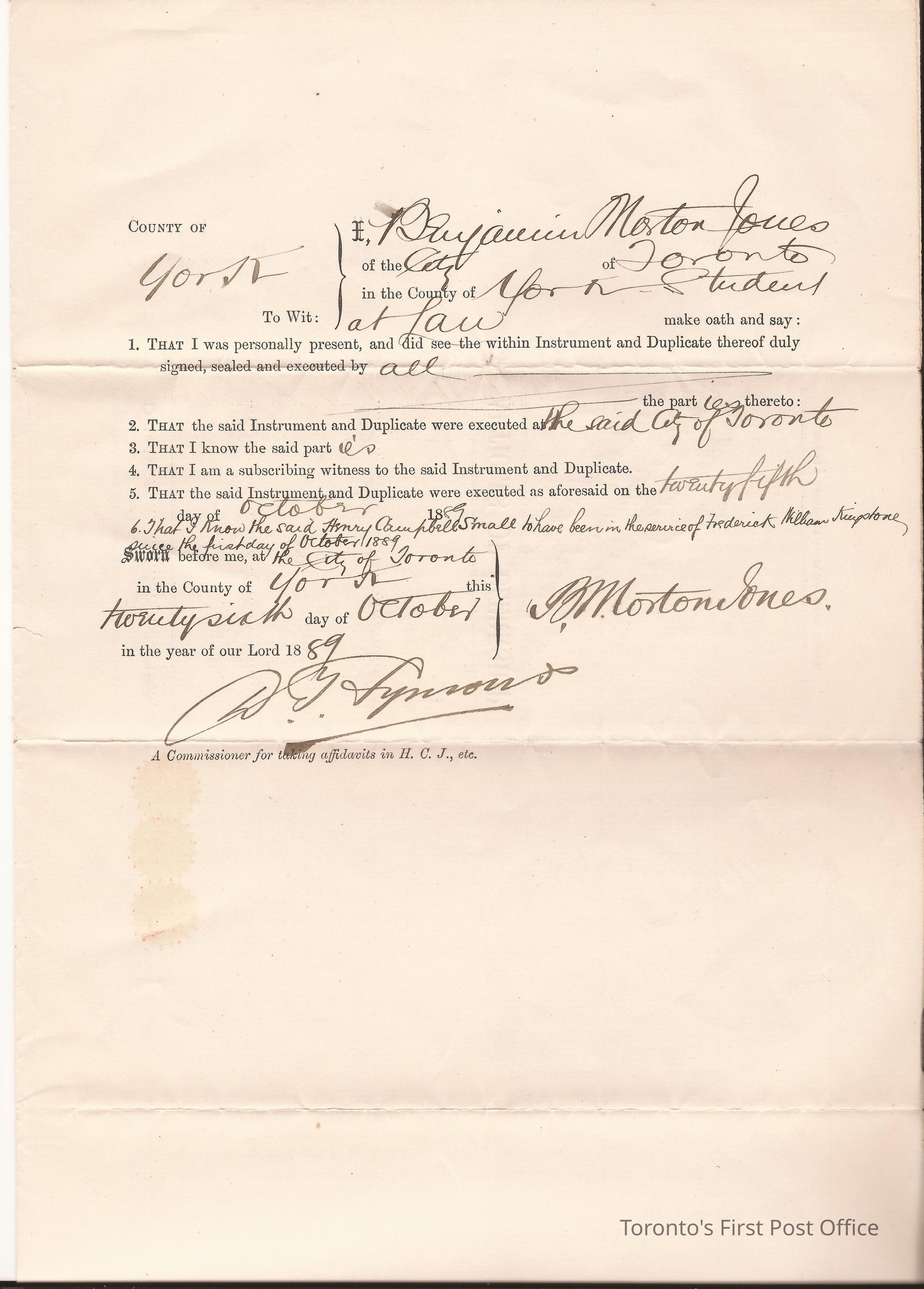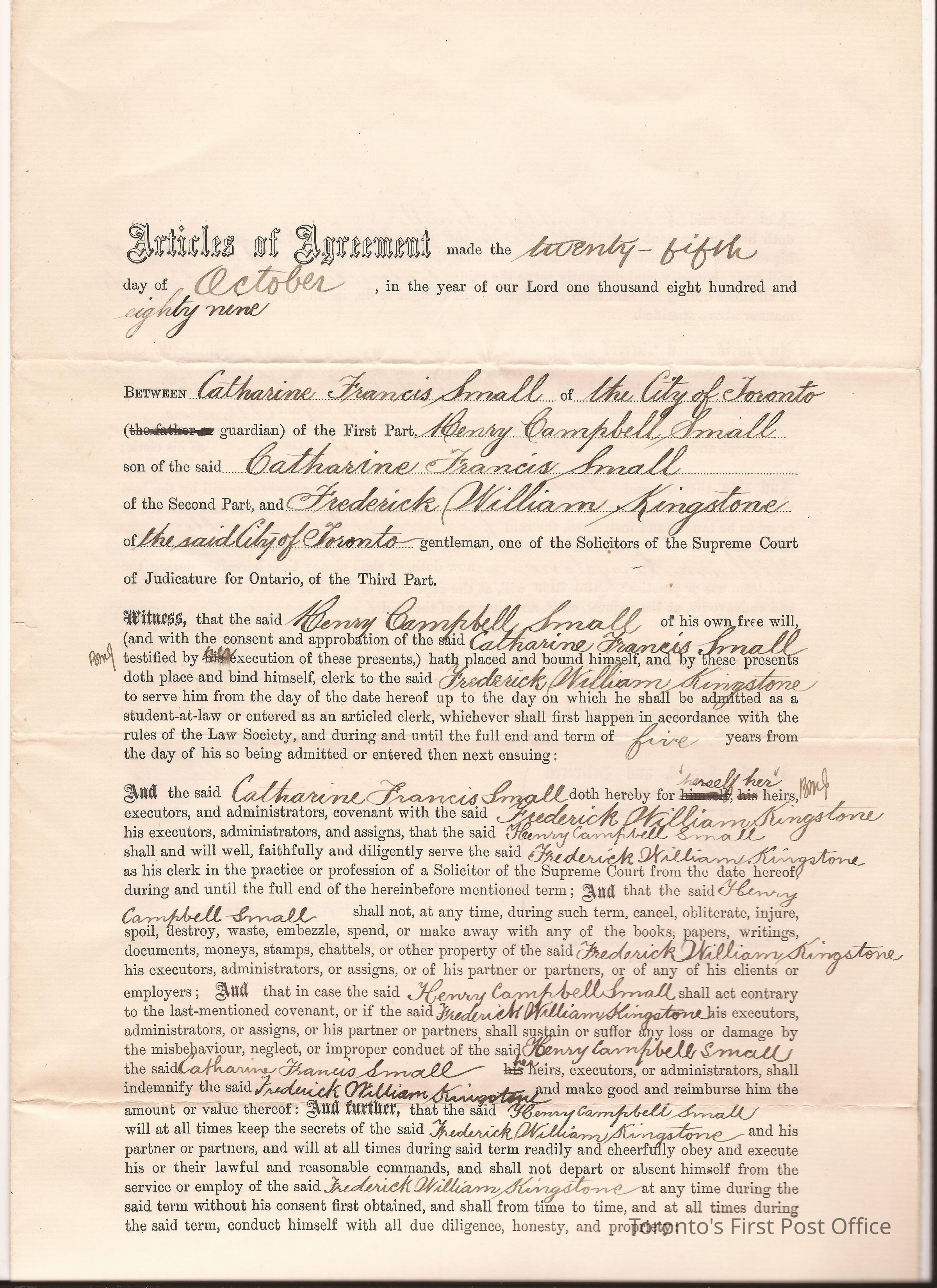 Document; article of agreement between Catherine Francis Small, Henry Campbell Small, and Frederick William Kingston for HCS to bind himself to Kingston for five years to learn law; signed by B. Morton Jones; dated Oct 26, 1889.; laid paper.Update Date