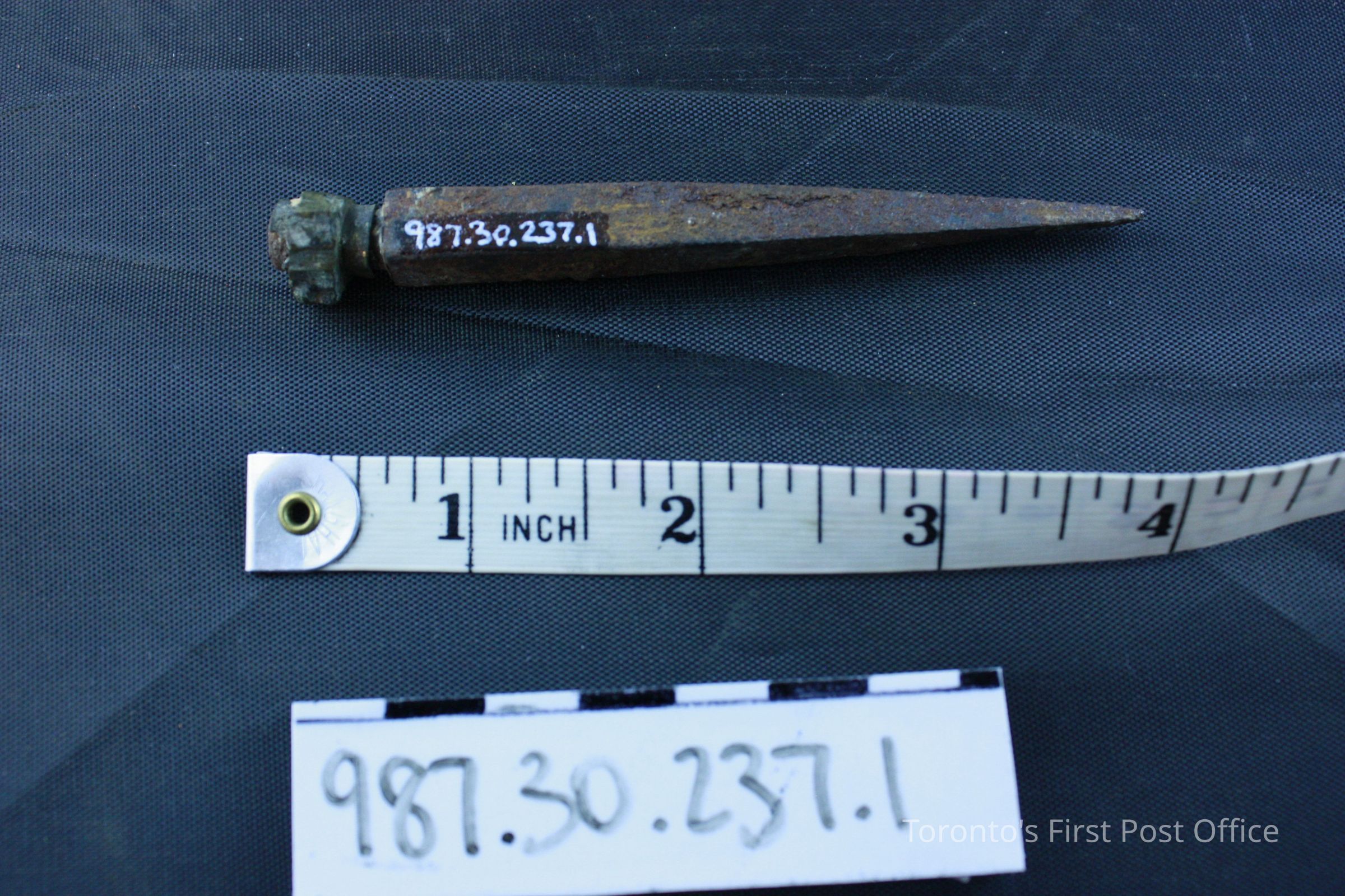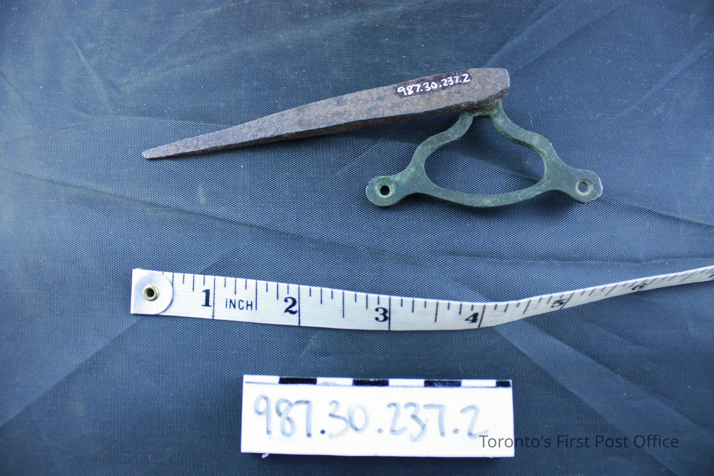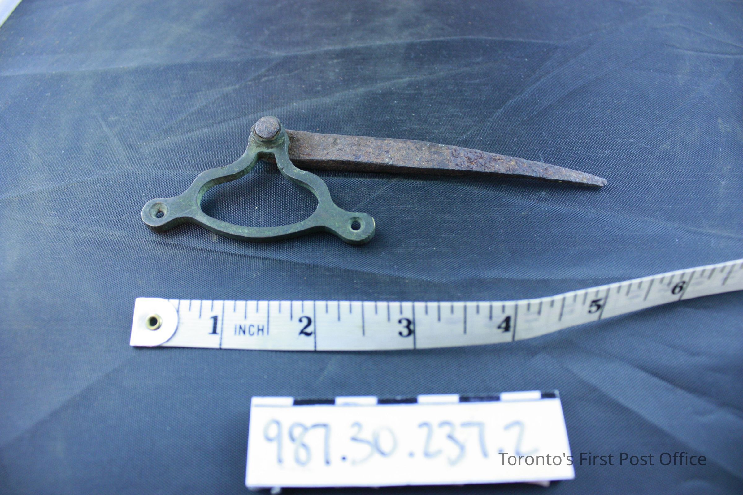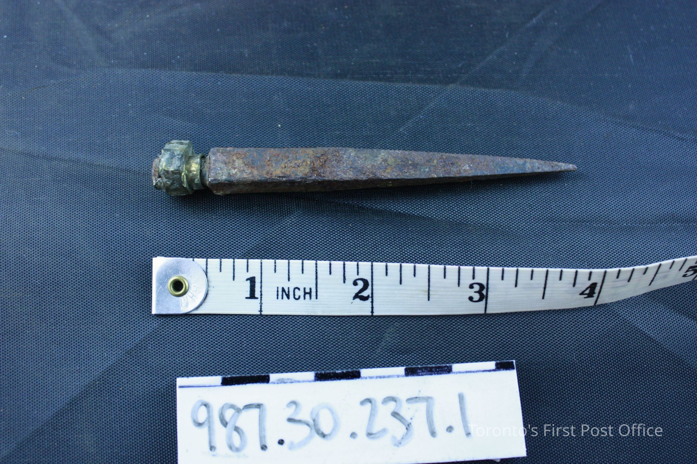 Door pin; cast iron; circa 1851; used as part of a mechanical door bell ringing system installed on first floor of Cumberland addition 1851; complete pin removed from inside of the casing of main front door on George St., May 1981.Dimensions