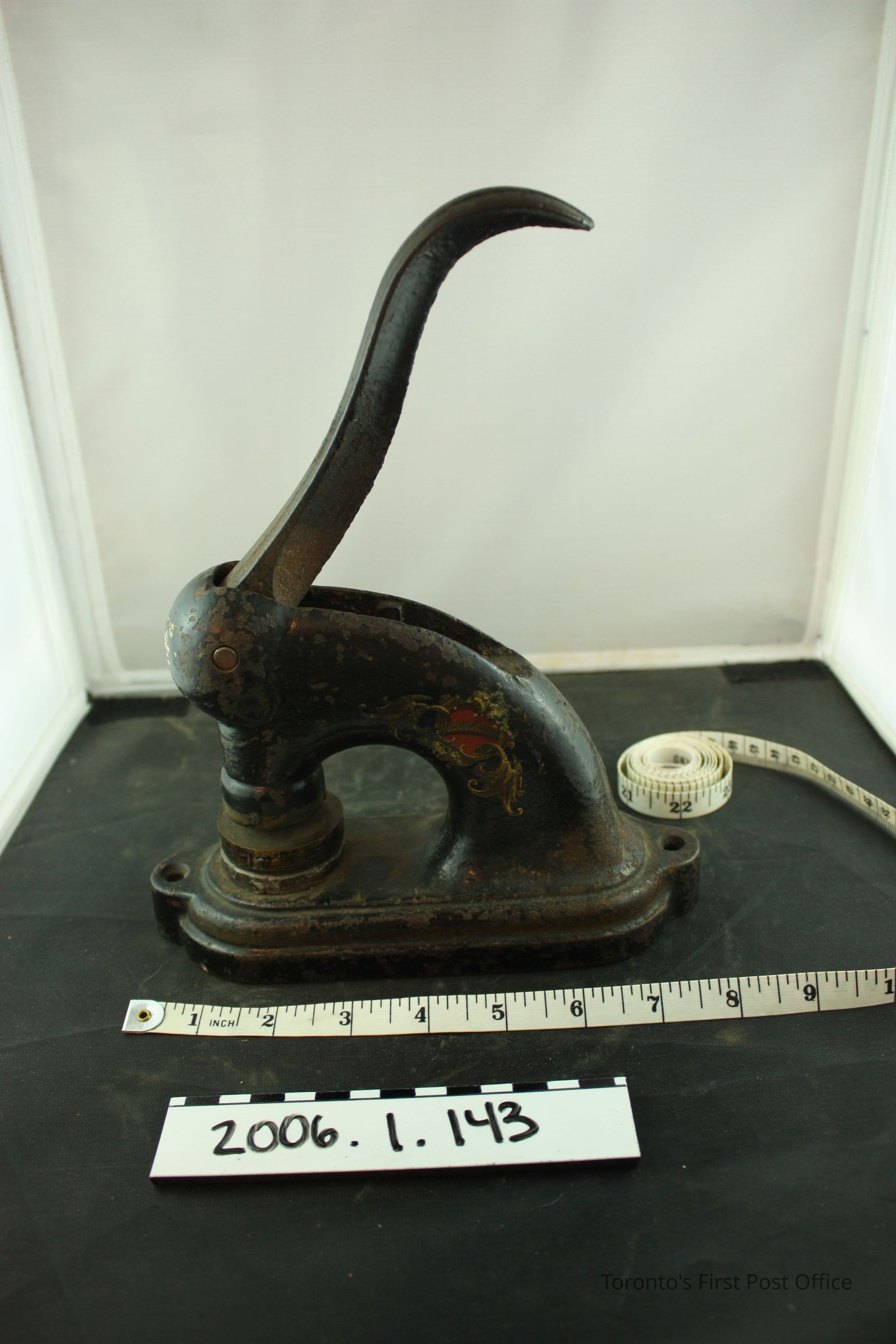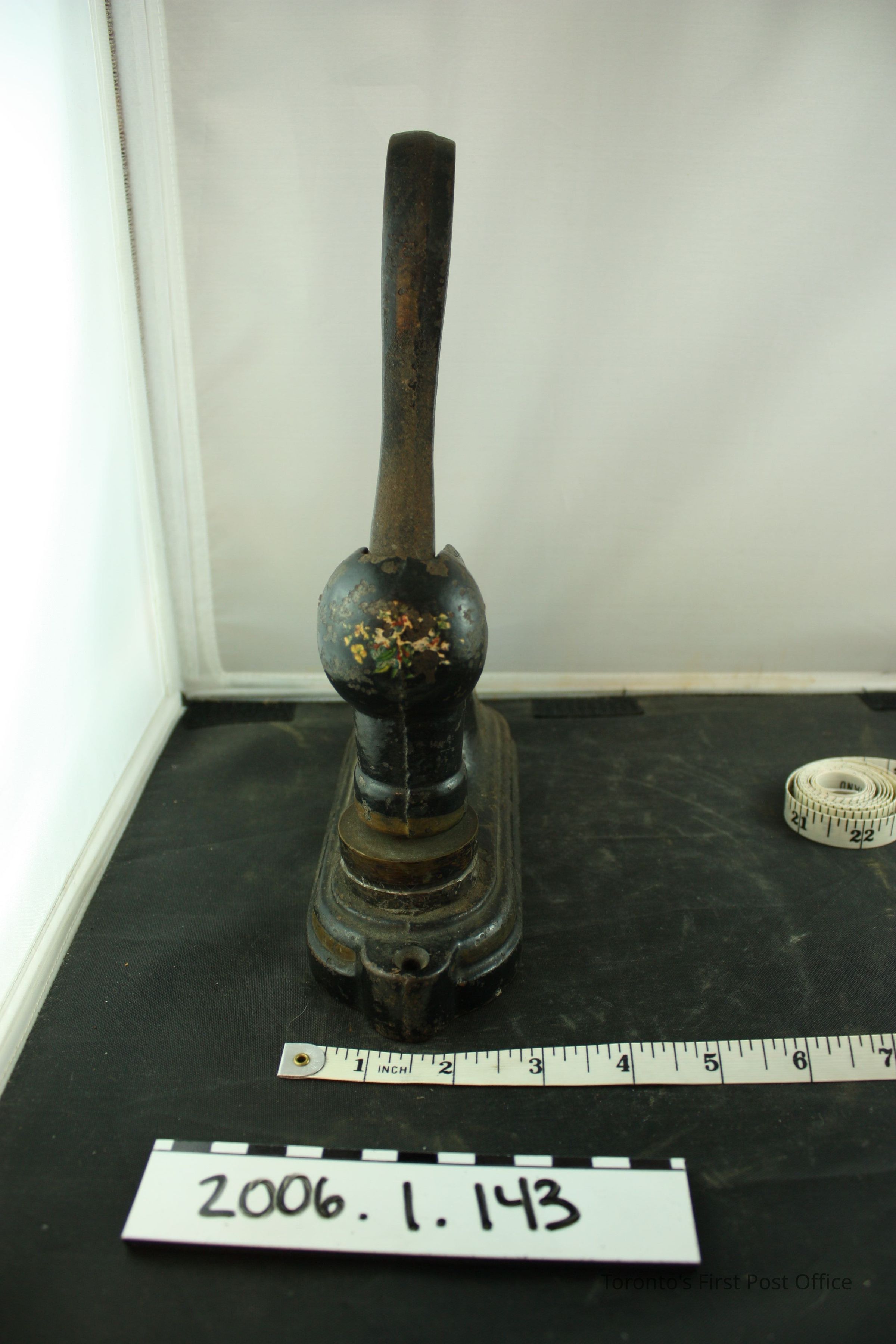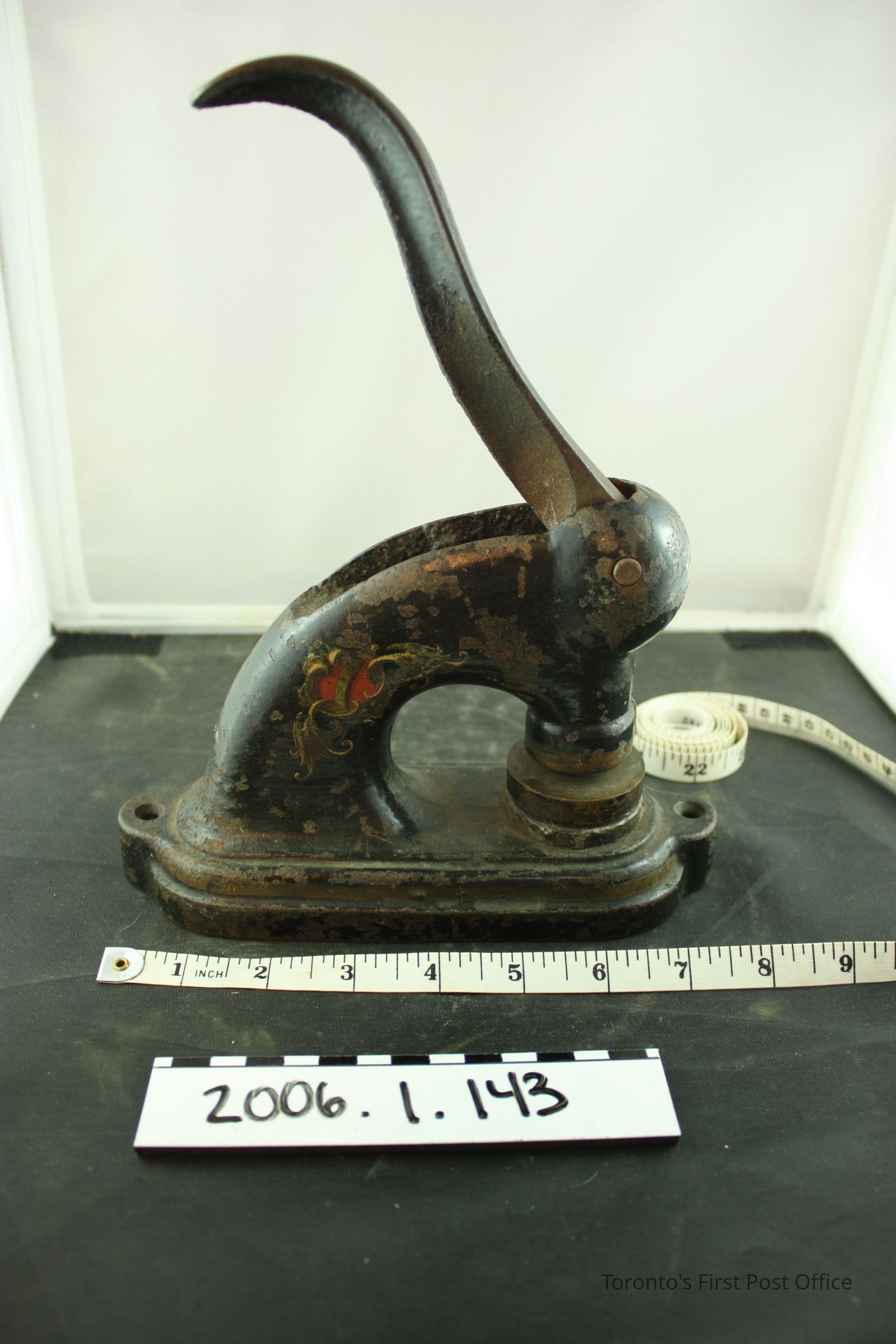 Embosser; black cast iron with painted floral arrangements in red and gold; triangular seal: "UNITY ENCAMPMENT INGERSOLL, ONT NO 24 I.O.O.F"; circa 1875.Dimensions
