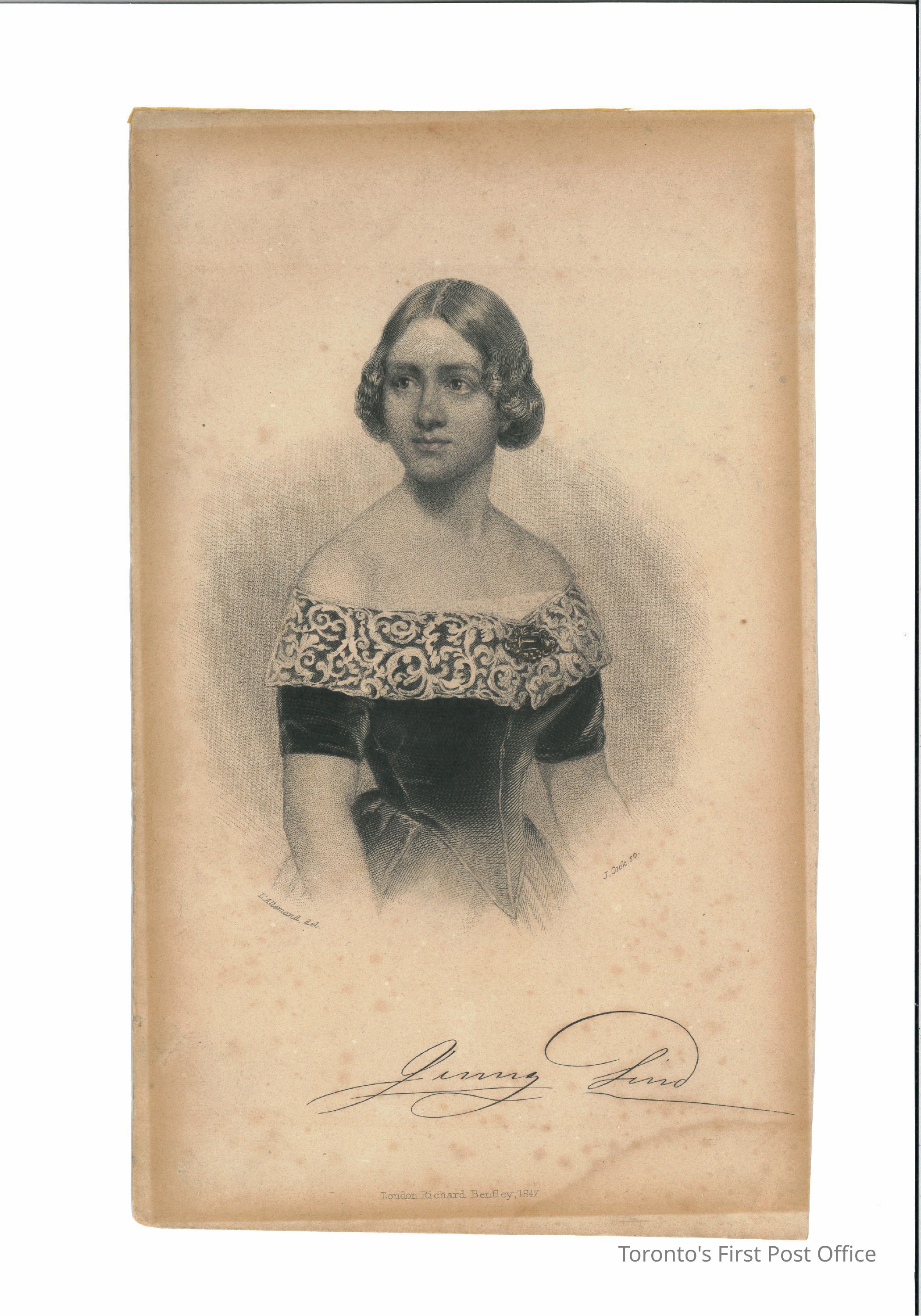 Engraving, copperplate, 3/4 portrait of Jenny Lind (from the hips up); she his facing left but looking to her right, wearing a dark, off-shoulder dress with pointed bodice, short sleeves, and lace collar with large brooch at front, engraving includes "L'Allemand, del." and "J. Cook so", signed by Jenny Lind; also "London: Richard Bentley, 1847" at bottom of card; on middle-weight cotton paper.Update Date