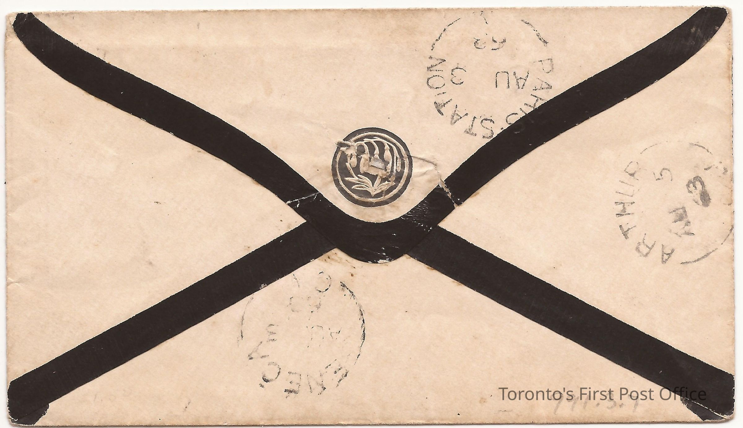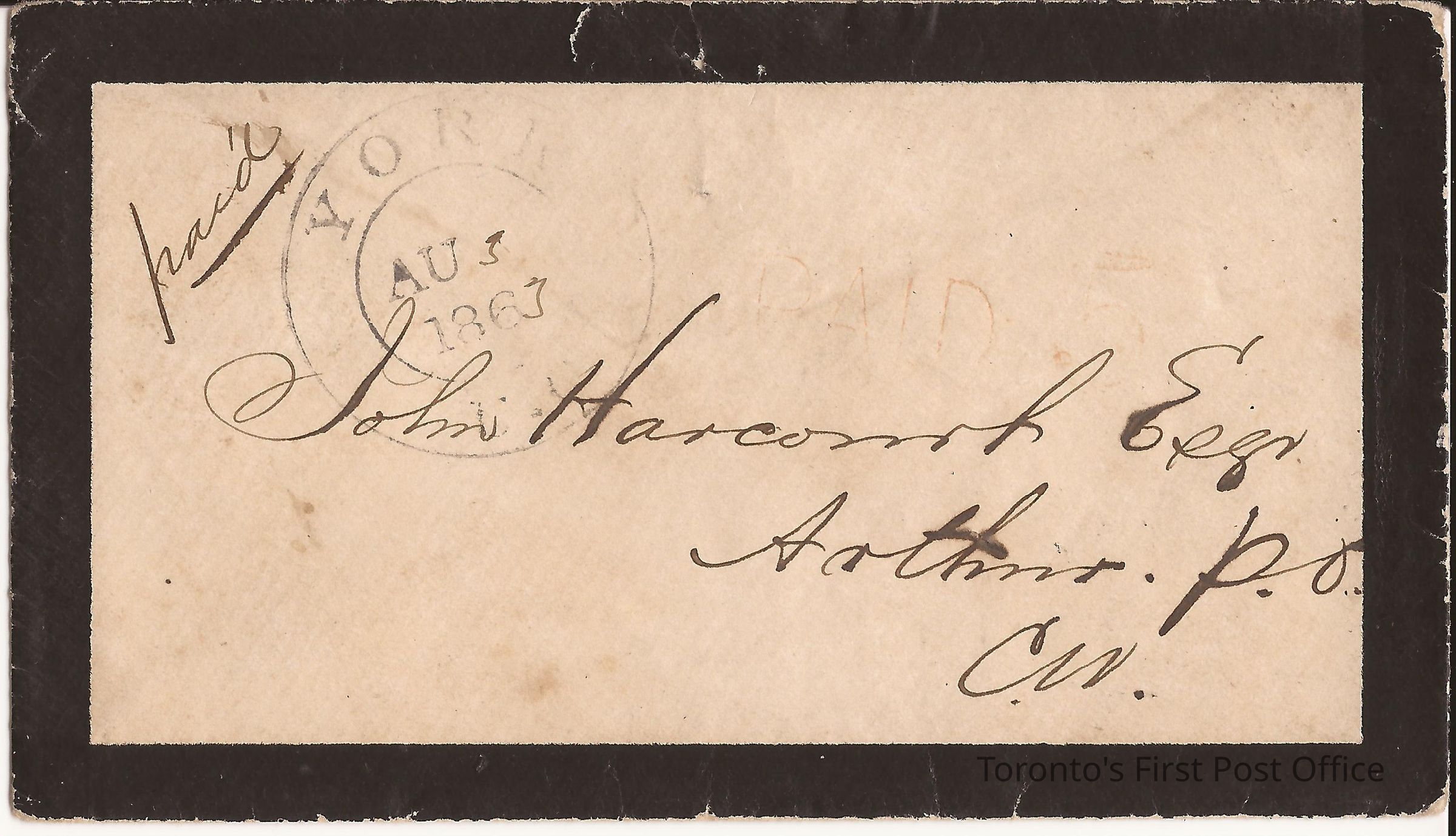 Mourning envelope; to John Harcourt Esq, Arthur P.O. C.W.; 0.6cm black stripe around edges; black address; 3 black stamp imprints on reverse; black and white embossed flower; dated: Aug 3, 1863.Update Date