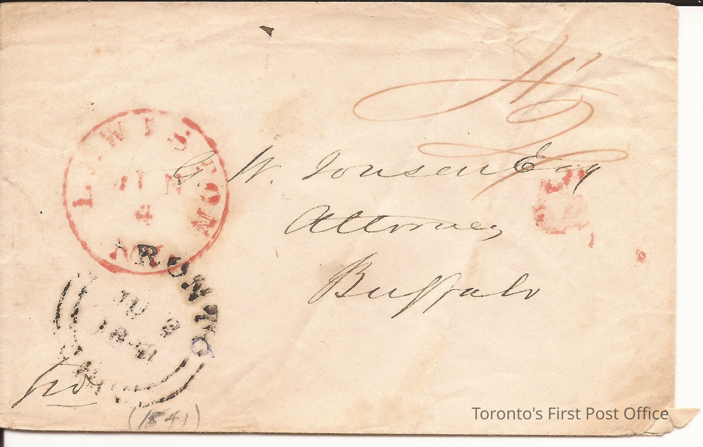Red wax seal; dated: 1841; addressed to G.W. Jonsen, Esquire, Attorney, Buffalo; from Toronto U.C.; cross-border letter; postage: Toronto across lake to Queenston 4 1/2d, to Buffalo 5c; postmarks: 1. single, orange-red LEWISTON JUN 4 NY, 2. double broken, black TORONTO JU 3 1841 U.C.Update Date