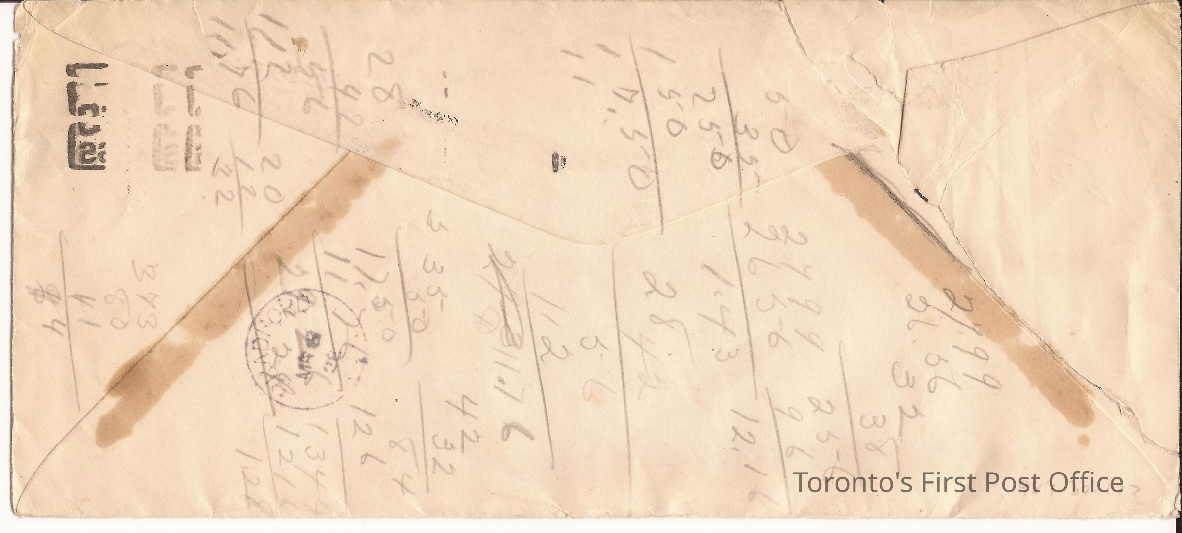 Window envelope; return address printed at top left: "Return in 5 days to Toronto Creamery Branch…"; postmarks: black single "TORONTO ONT. MAR 5 8:30 PM 1928 POSTAL TERMINAL"; postage: 2 cent stamp of George V in green; rectangular canceller; unbleached paper.Dimensions