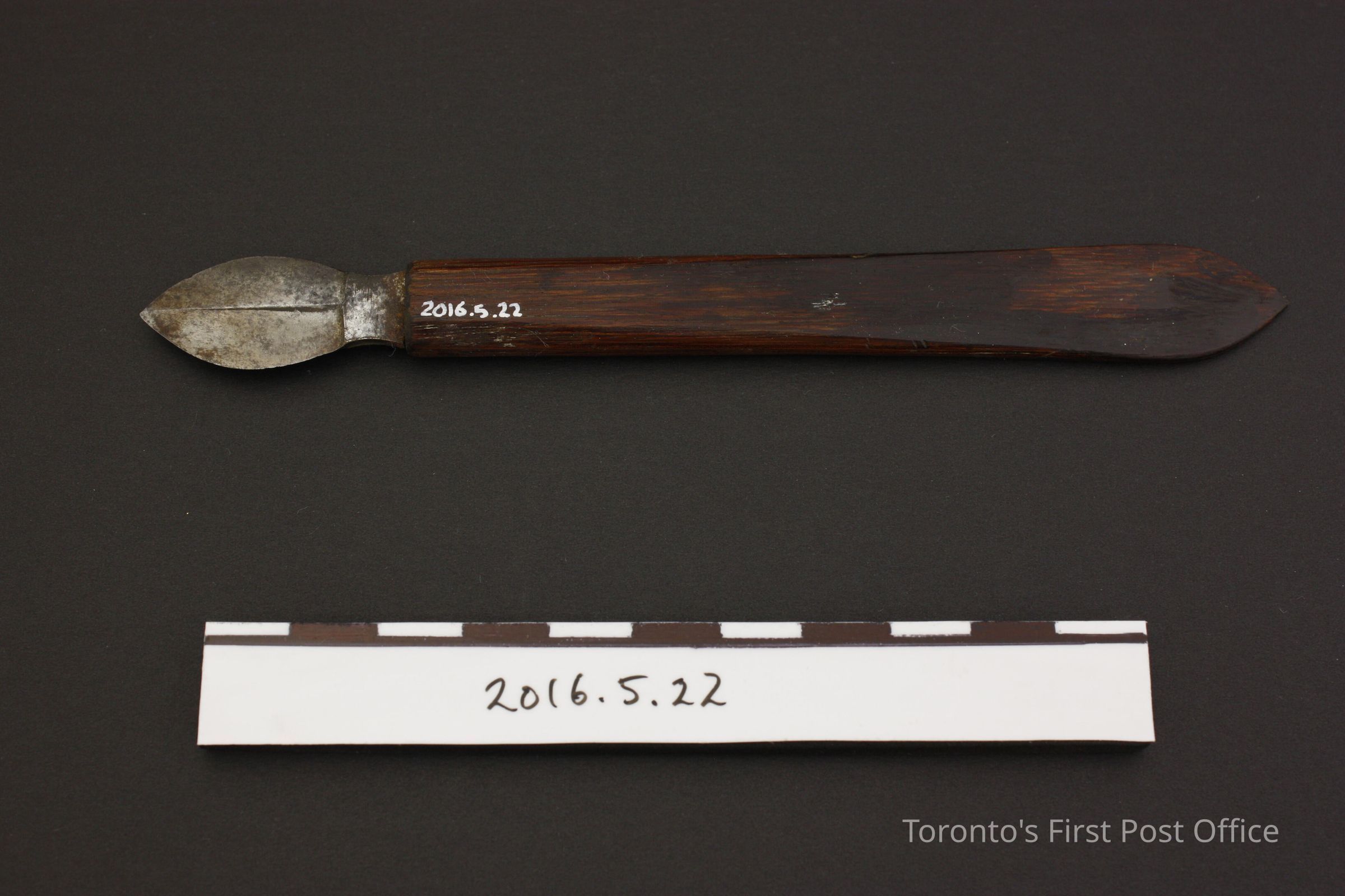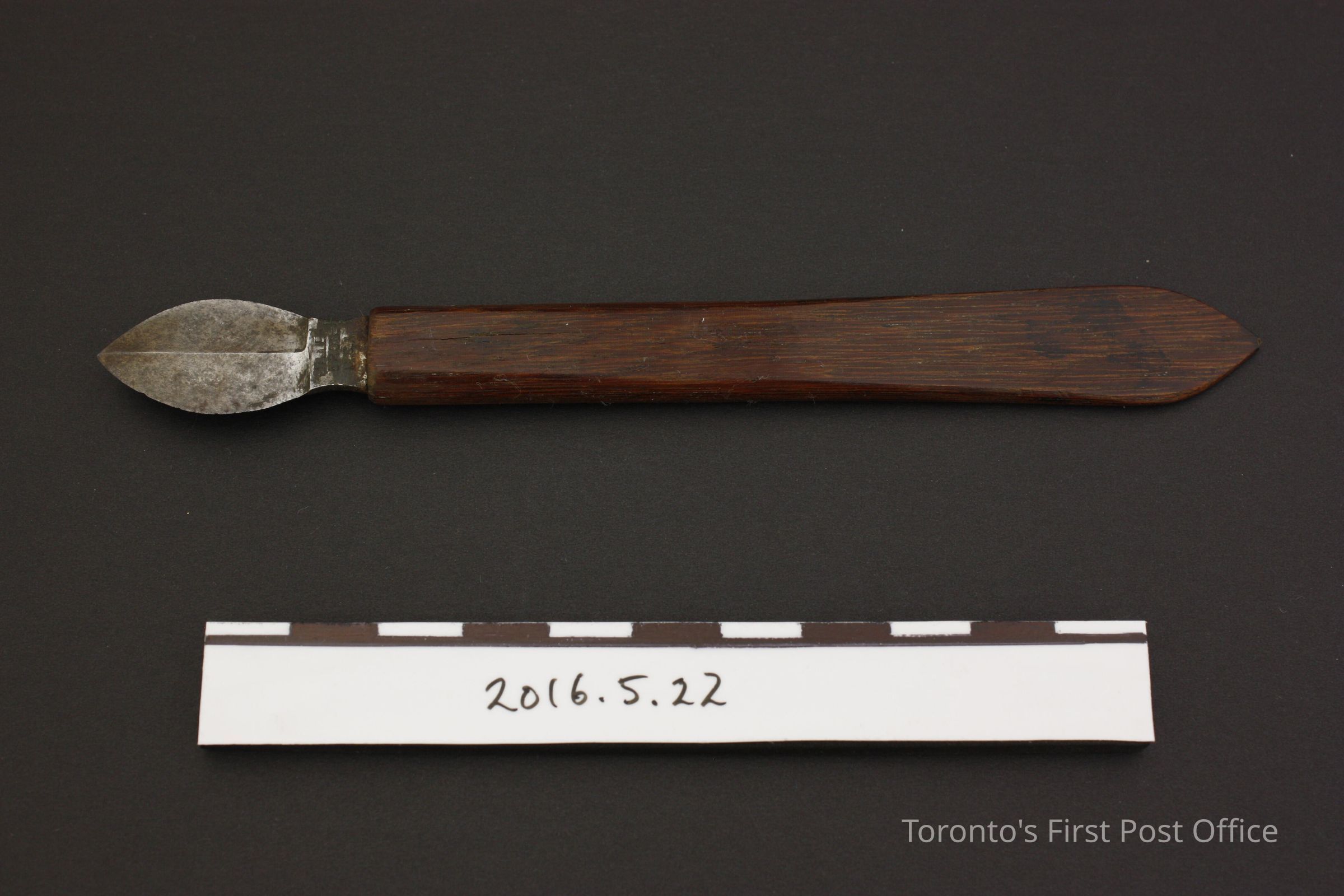 Double sided steel blade eraser knife with dark wood (rose wood?) handle. Blade shaft is marked 'Miller/ Bros./ U.S.A.'