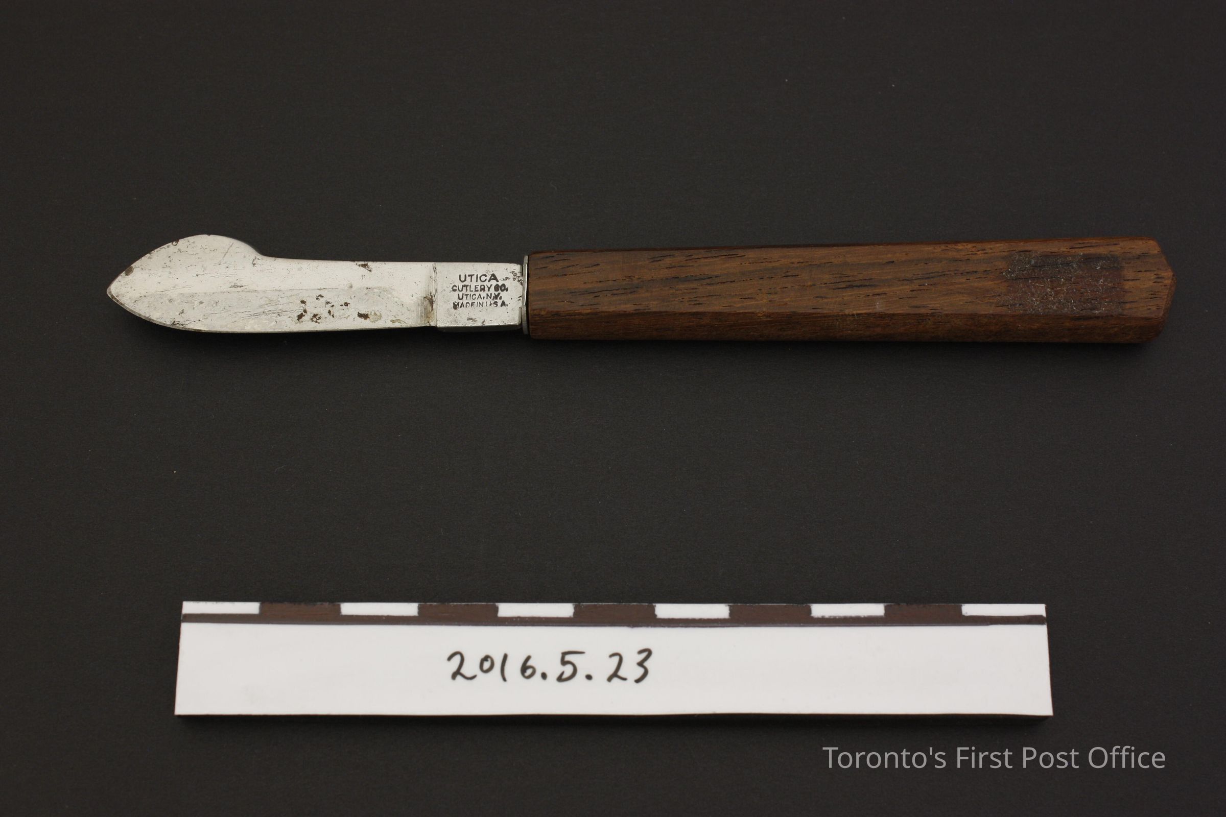 Single sided steel blade eraser knife with a wooden handle. Blade shaft is marked 'UTICA/ Cutlery co/ Utica, N.Y./ Made in U.S.A.'