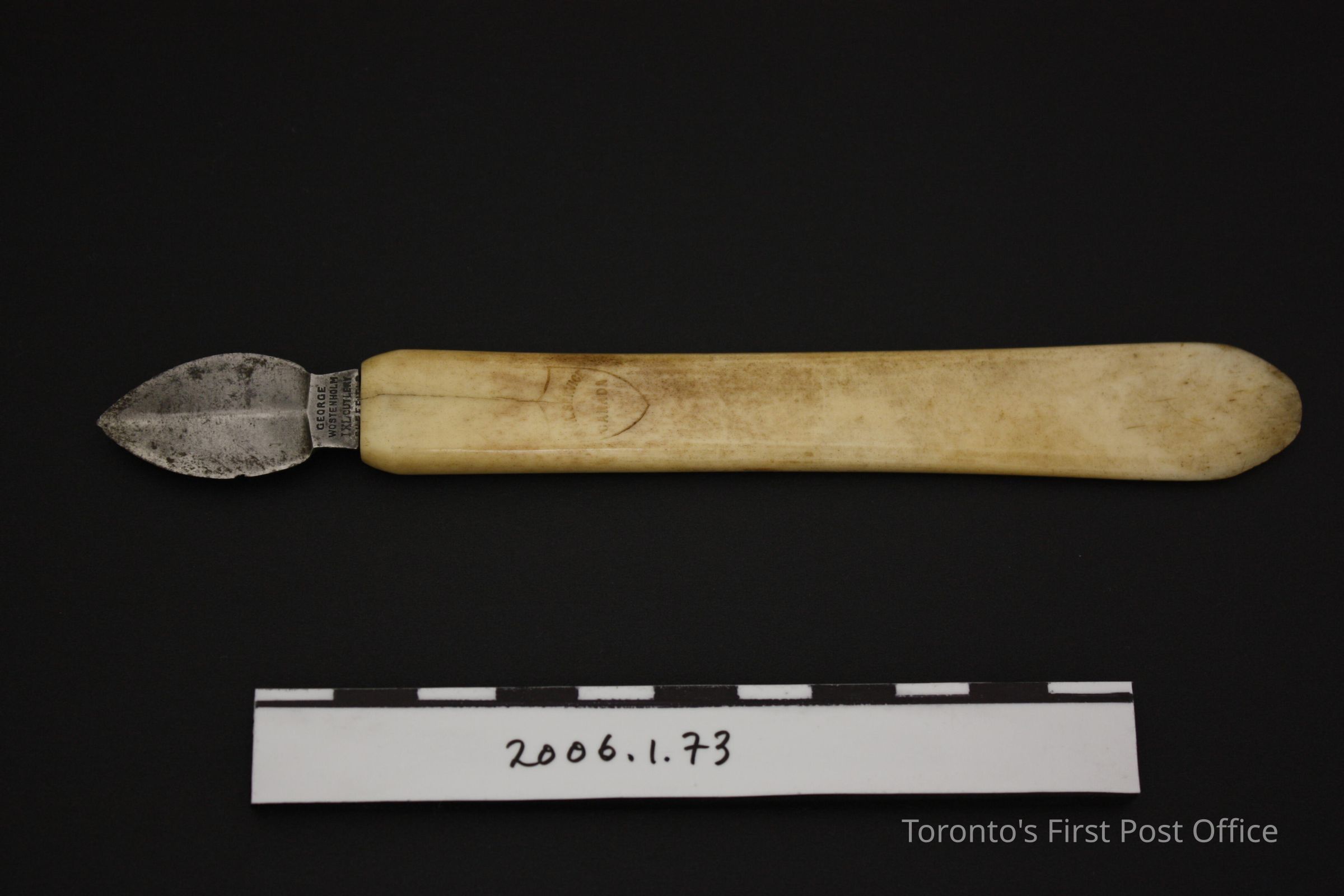 Eraser knife with double-edged arrowhead-shaped steel blade in bone handle; blade marked with "GEORGE WOSTENHOLM IXL CUTLERY SHEFFIELD"; shield stamped on handle with "CIVIL SERVICE/CANADA"; circa 1870.Dimensions