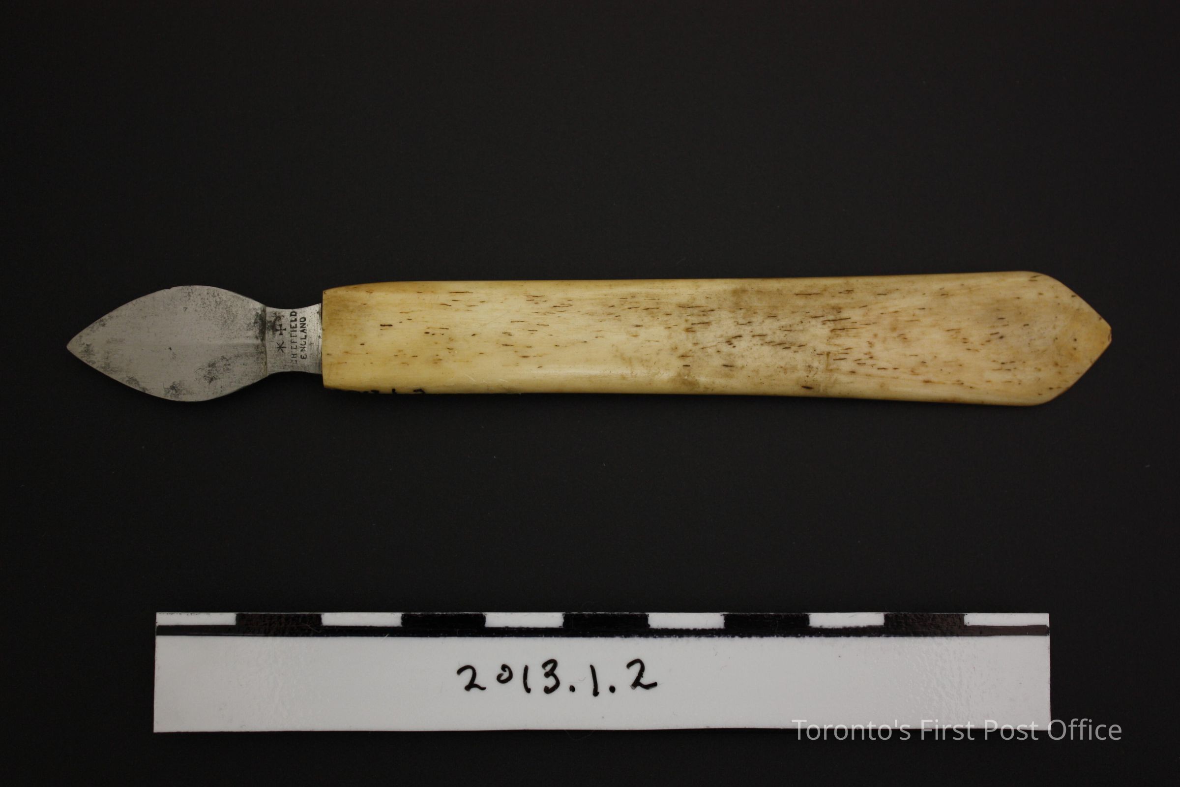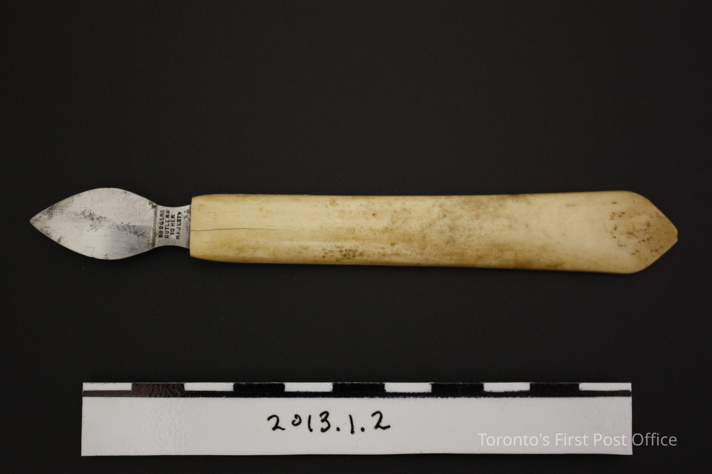 Double sided steel blade eraser knife with ivory handle. Blade shaft has markings on both sides: two symbols, a star and a cross above 'Sheffield England' on one side; 'Rodgers Cutlers to her Majesty' on the other side.Update Date