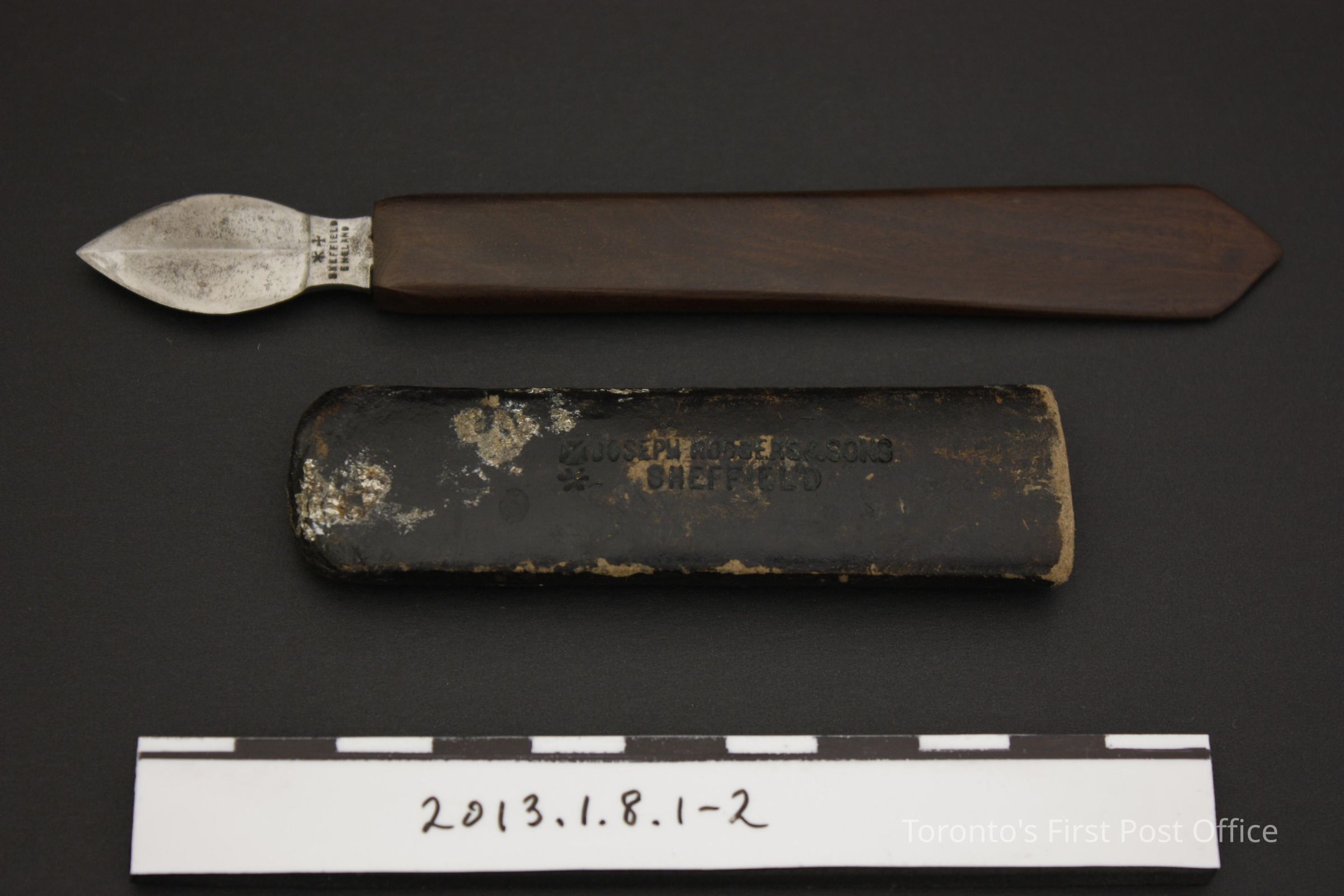 Double sided steel blade eraser knife with dark wood (Rosewood?) handle. Blade shaft has markings on both sides: two symbols, a star and a cross above 'Sheffield England' on one side; 'Rodgers Cutlers to her Majesty' on the other side. Hardened paper sheath with black coating, embossed with the two symbols, a star and a cross next to lettering 'Joseph Rodgers & sons / Sheffield'.Dimensions