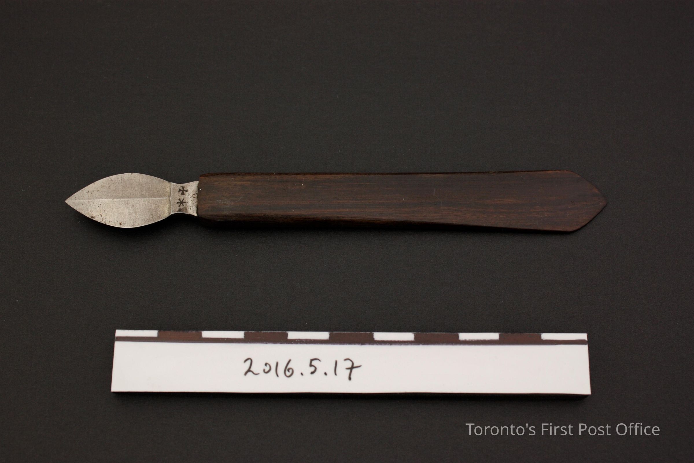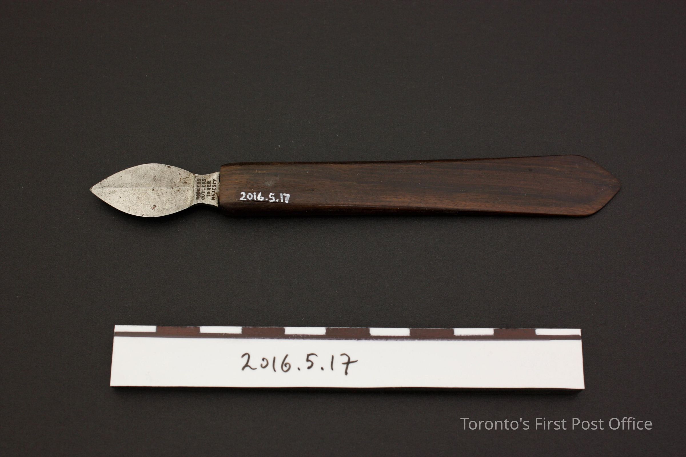 Double sided steel blade eraser knife with dark wood (Rosewood?) handle. Blade shaft has markings on both sides: two symbols, a star and a cross on one side; 'Rodgers Cutlers to her Majesty' on the other side.Made/Created