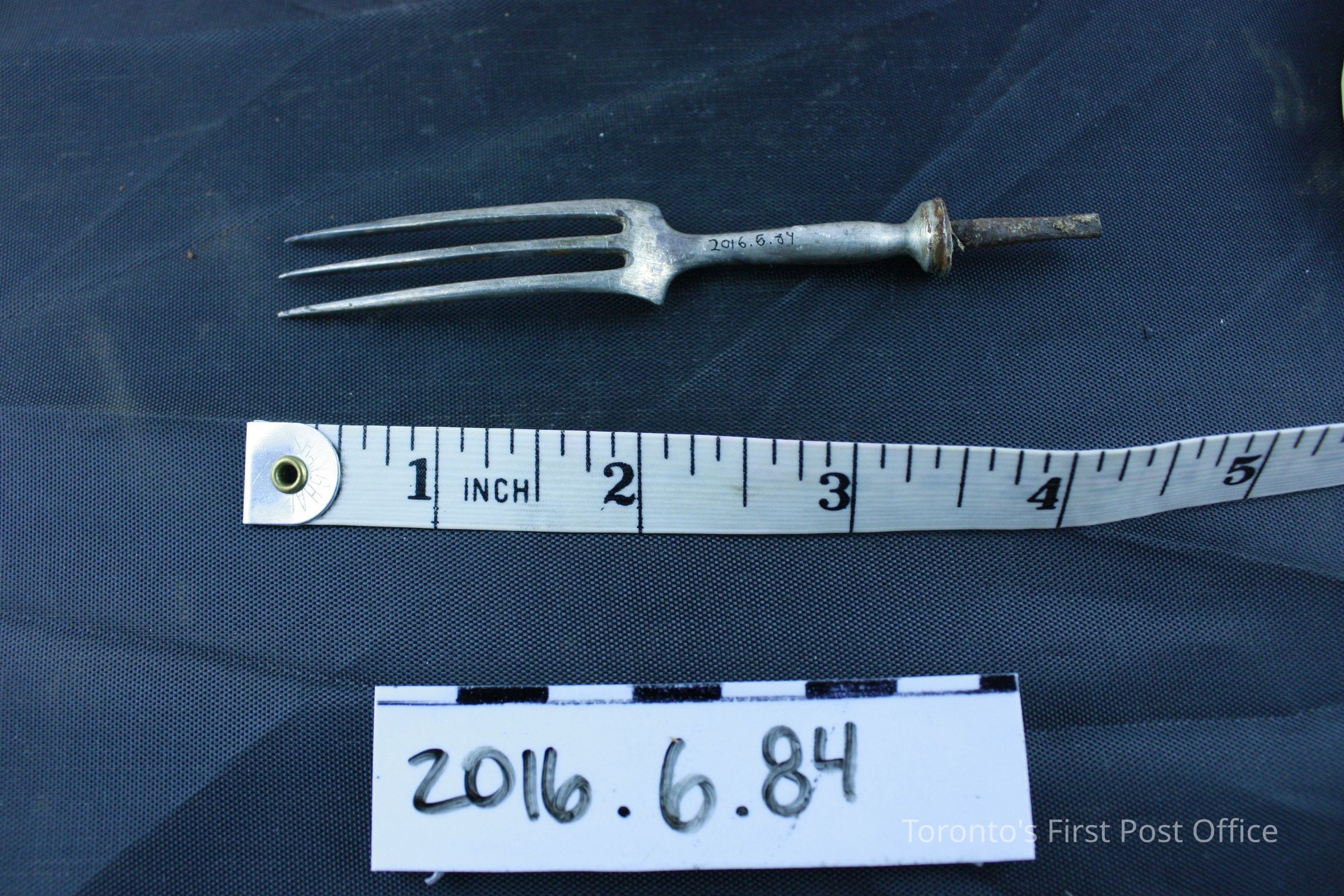 Nickel silver fork, missing handle. Three (3) tines form the head of the fork. Protruding from the base of the fork's neck is a metal spike, indicative of the missing handle.Dimensions