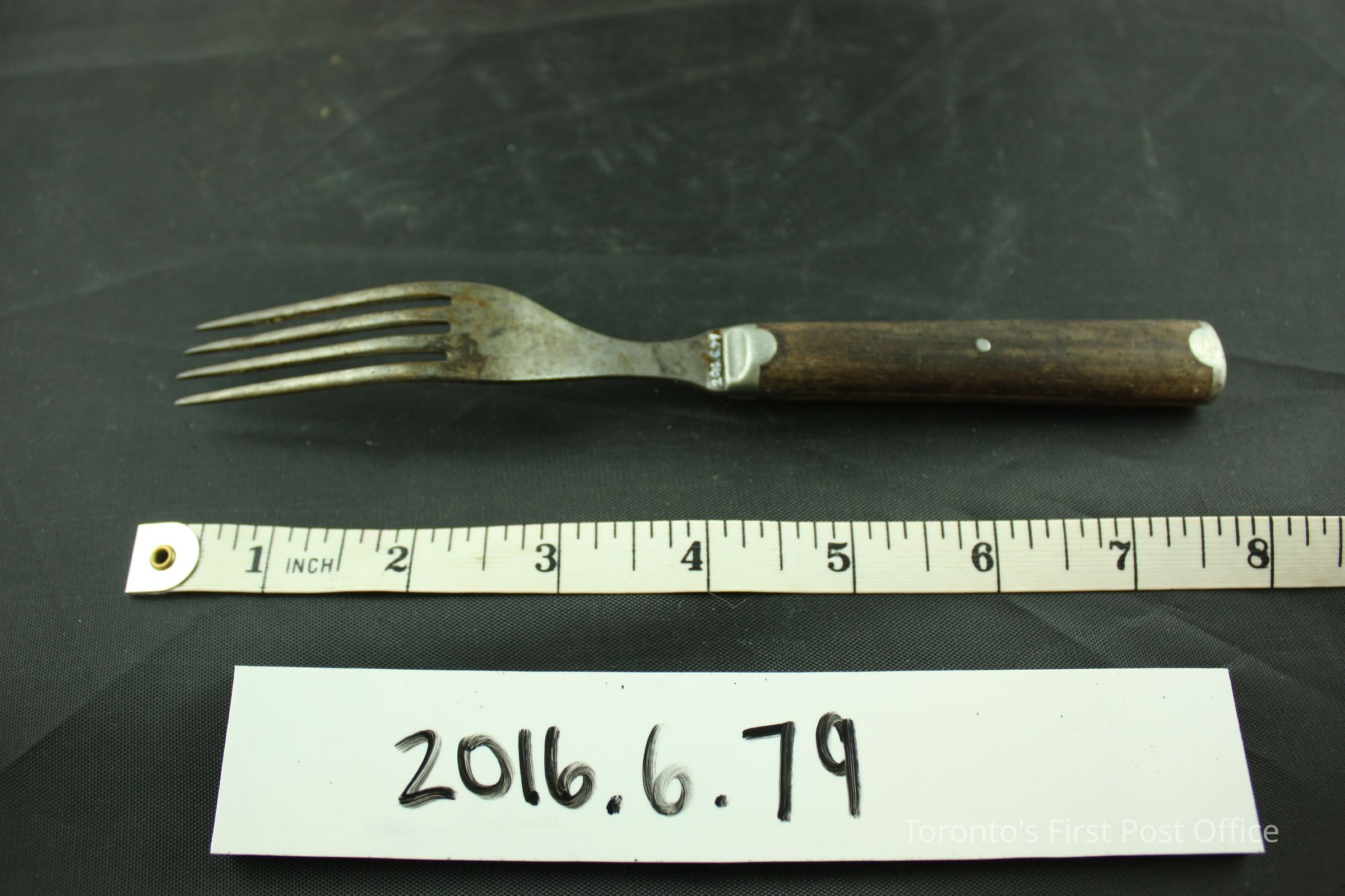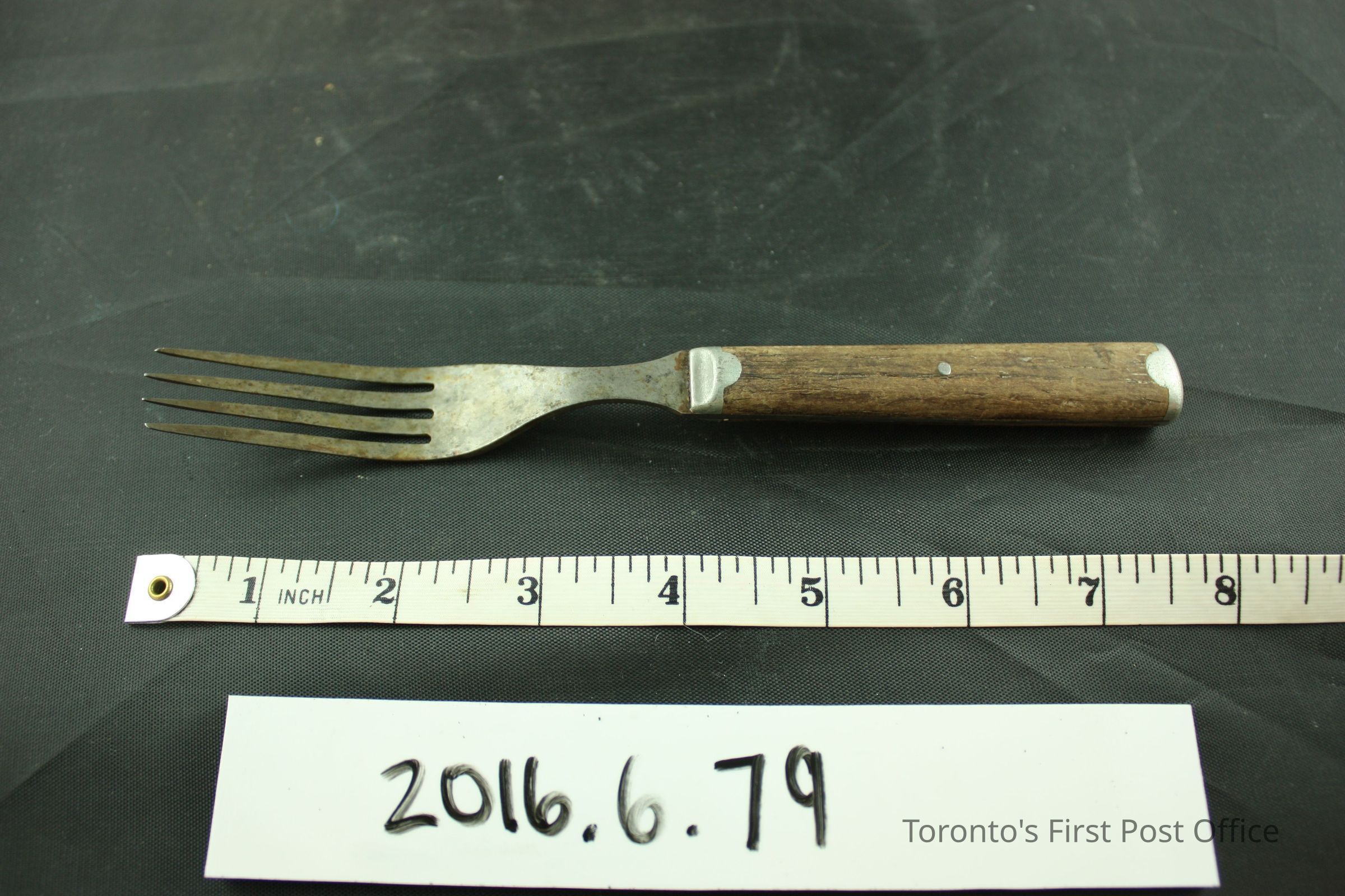 Steel fork with a wooden handle. Four (4) tines form the head of the fork. The handle is made of two (2) light coloured wooden panels, on the obverse and reverse, held together by one (1) rivet in the middle. The wood handle is laid on a frame of steal that extends to the butt. However the top, the rivet and the base of the handle is composed of a lighter, shinier metal.Dimensions