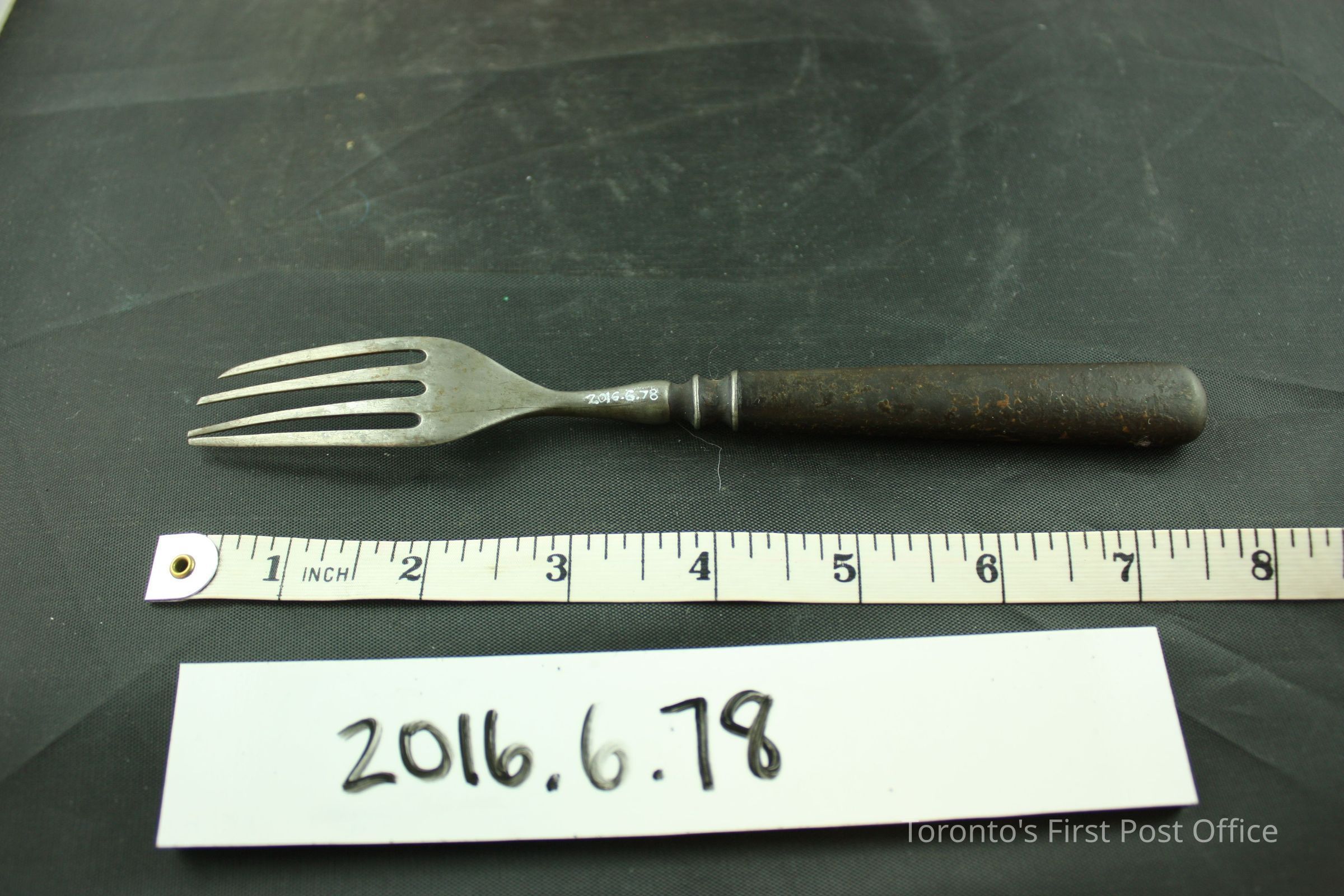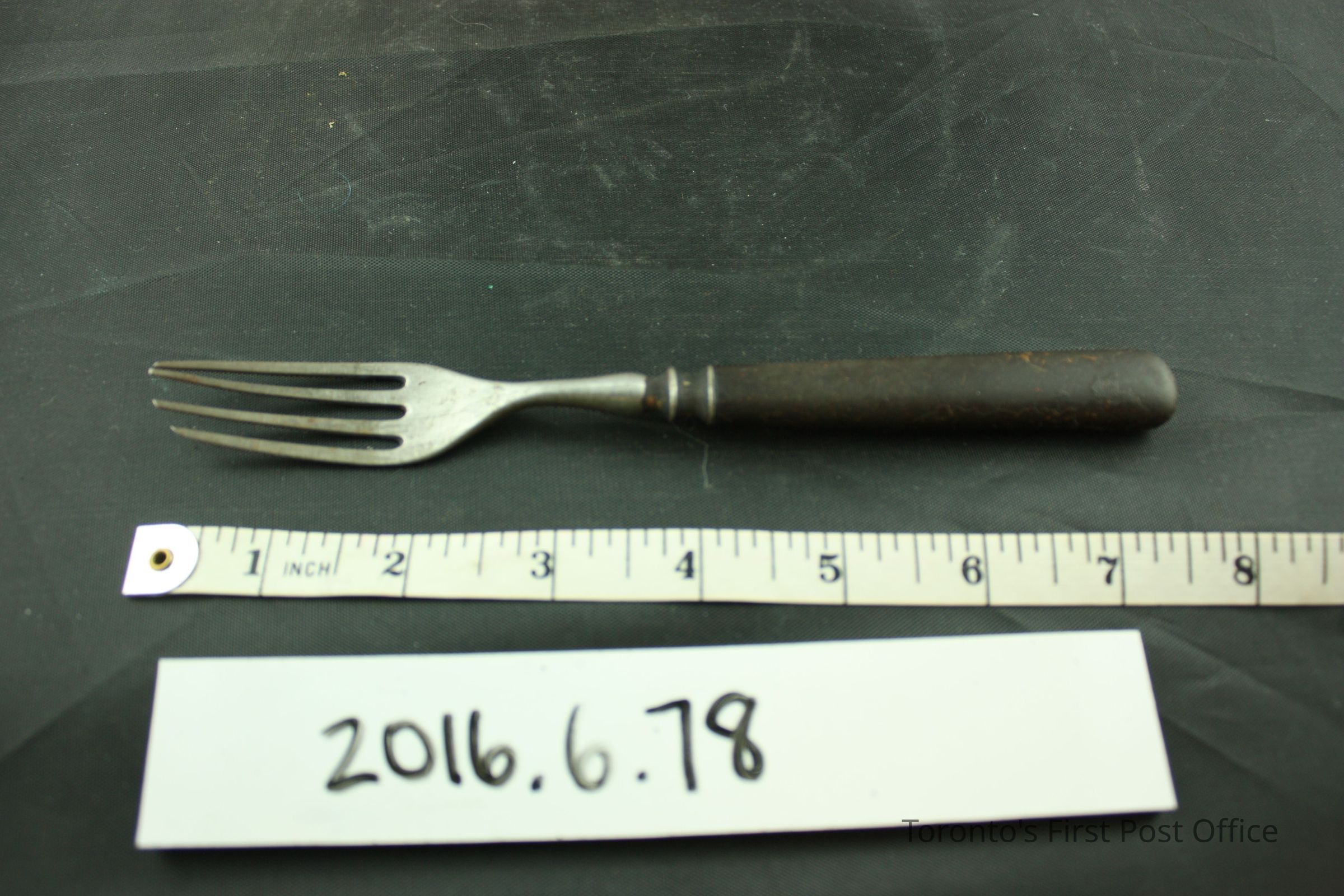 Steel fork with an unknown varnished handle. Four (4) irregularly long tines form the head of the fork. Two (2) circular grooves embellish the base of the head. The handle is composed of a solid piece of dark material that has been coated with a varnish.Dimensions