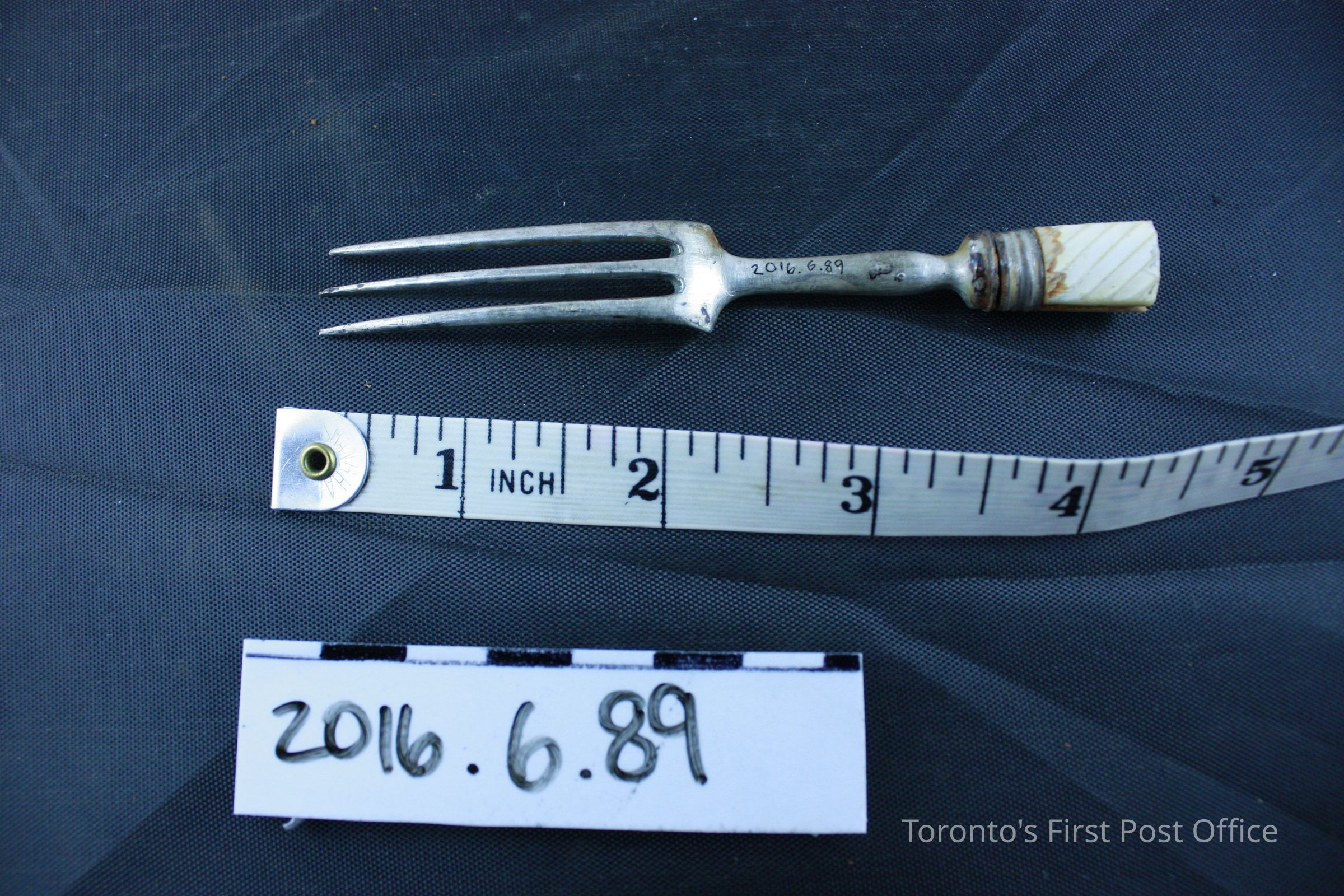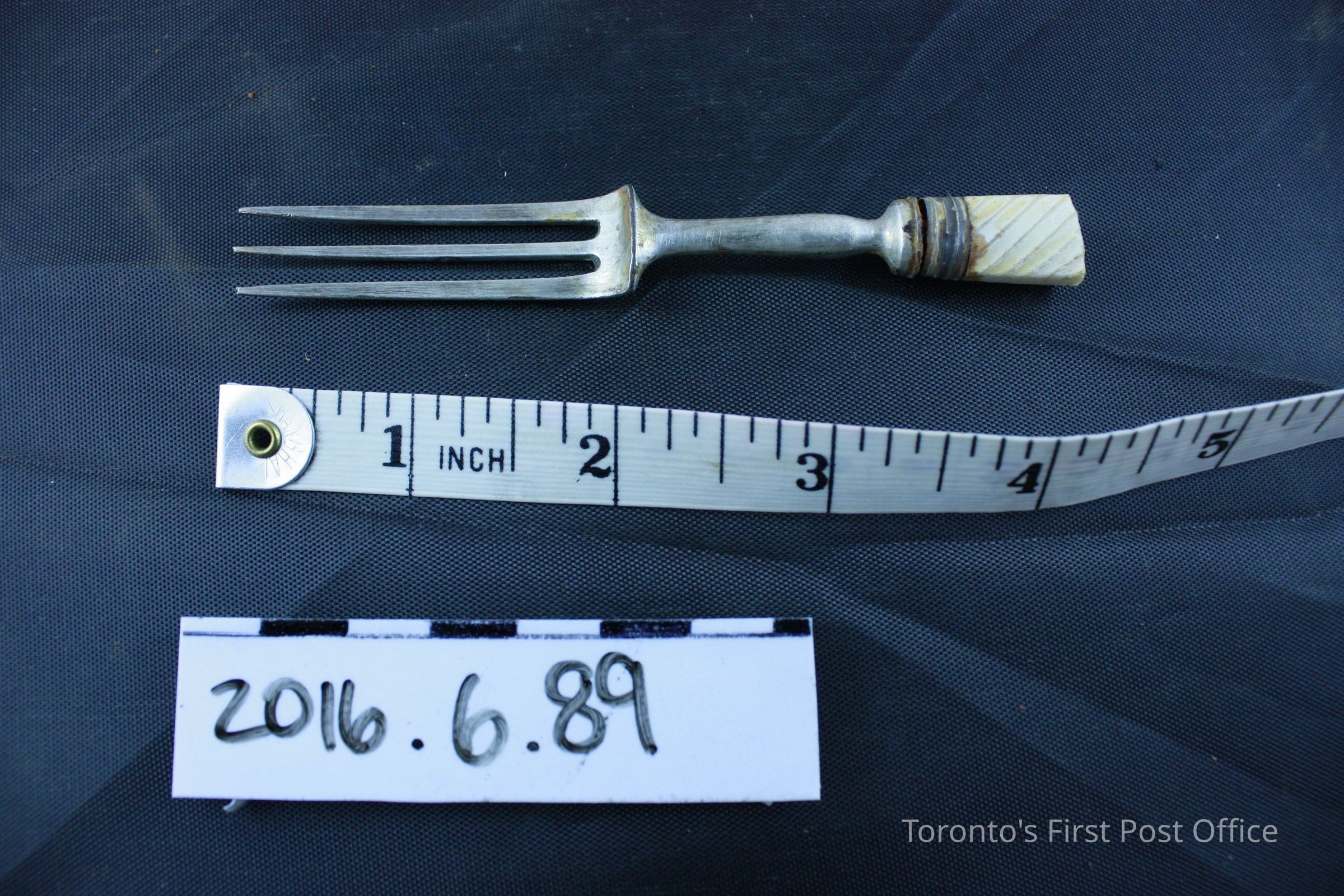Nickel silver fork, missing part of ivory handle. Three (3) tines form the head of the fork. Attached to the neck of the fork by a darker nickel band is a portion of the original ivory handle. Where the handle has been cut or broken off, a wooden rod which is then inlaid with a nickel (?) rod, is in the center that would have kept the handle in place. The handle is marked by diagonal ridges as ornamentation.Dimensions