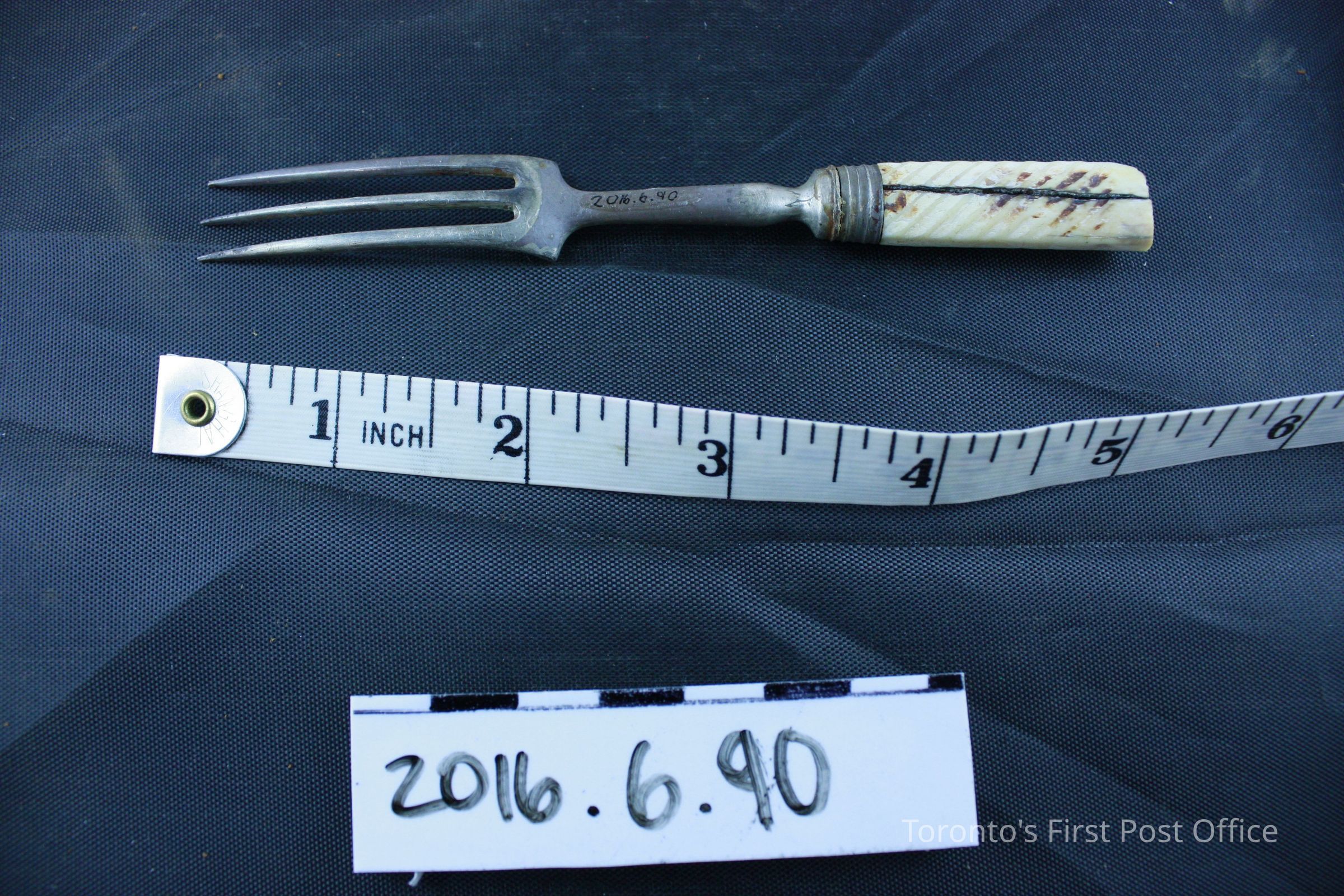 Nickel silver fork, missing part of ivory handle. Three (3) tines form the head of the fork. Attached to the neck of the fork by a darker nickel band is a portion of the original ivory handle. Where the handle has been cut or broken off, a wooden rod is in the center that would have kept the handle in place. The handle is marked by diagonal ridges as ornamentation.Dimensions