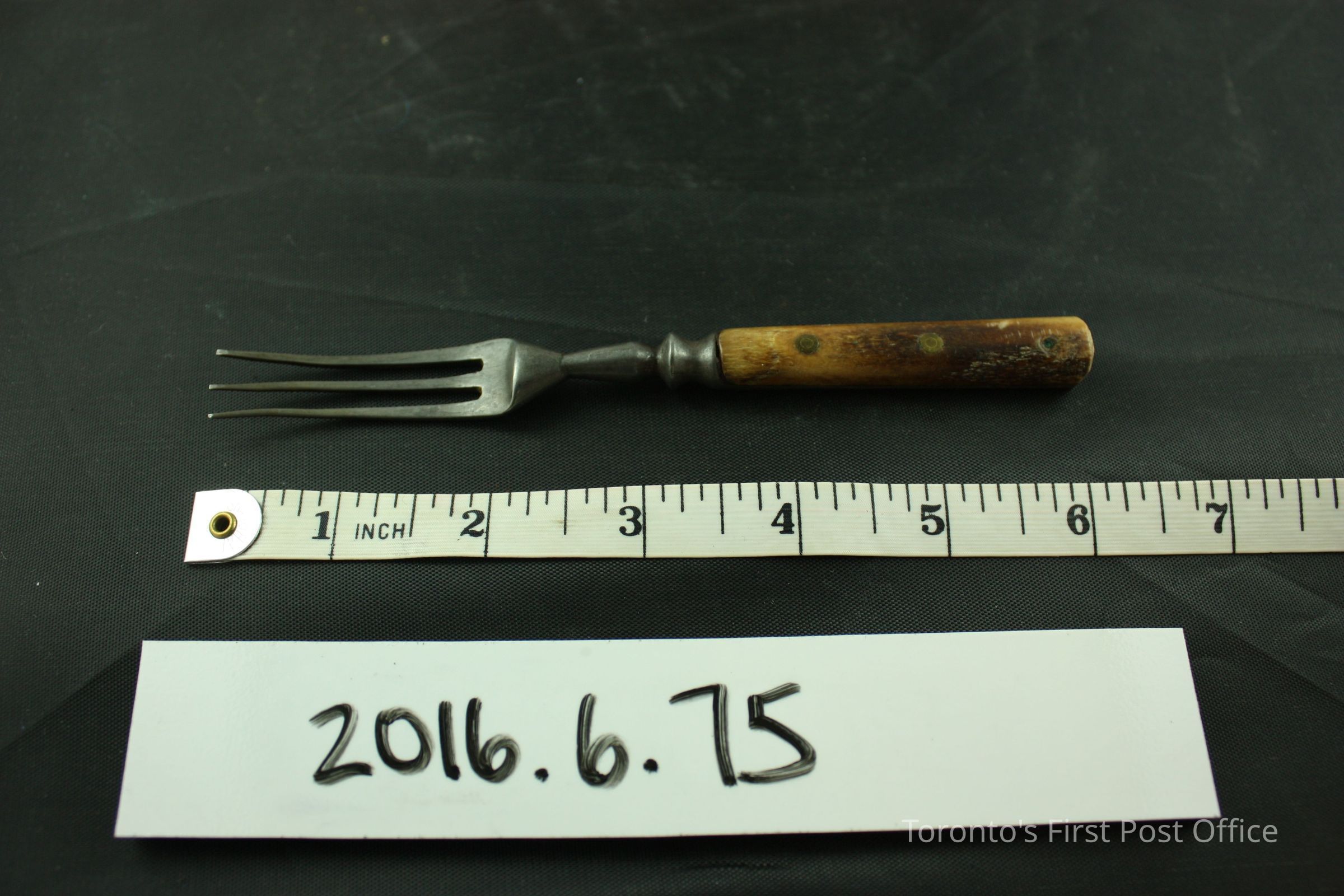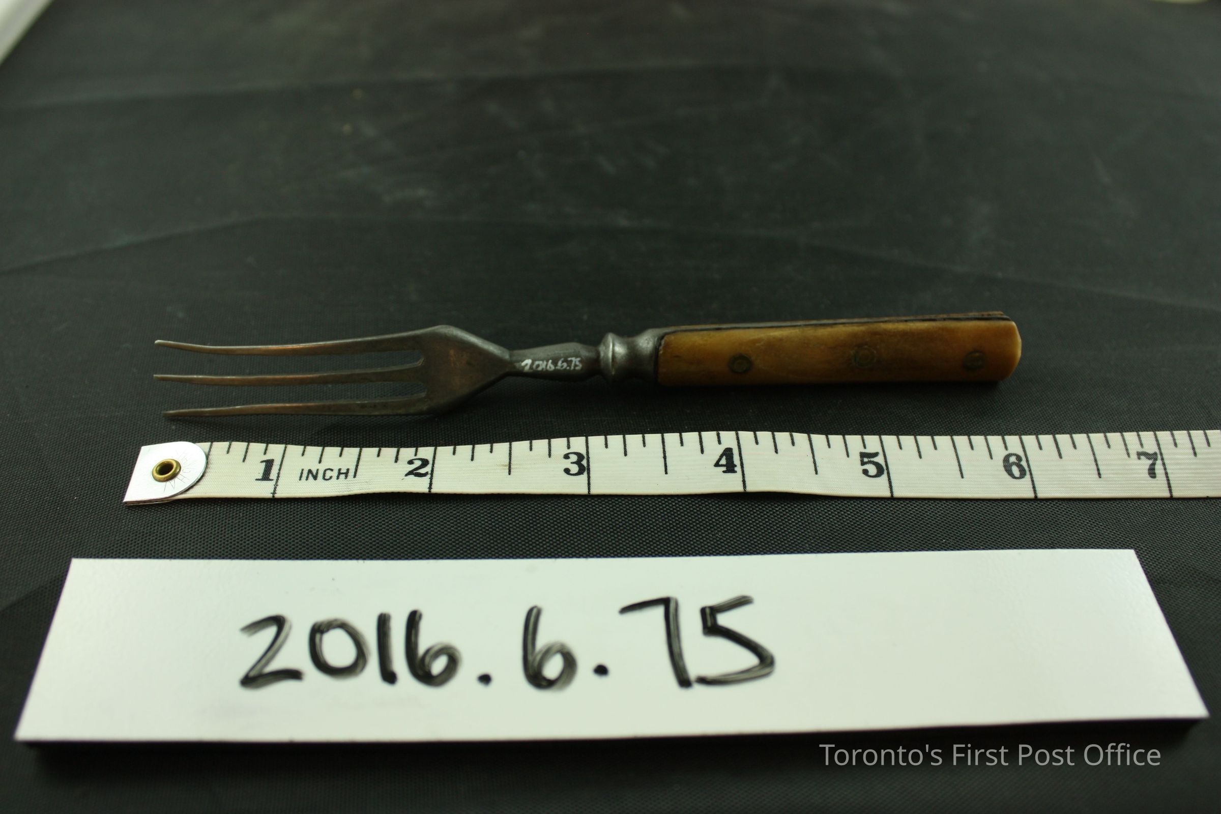 Steel fork with a bone handle that has three (3) brass rivets holding it together. There are three (3) tines (prongs) and the steel runs all the way down to the bottom of the handle.Dimensions