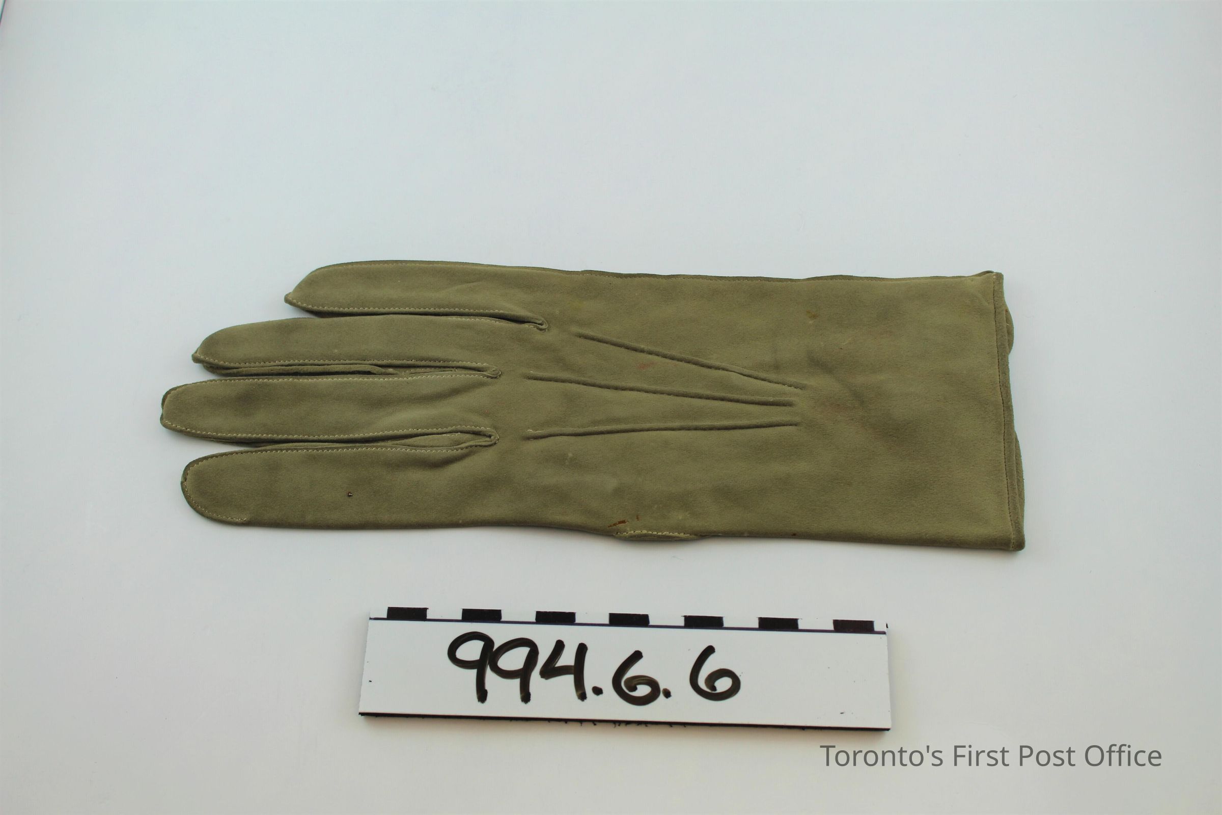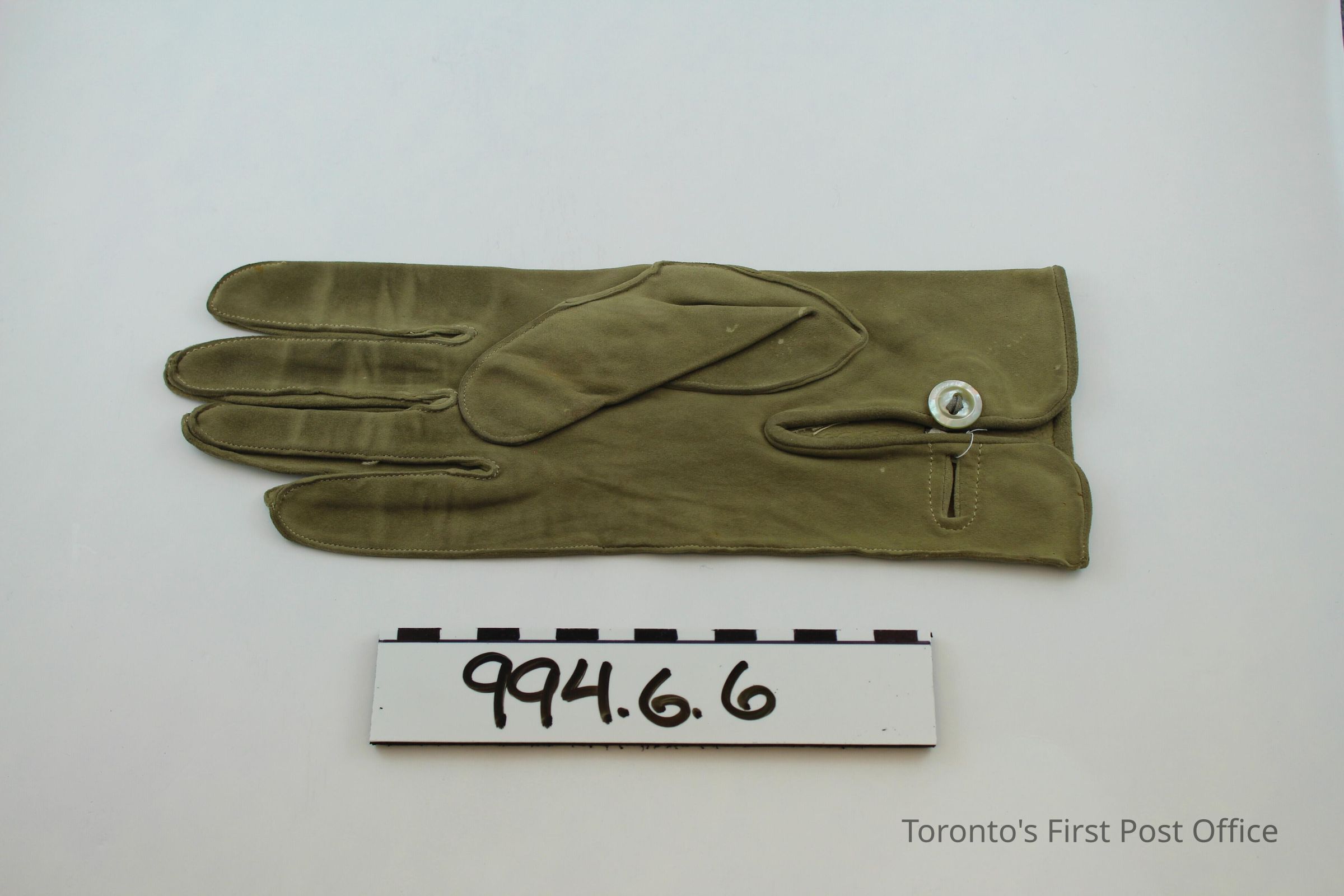 One right hand glove; grey kid leather; one mother-of-pearl button at inner wrist; three lines of decorative stitching on back; interior of glove at outer wrist reads: "K6363 118225".Dimensions