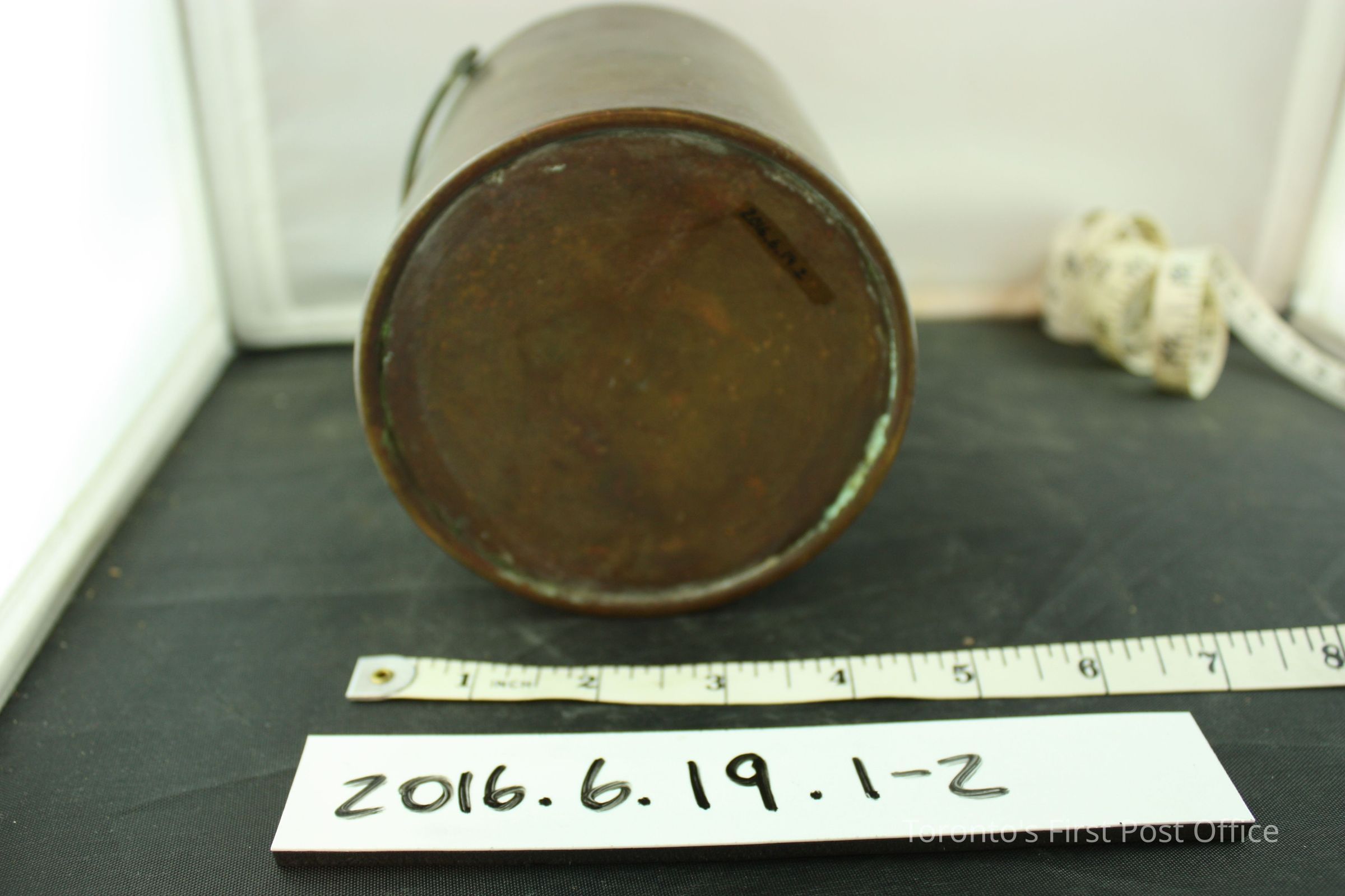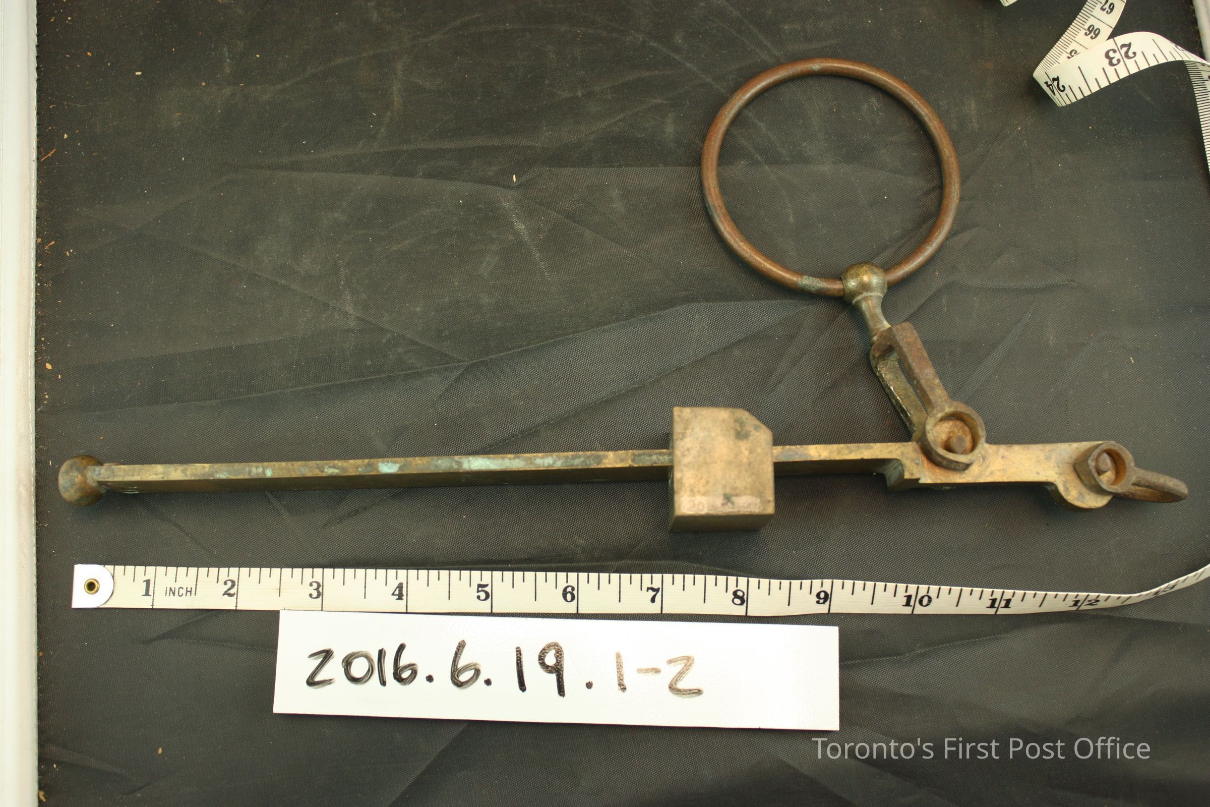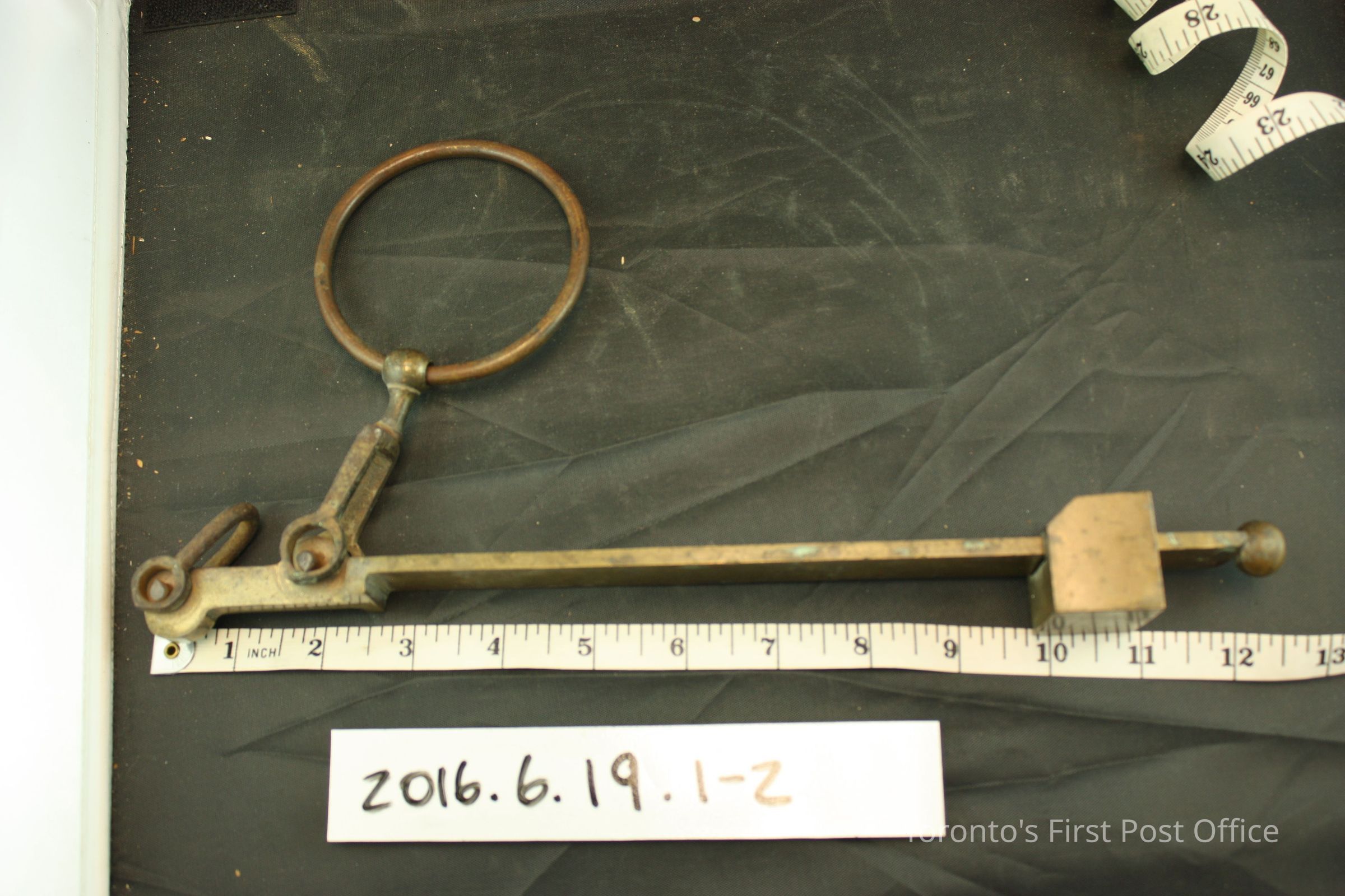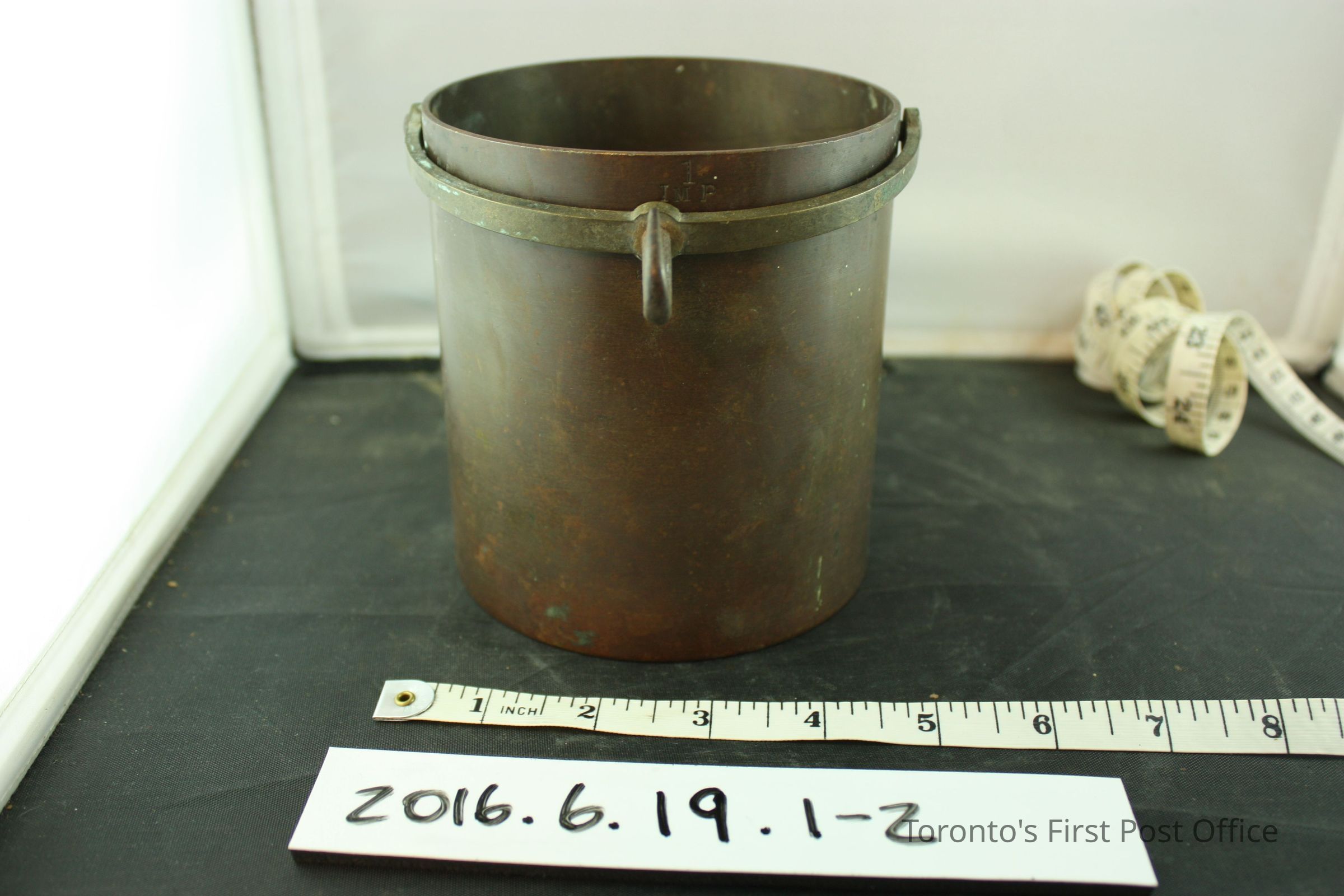 Brass hand held grain scale balance and measure container. Scale balance has a loop handle and a slide weight. 'D' shaped loop at one end of the balance for hook on measure container handle to attach to. '1/Imp/Quart' on front of measure container. Makers mark symbol under lettering, '8' and 'VR/H' under crown symbol. Same makers mark on slide weight on scale balance.Dimensions