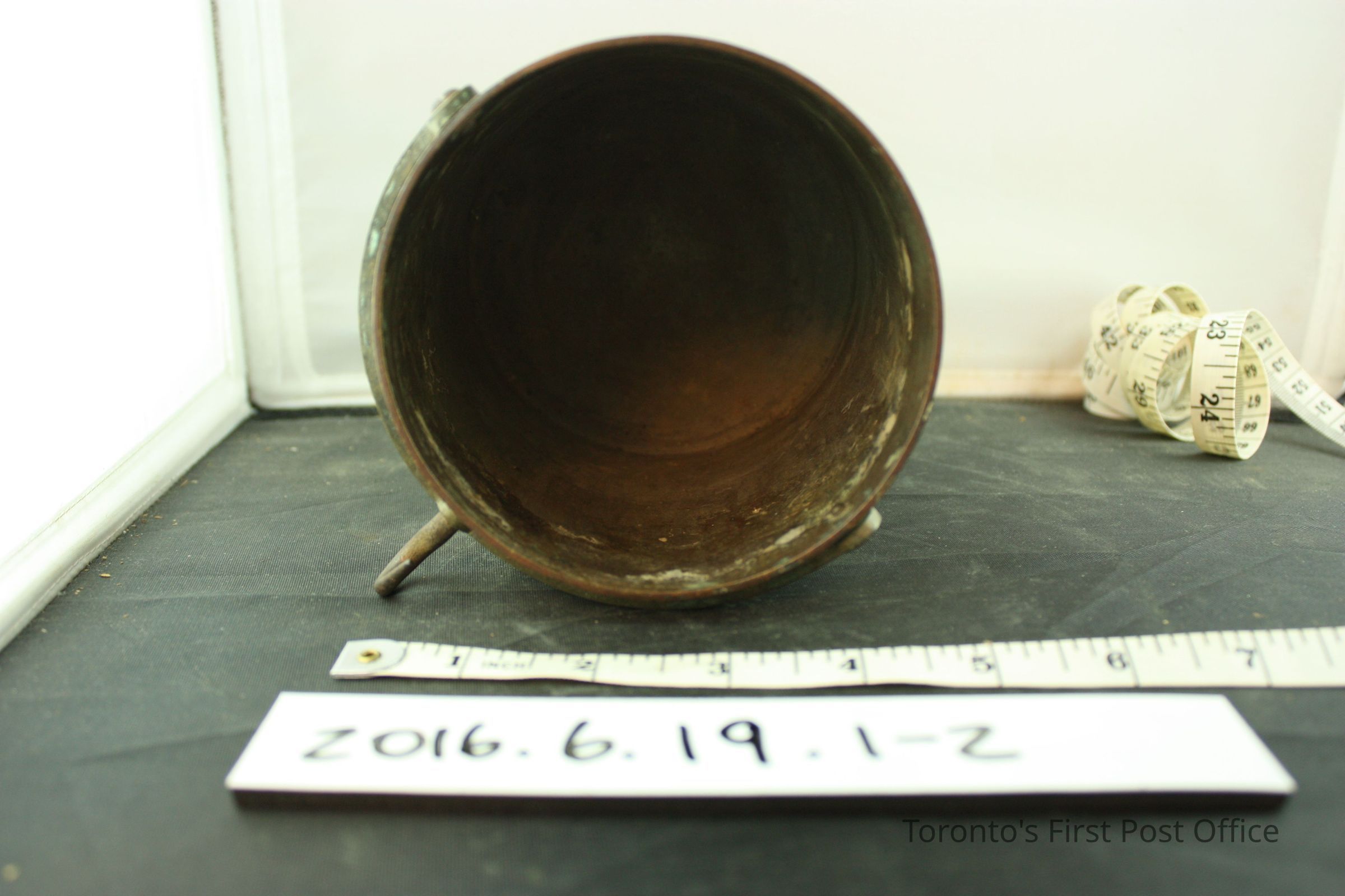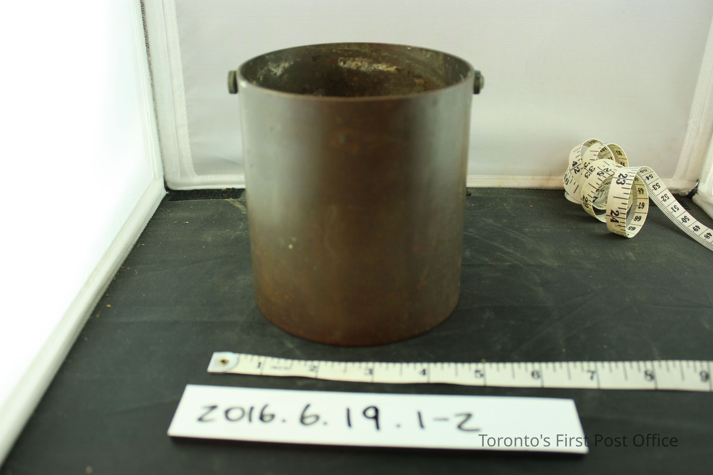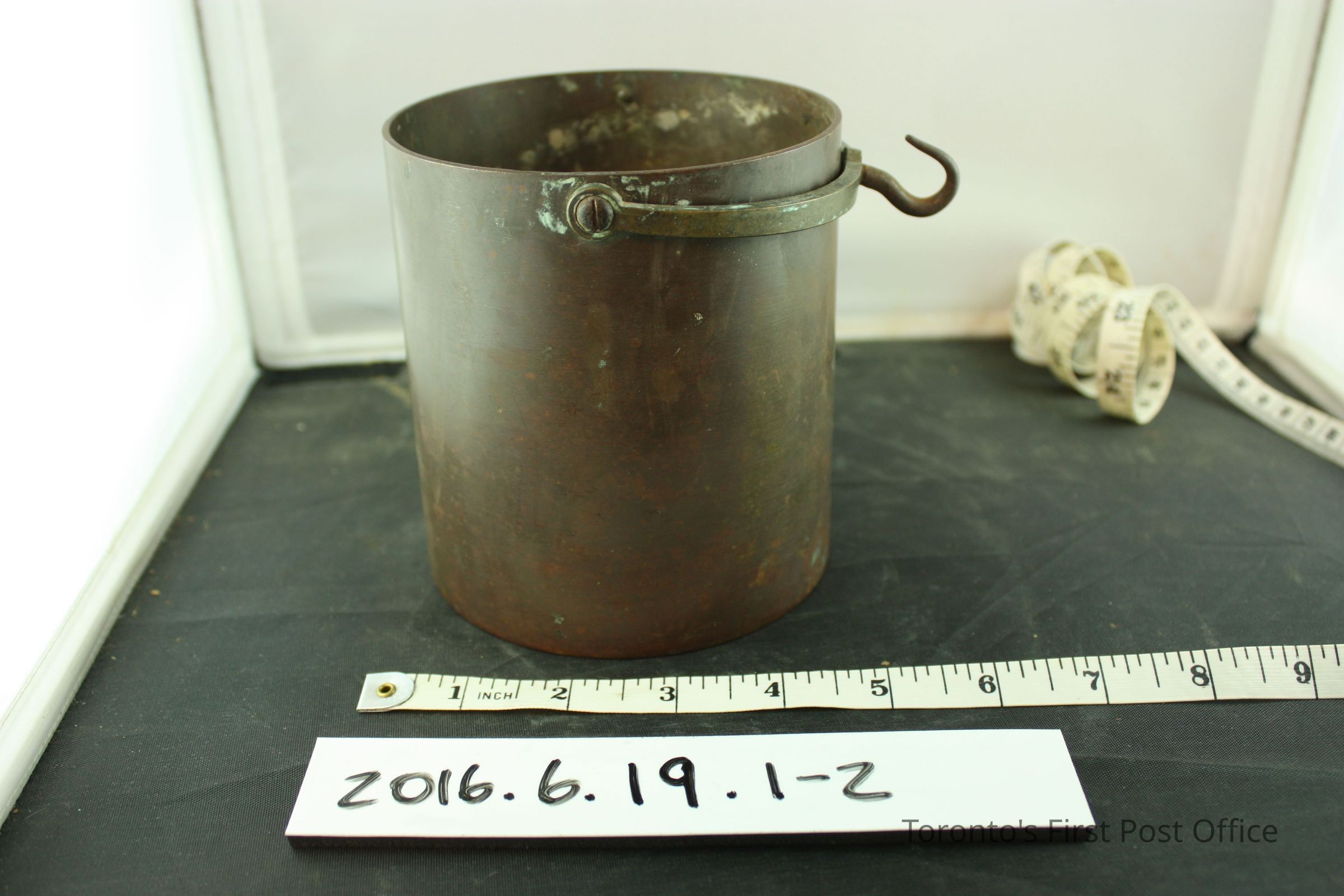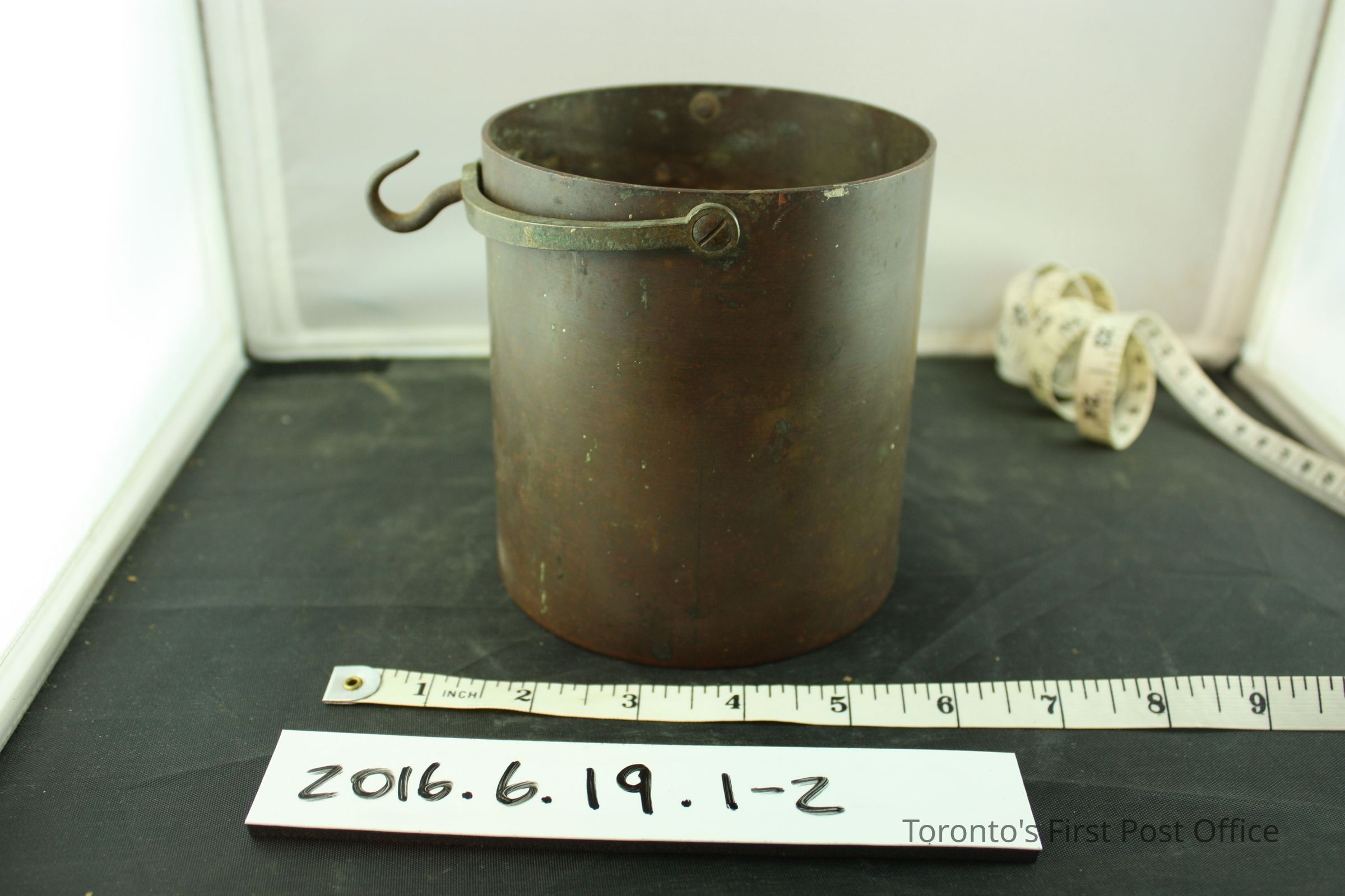 Brass hand held grain scale balance and measure container. Scale balance has a loop handle and a slide weight. 'D' shaped loop at one end of the balance for hook on measure container handle to attach to. '1/Imp/Quart' on front of measure container. Makers mark symbol under lettering, '8' and 'VR/H' under crown symbol. Same makers mark on slide weight on scale balance.Dimensions
