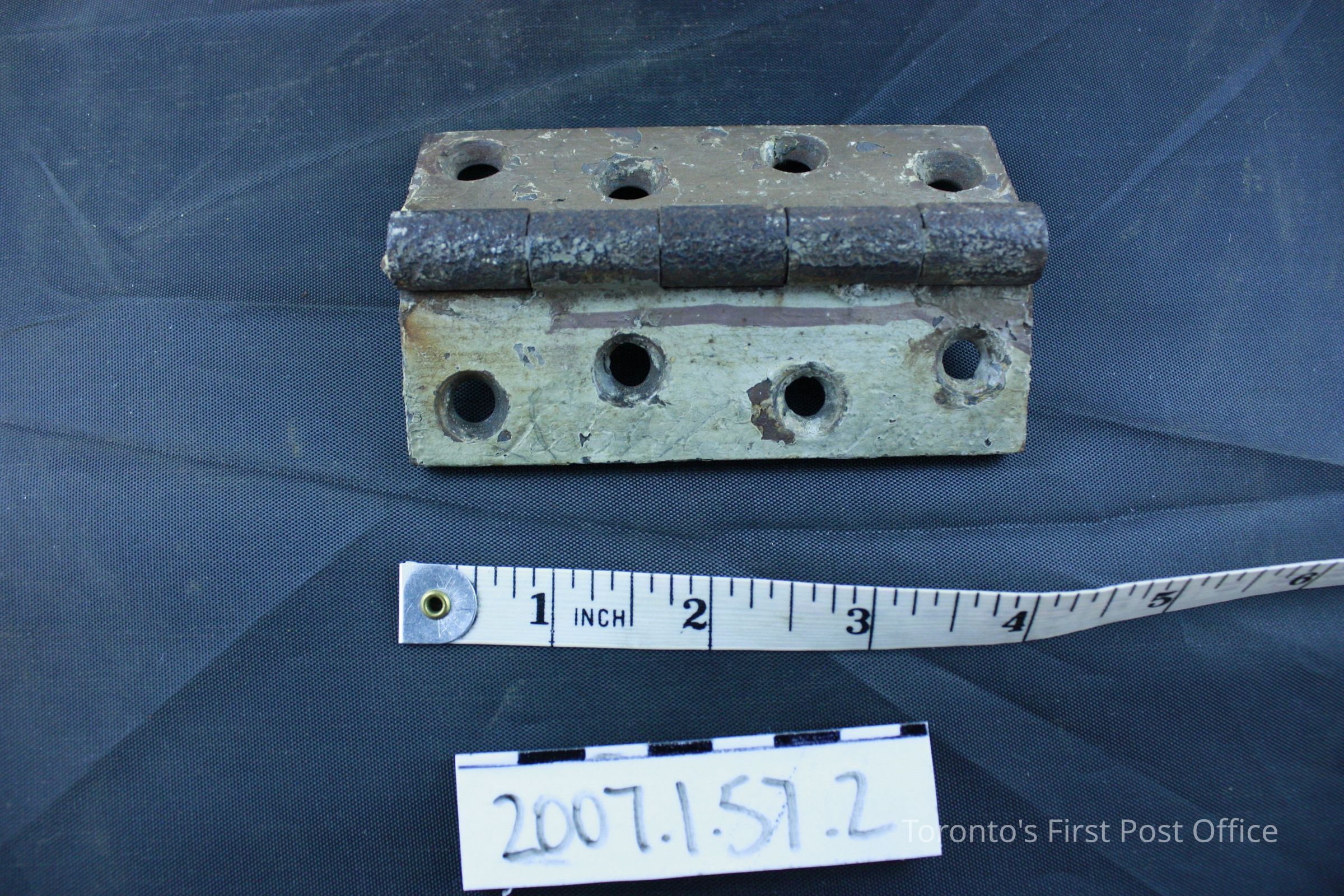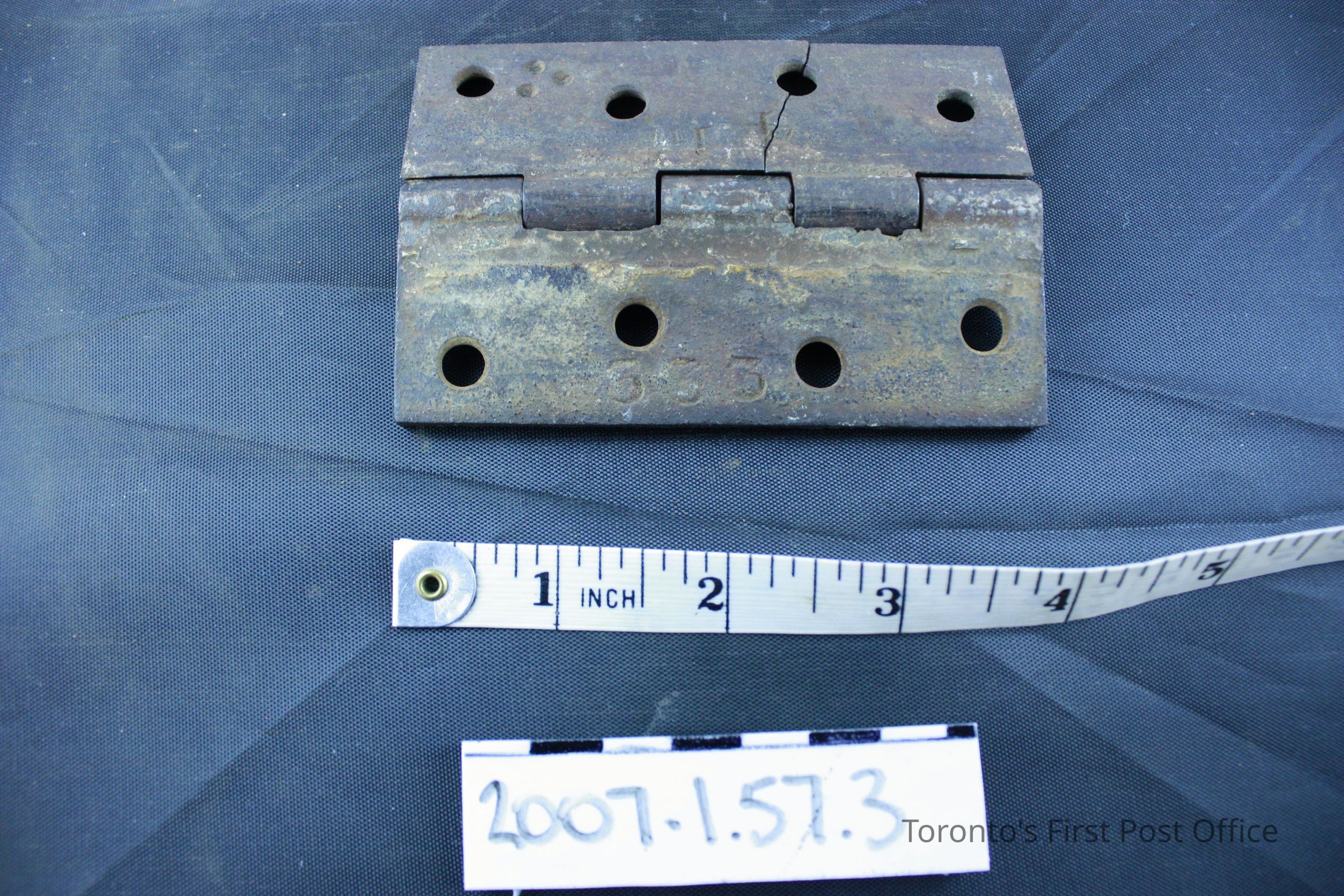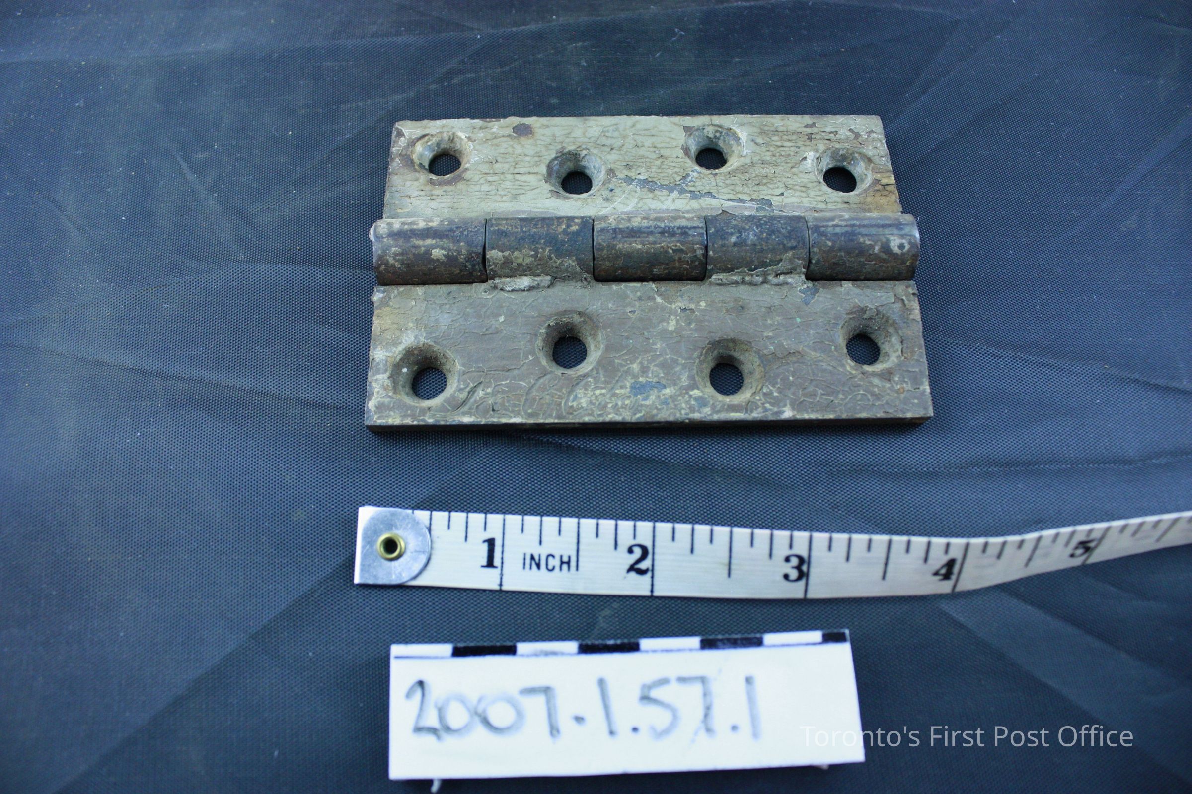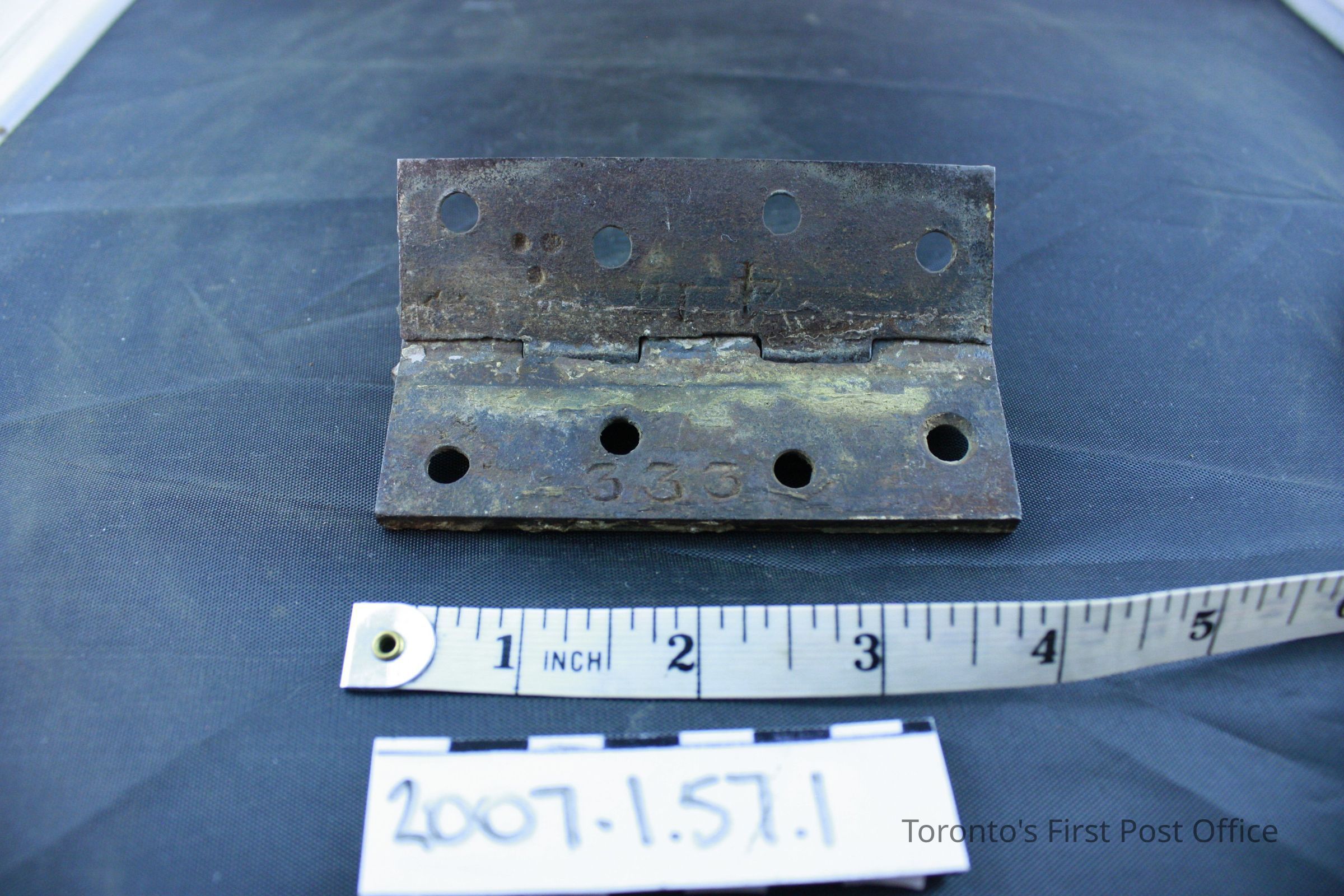 Three iron hinges; five part hinge; four screw holes in each side; each marked "333" and "4 in" and three dots in triangle pattern on back; each coated with grey-green paint with drips of red-brown paint; from the Bank of Upper Canada Building at Duke and George, 1827; removed 1981.Dimensions