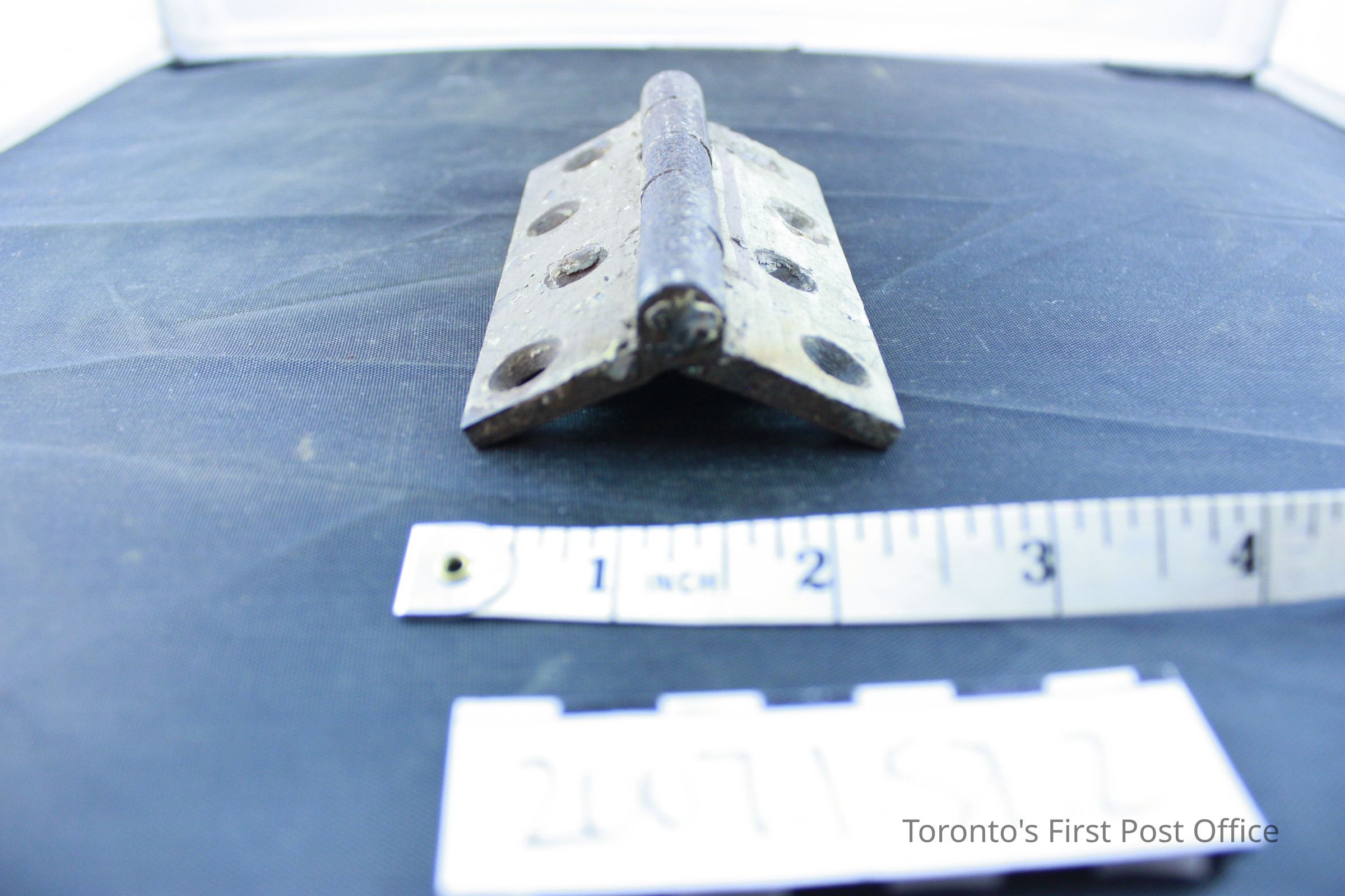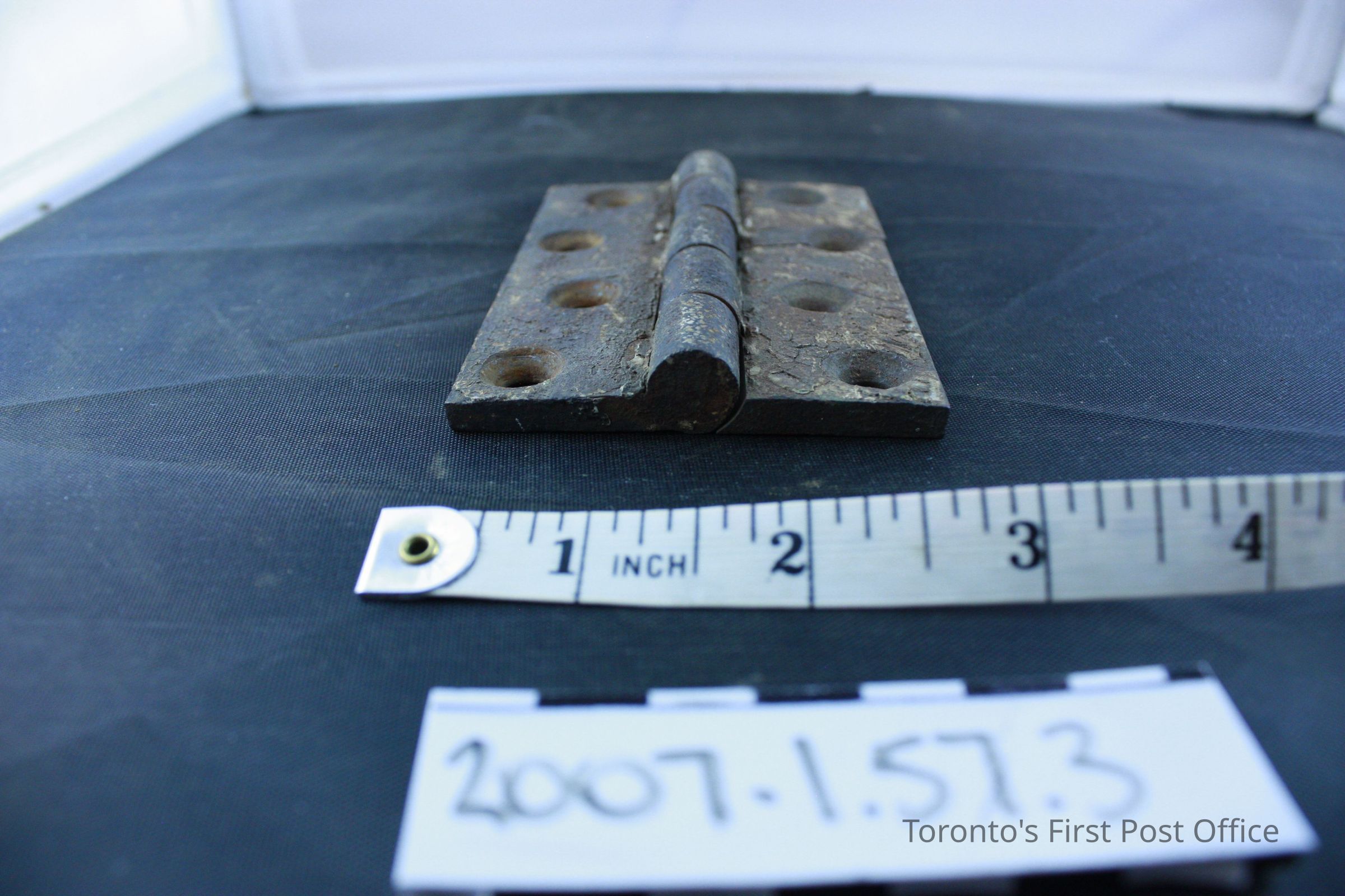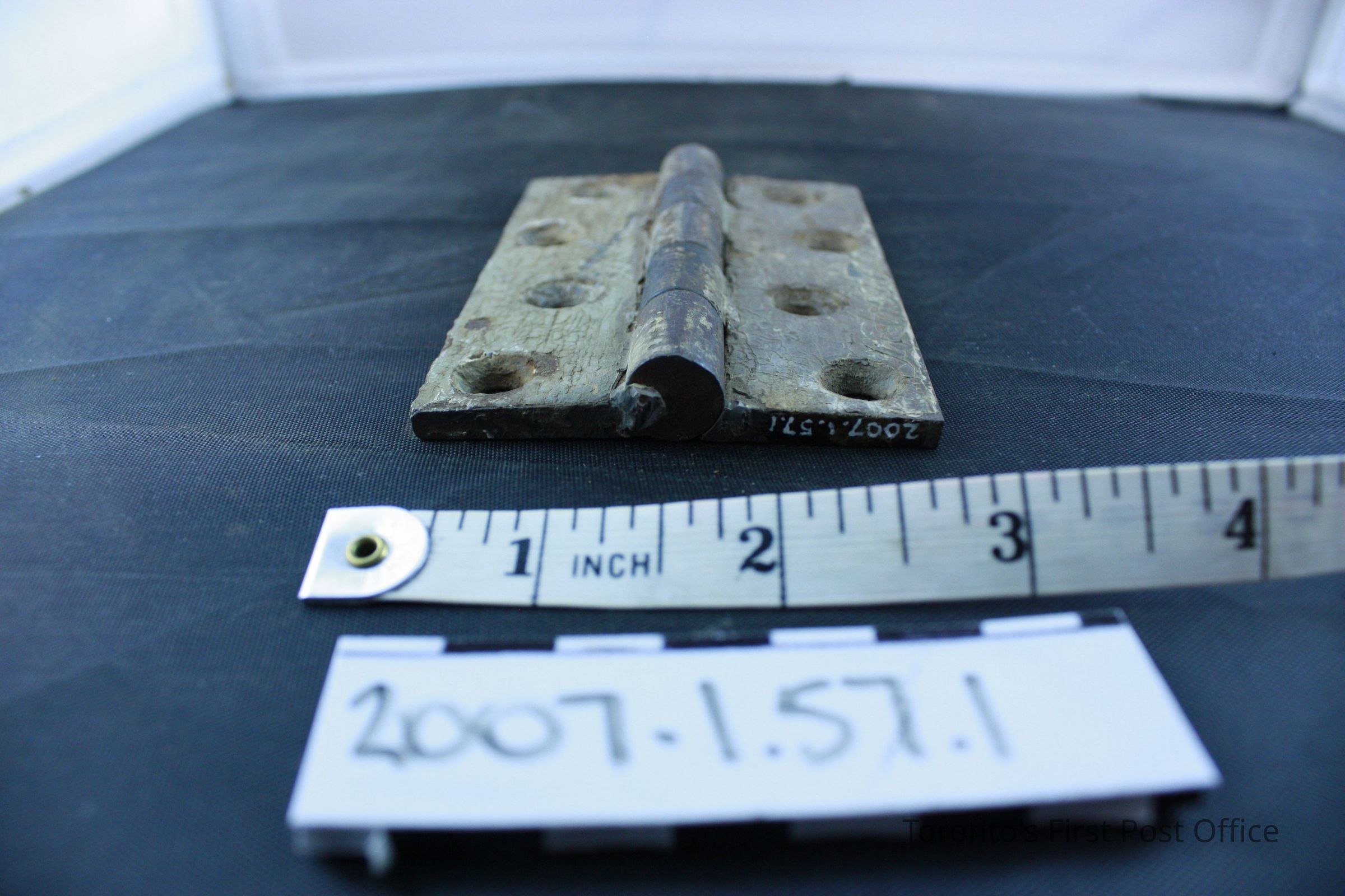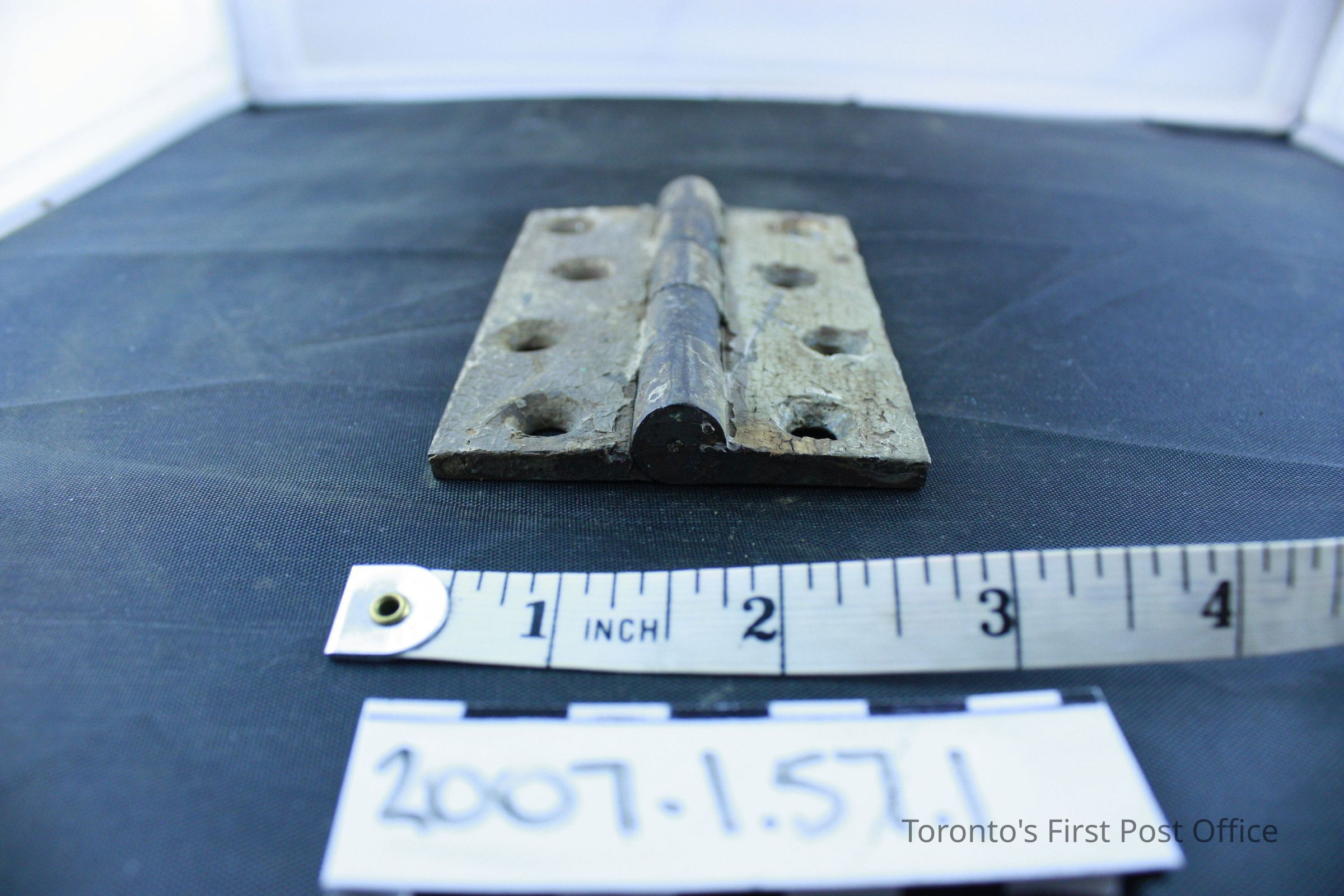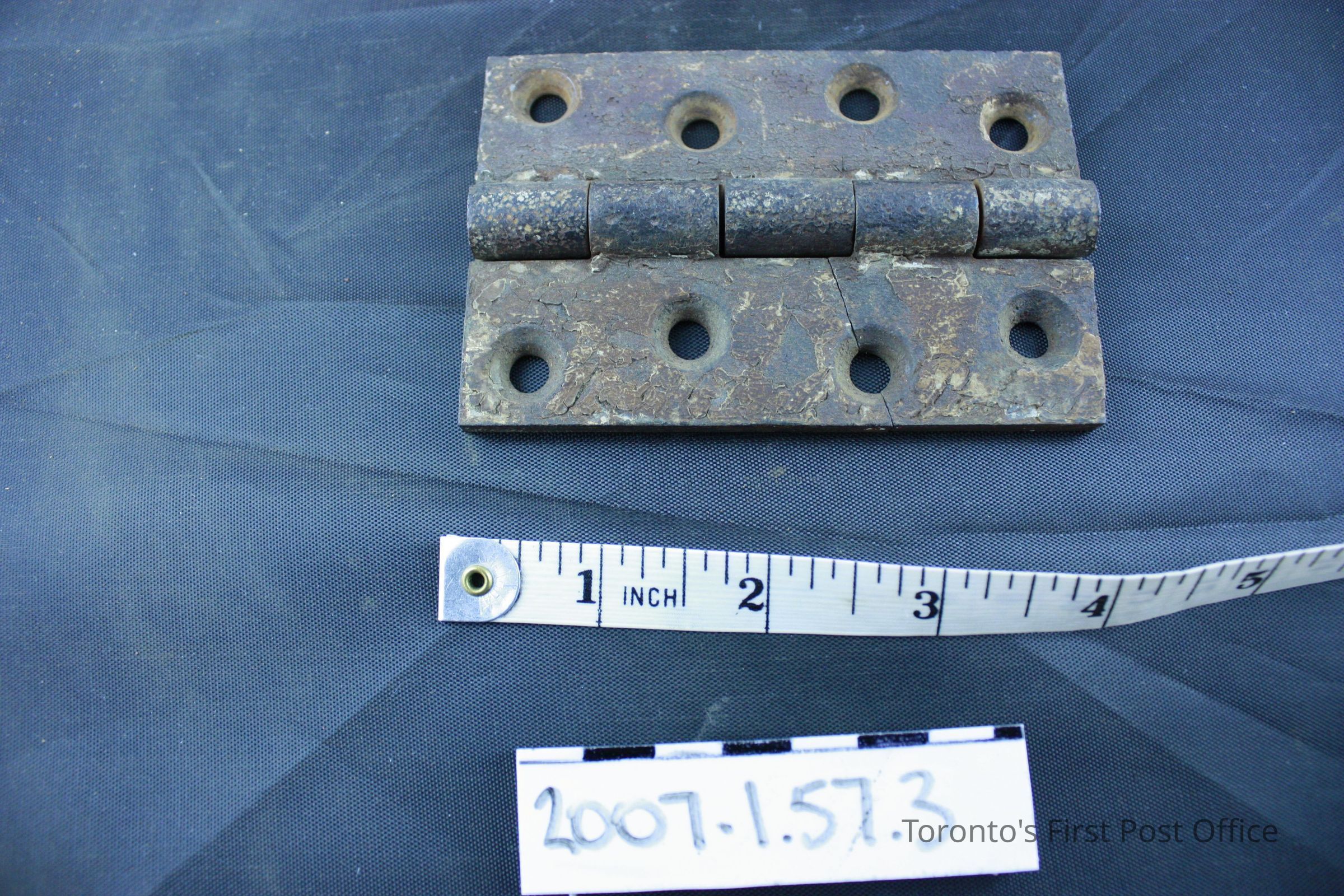 Three iron hinges; five part hinge; four screw holes in each side; each marked "333" and "4 in" and three dots in triangle pattern on back; each coated with grey-green paint with drips of red-brown paint; from the Bank of Upper Canada Building at Duke and George, 1827; removed 1981.Dimensions