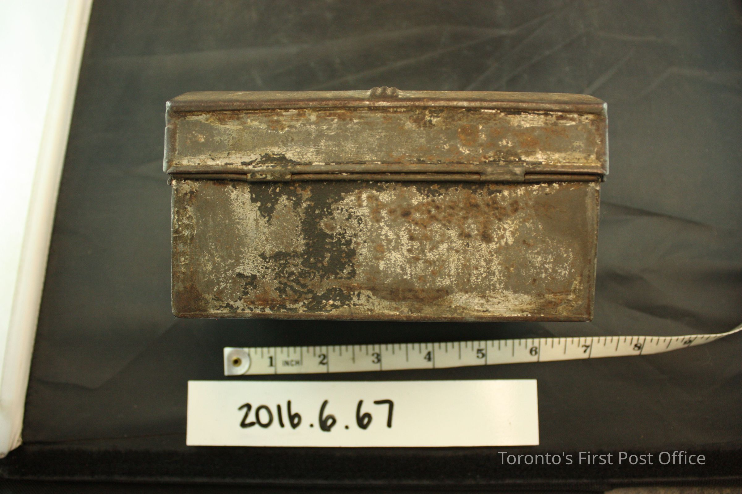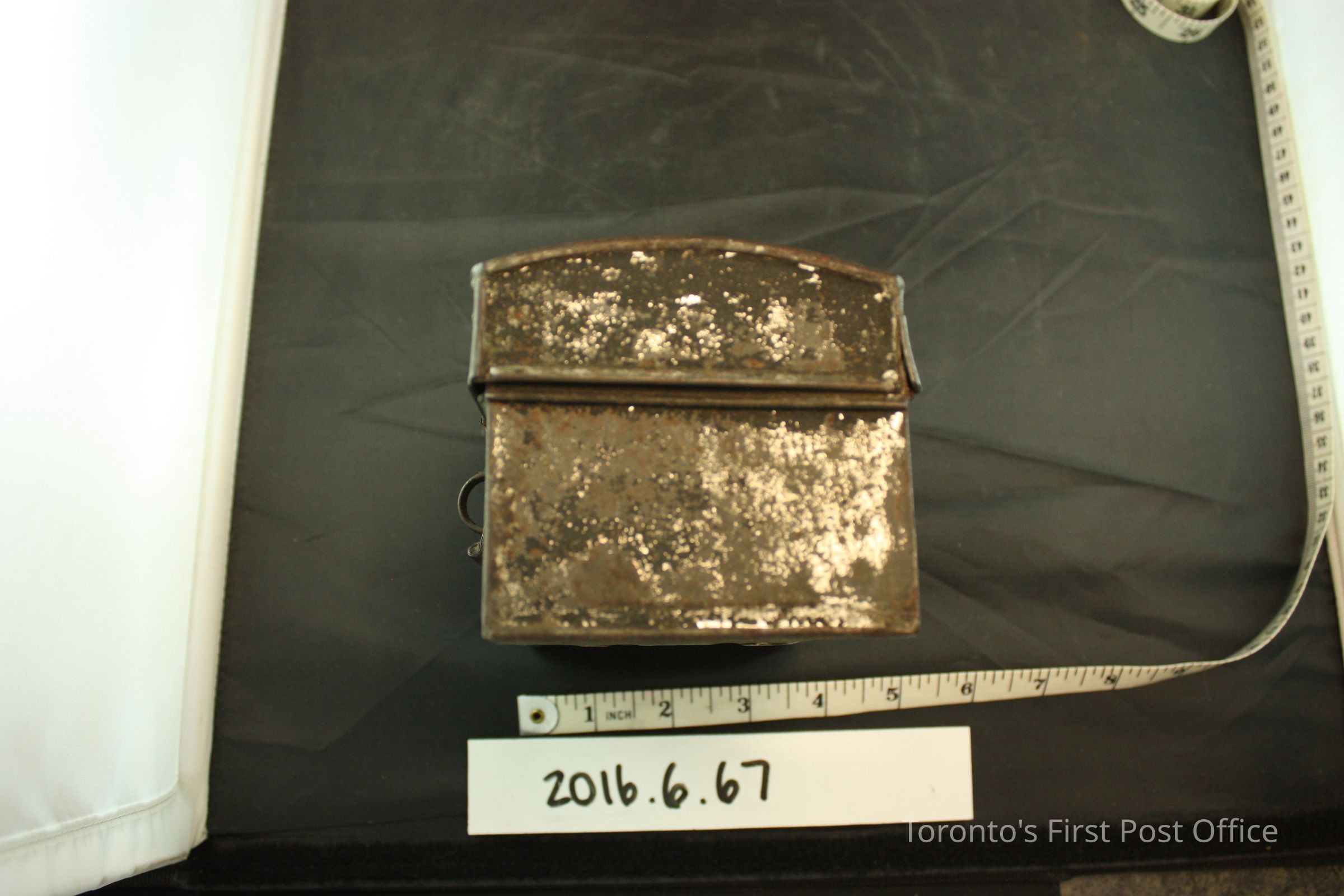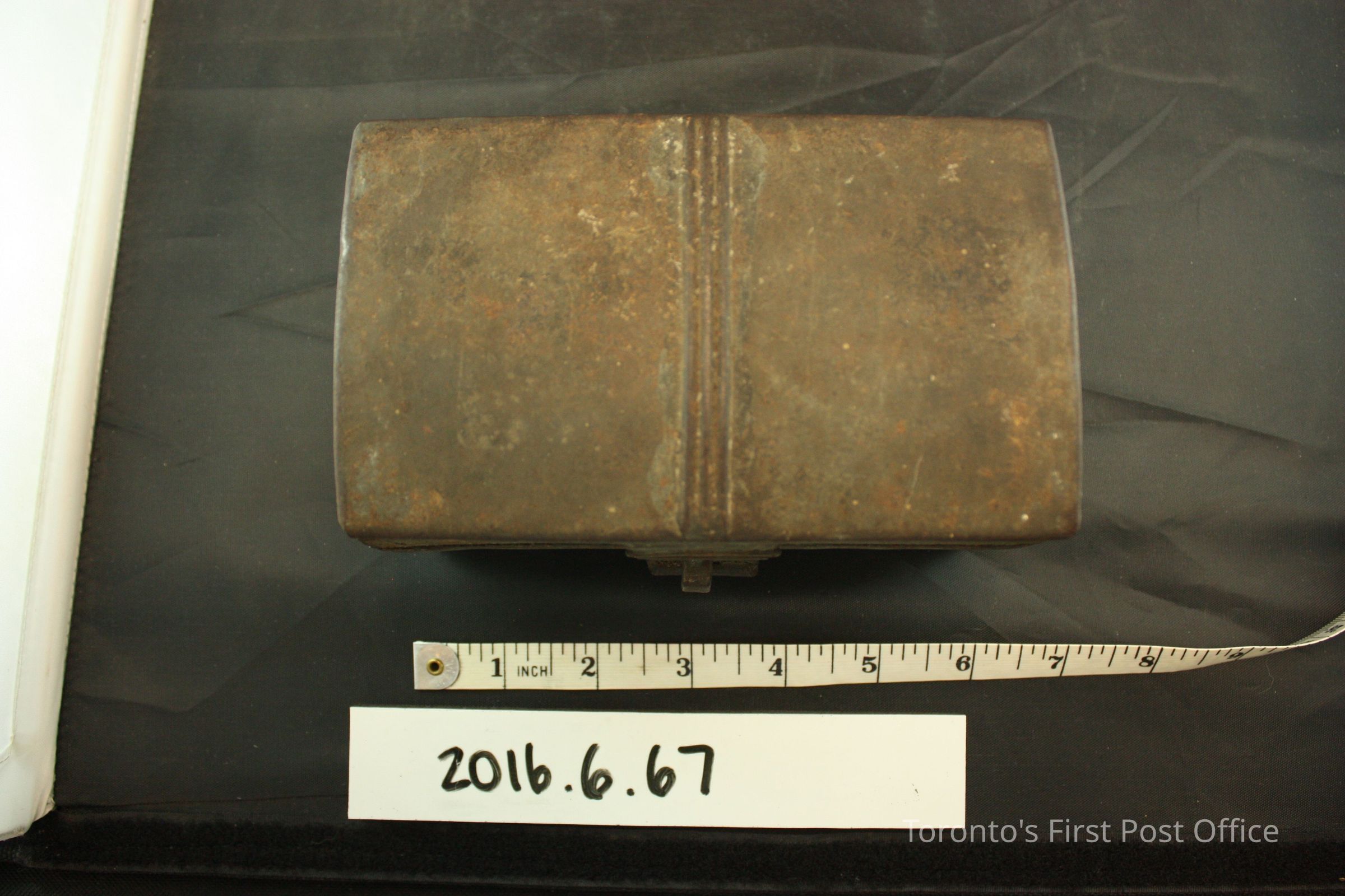 Domed tin (?) box with hinged lid. Lid swings away at 180° and is characterized by an additional metal band ornament in the middle. The rectangular latch catchs on a protruding metal hoop, is unlocked. A saudered lighter colour metal runs down the middle of the interior of the box, perhaps as a repair. Most likely painted entirely in black, paint pigments remain on the surface of the box.Dimensions