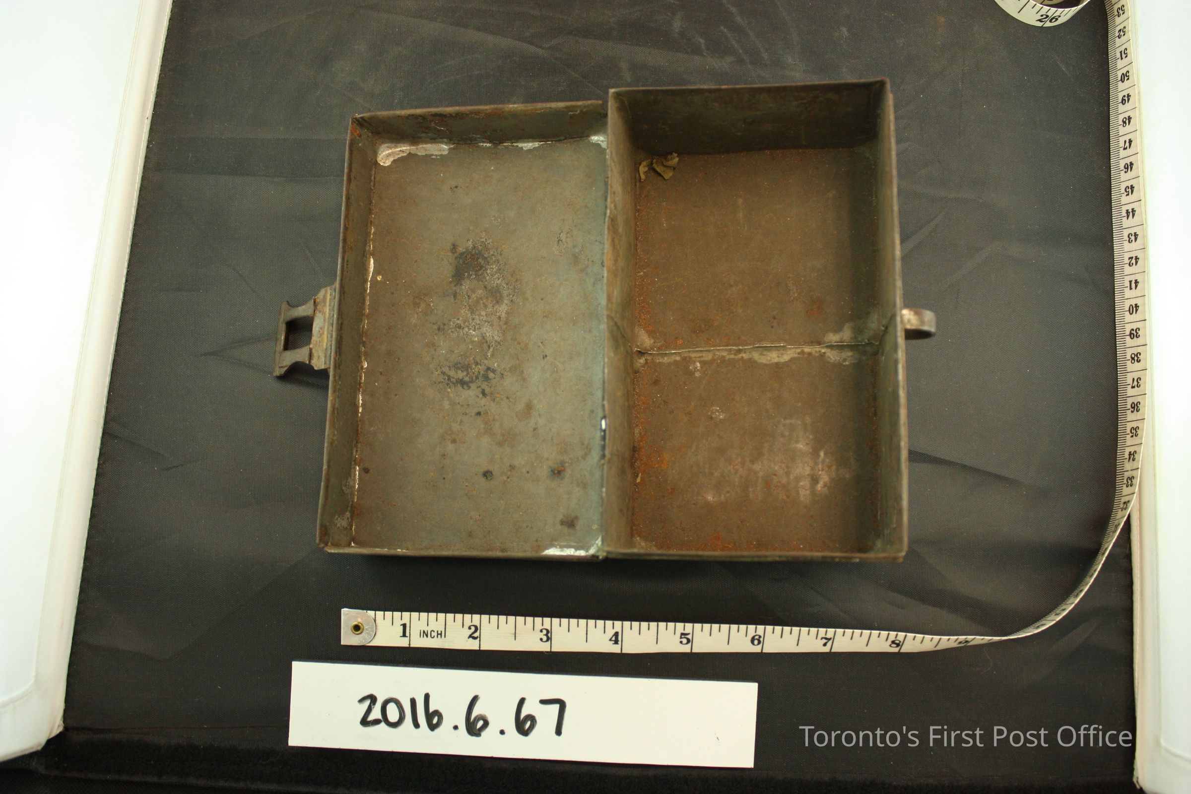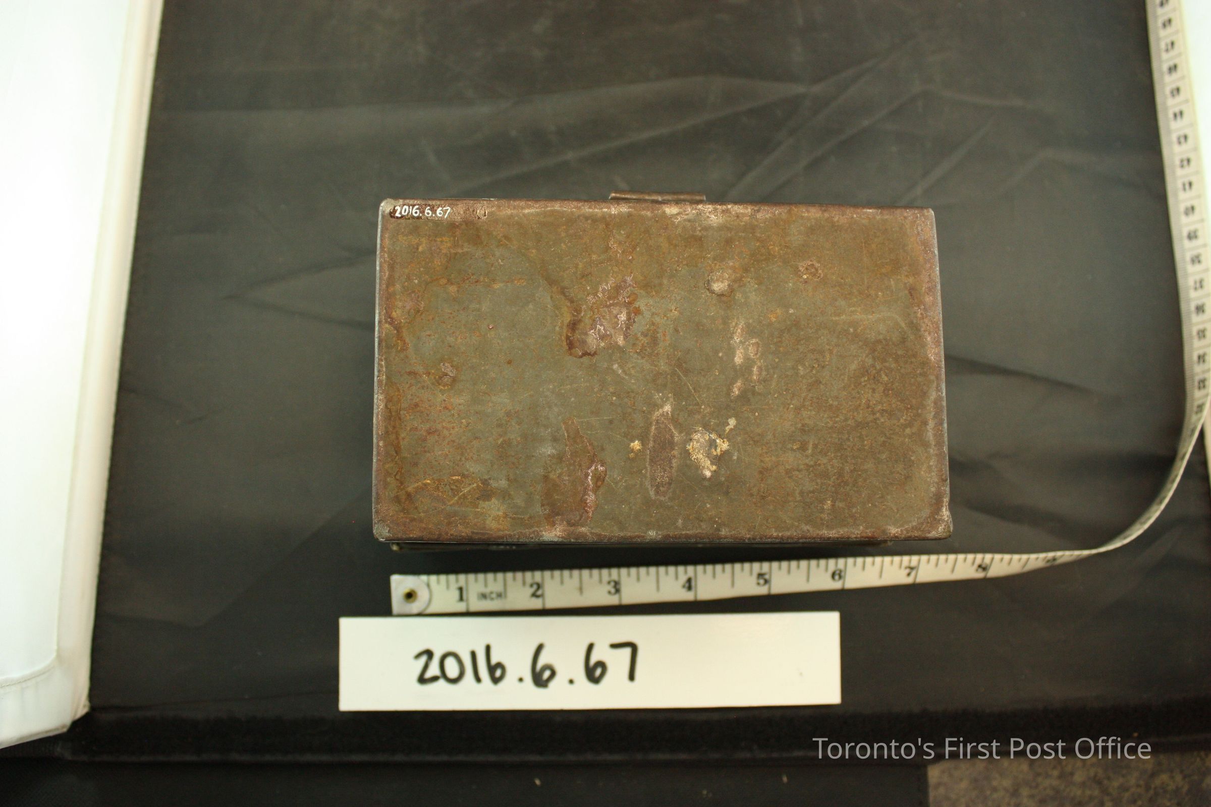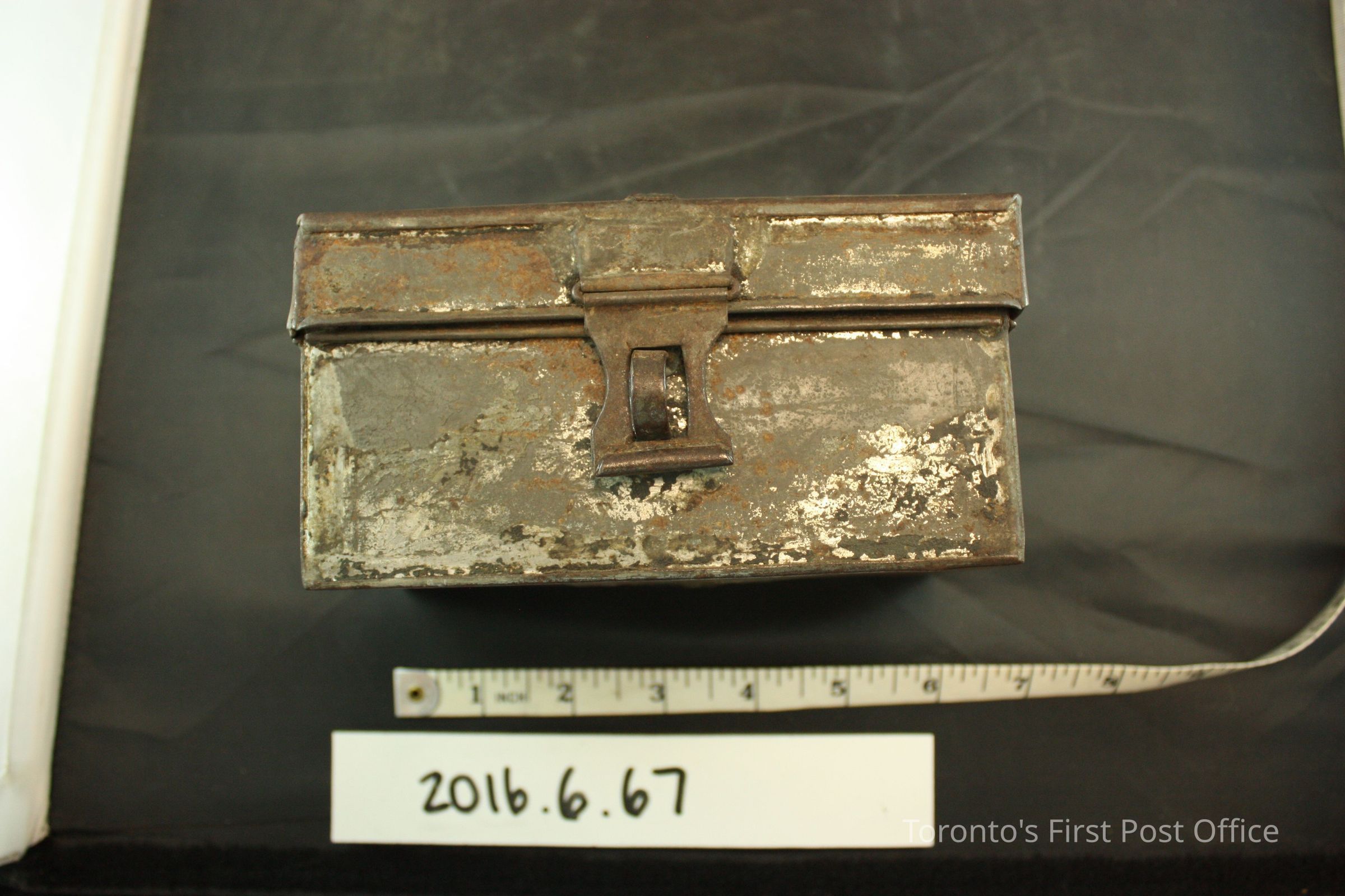 Domed tin (?) box with hinged lid. Lid swings away at 180° and is characterized by an additional metal band ornament in the middle. The rectangular latch catchs on a protruding metal hoop, is unlocked. A saudered lighter colour metal runs down the middle of the interior of the box, perhaps as a repair. Most likely painted entirely in black, paint pigments remain on the surface of the box.Dimensions