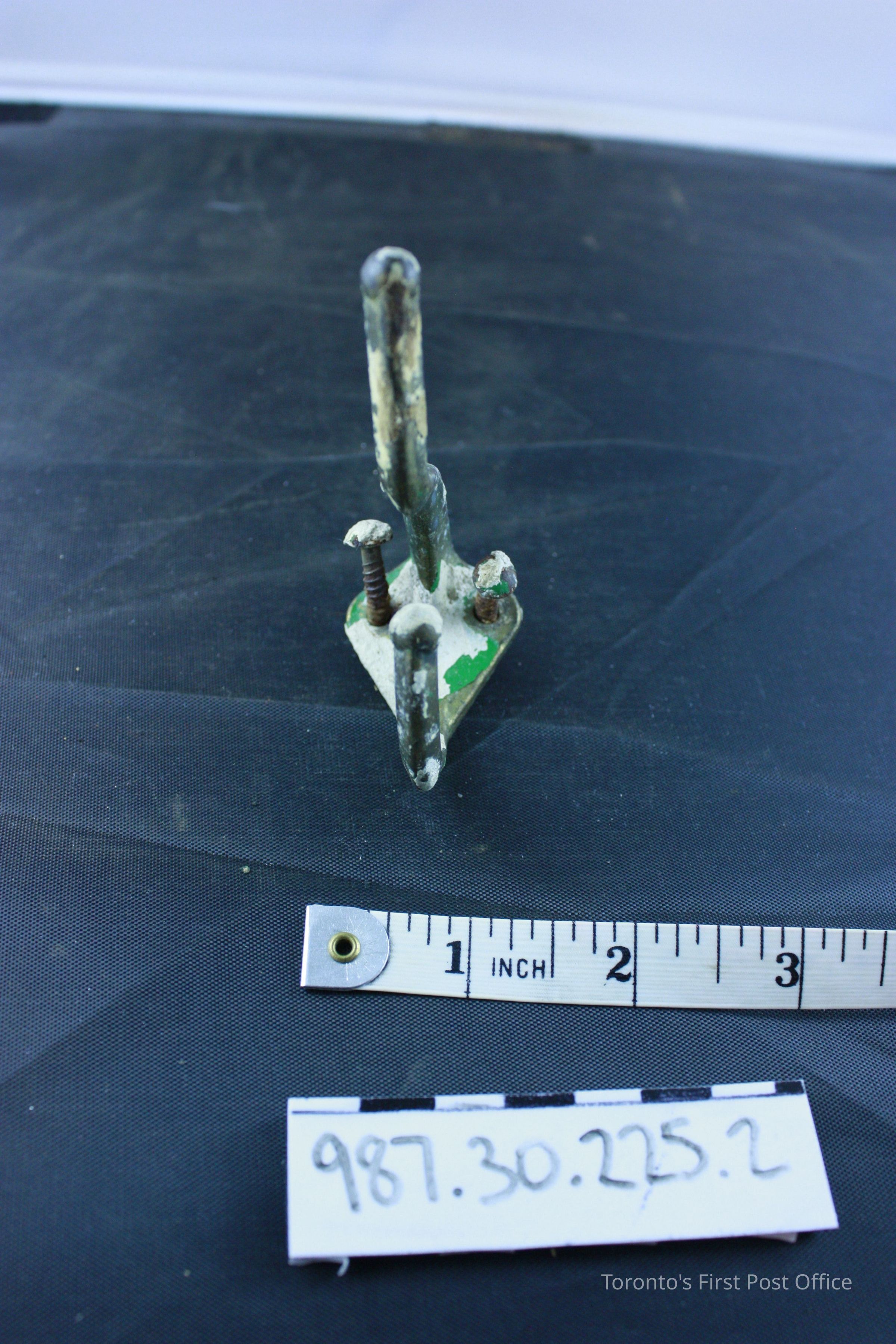 Brass coat hook; triangular back plate; two screw holes at top to attach to wall; screws still attached; two hooks; circa 1900.