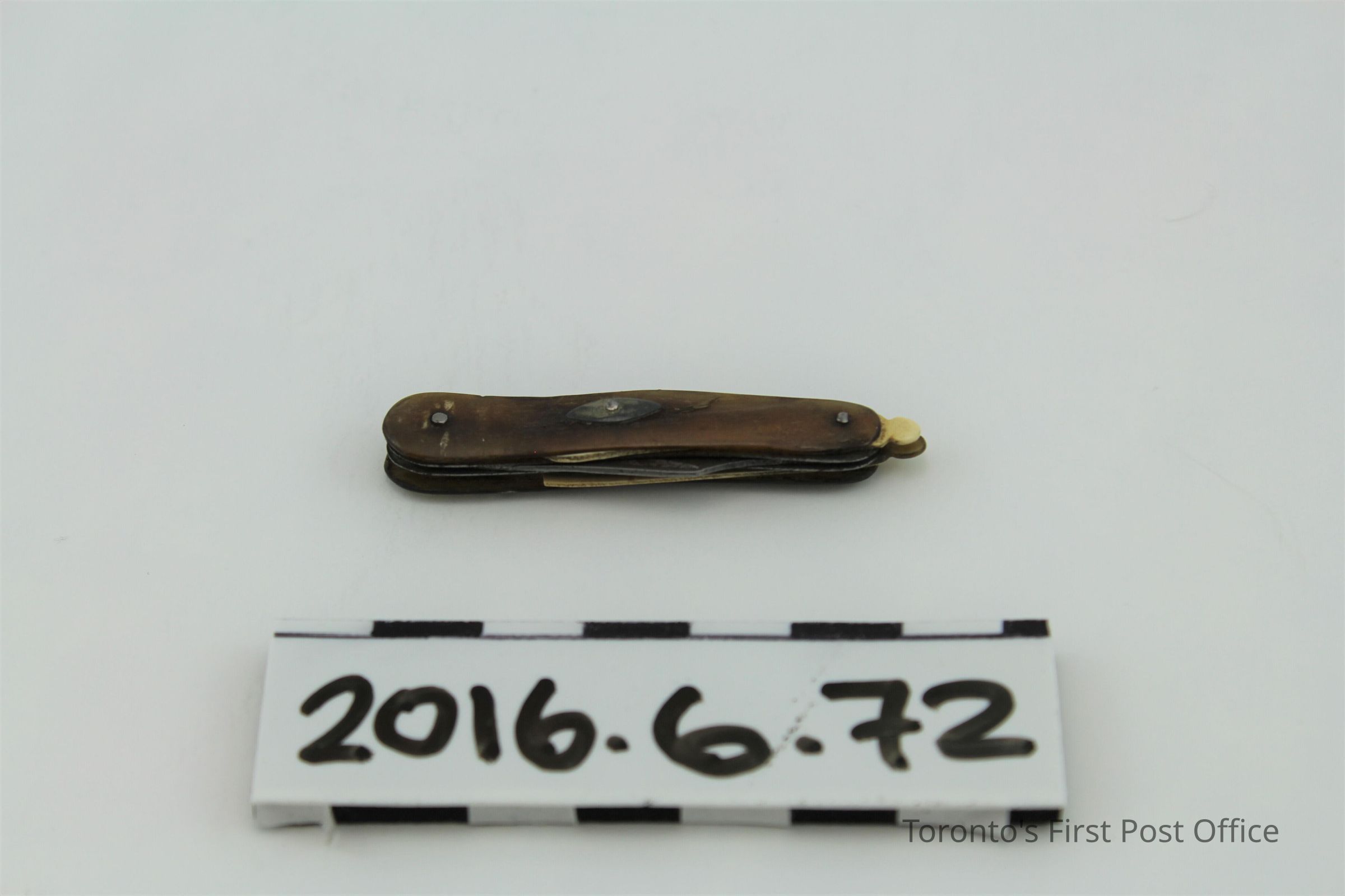 Personal hygiene knife with one blade, three plastic tools (one transparent toothpick, one opaque toothpick, one opaque scope). The sides are made of horn and held together by two pins on either end. There is a decorative pointed oval and pin in the center on one side. The knife swings away to the right and the three tools swing away to the left.Dimensions