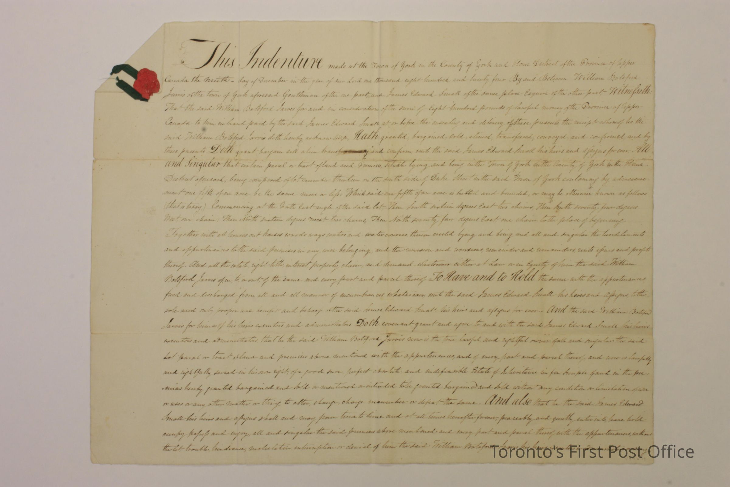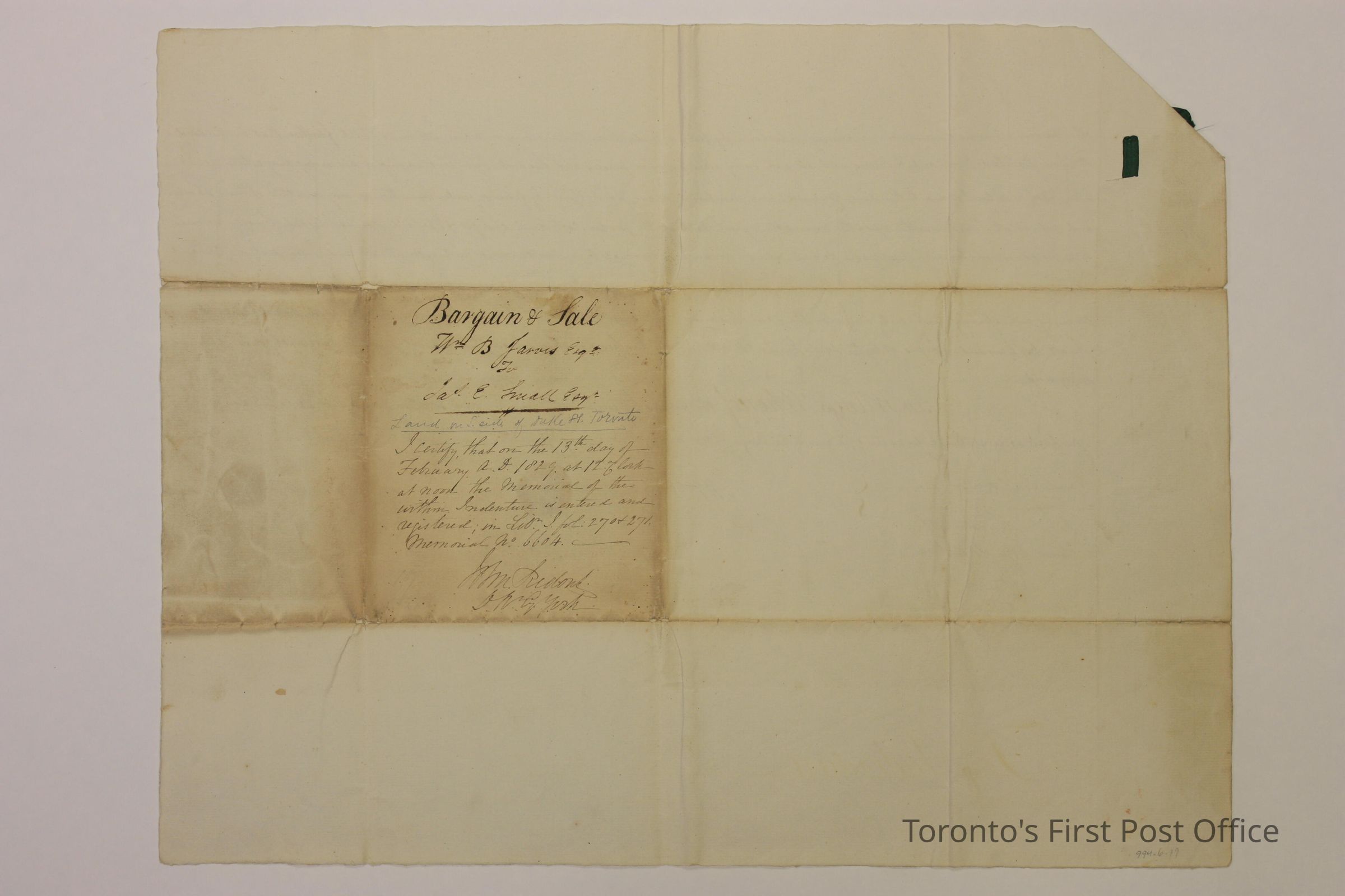 Indenture of bargain of sale between Wm B Jarvis Esq. and Jas. E. Small Esquire for land on south side of Duke St. Toronto; registered by J.M. Ridout Deputy Registrar, County of York; folio # 270 and 271; laid paper; 2 pp.; red seal and green ribbon; watermark: fleur de lis surmounted by crown; signed by John Cartwritght, ... Strachan, ... Tucker, B. Jarvis, Jas E Small.Dimensions