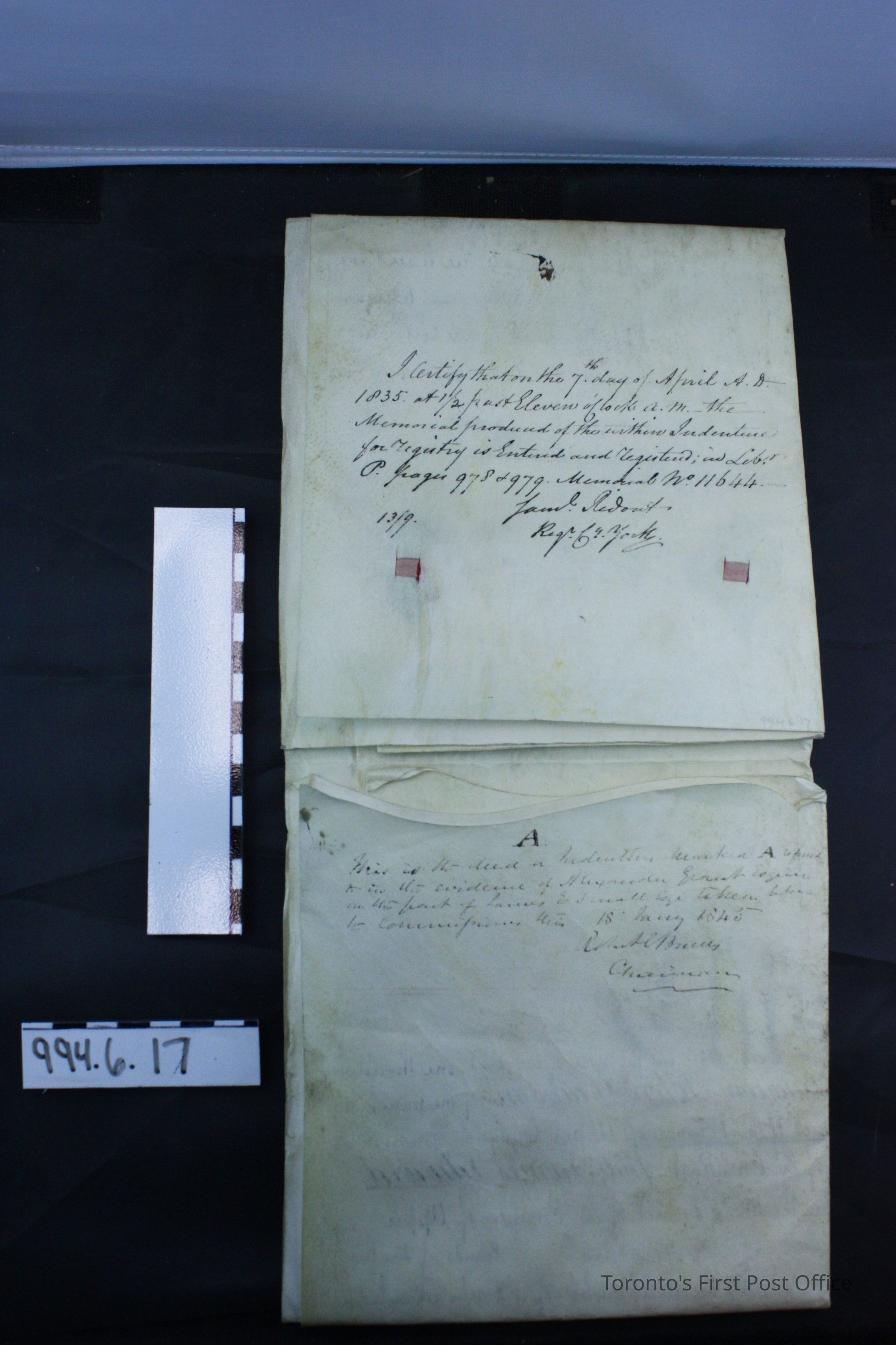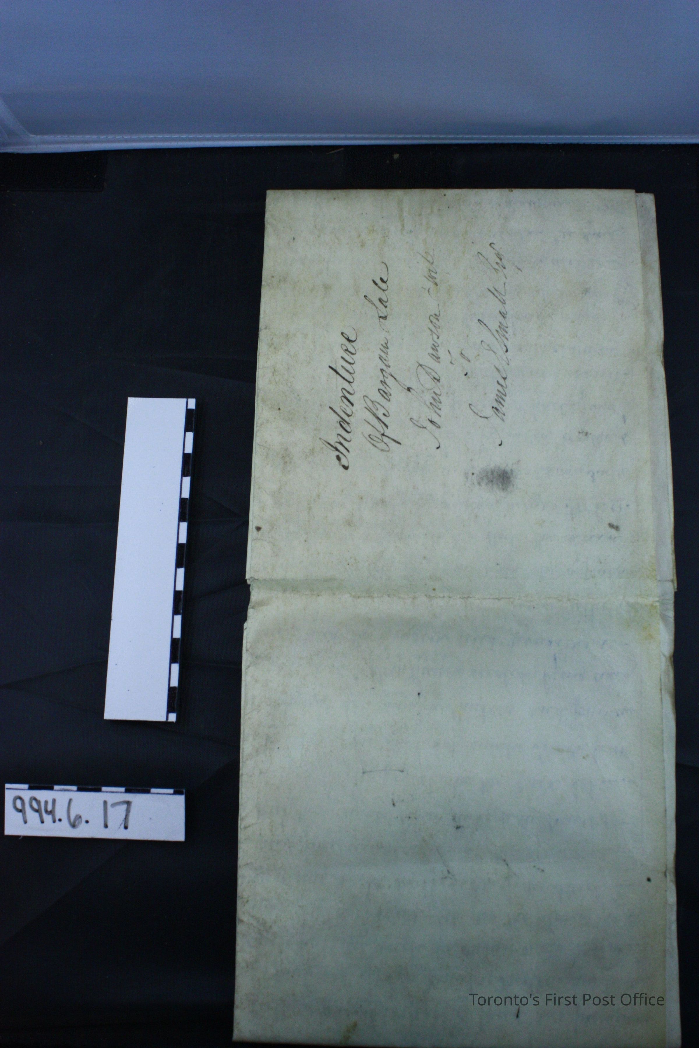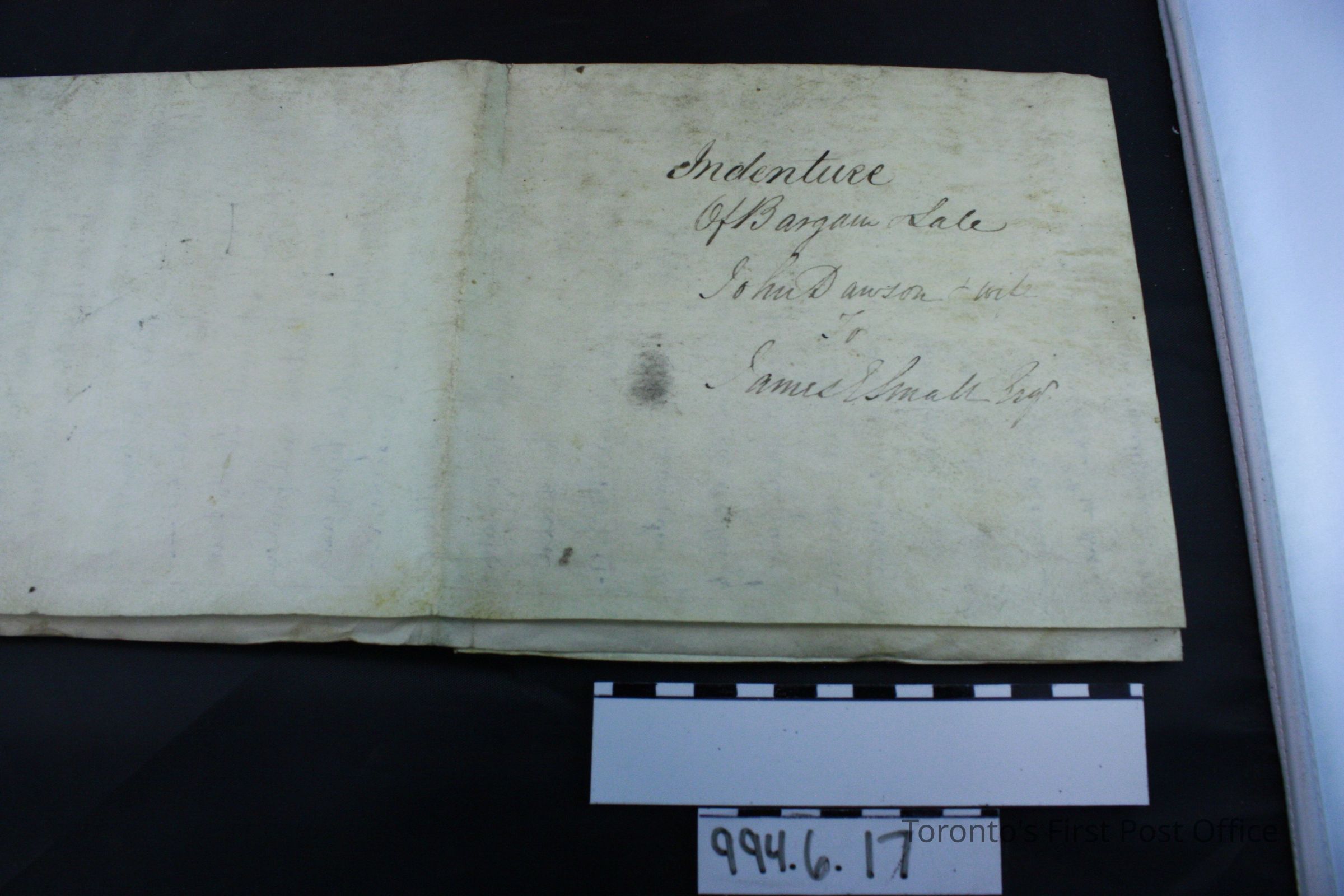 Indenture of bargain of sale between John Dawson and wife to James E. Small, Esq.; dated March 9, 1835; parchment; black ink; manuscript; wax seals with cross hatched design fastened to parchment with pink ribbon; signed by John Dawson, Elizabeth Dawson, George, Thos. Henderson.Update Date