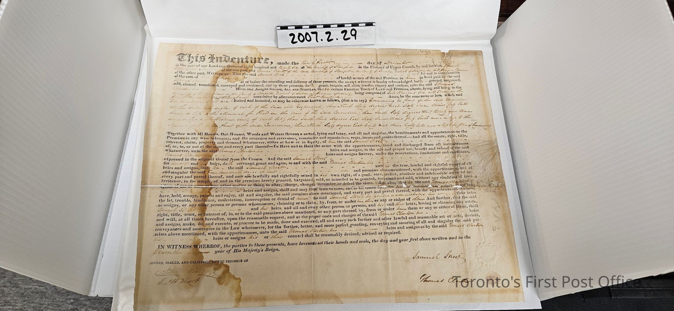 Indenture for sale of land in Norfolk County; between Samuel Street and Thomas Clarke and signed and sealed by each (Clarke's seal missing); print and manuscript; dated Dec 21 1826.Dimensions