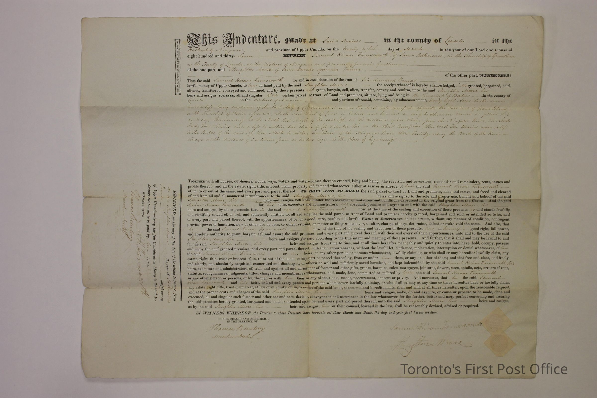 Indenture, document of land sale between Samuel Hiram Farnsworth and Stroughton Moore in 1837. Printed, on white paper, with blank spaces, hand written in blank spaces. Paper is folded in half down the vertical center line and again into fourths horizontally. Two wax seals covered in paper in bottom proper left on the front.Dimensions