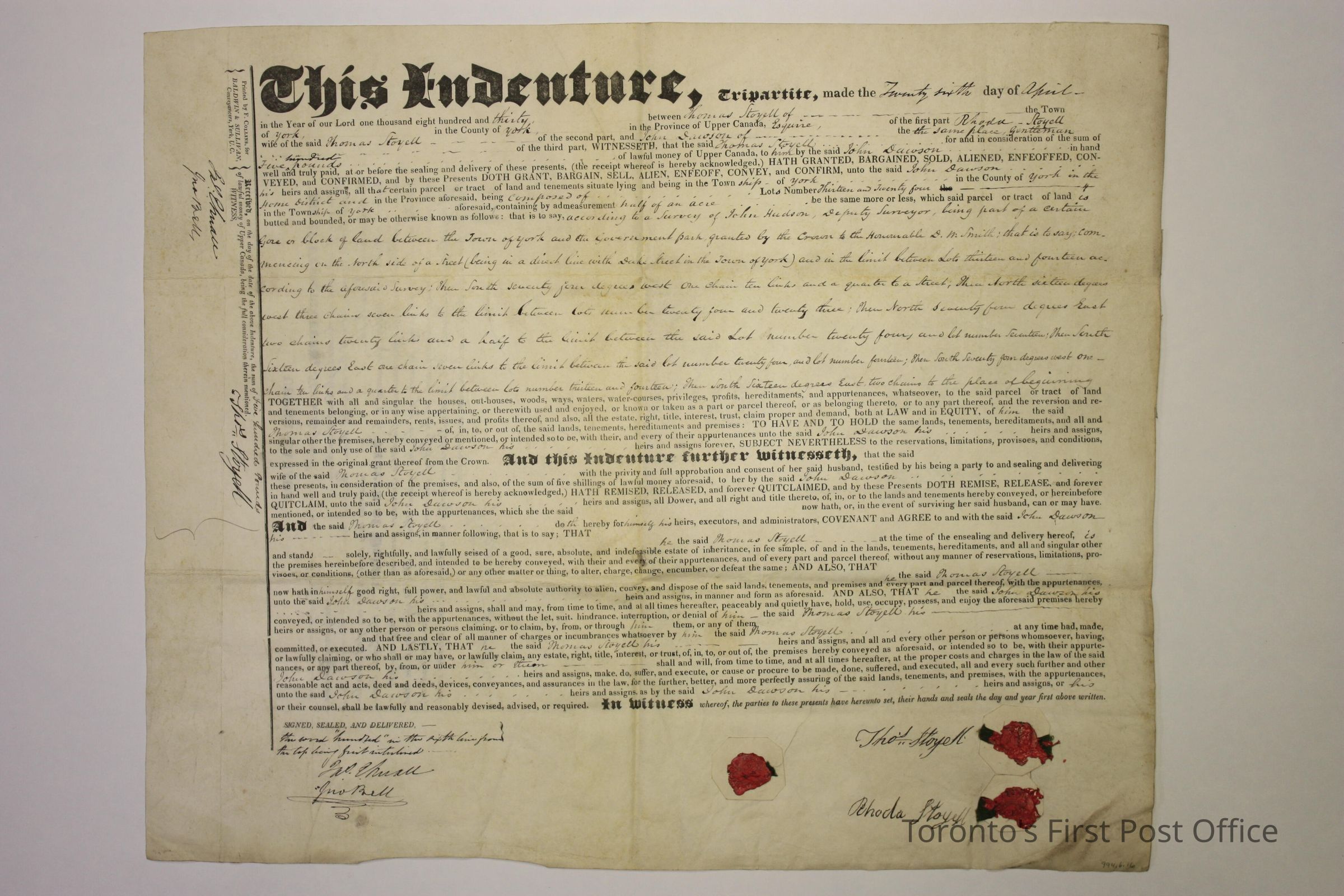 Indenture for sale of property between Thomas and Rhoda Stogell and John Dawson; registered by Thomas Ridout, County of York Registrar; Folio #128, 129, 130; dated 26 April 1830; parchment; manuscript and print; black ink; three red seals with no design discernable, fastened to parchment with green ribbon.Update Date