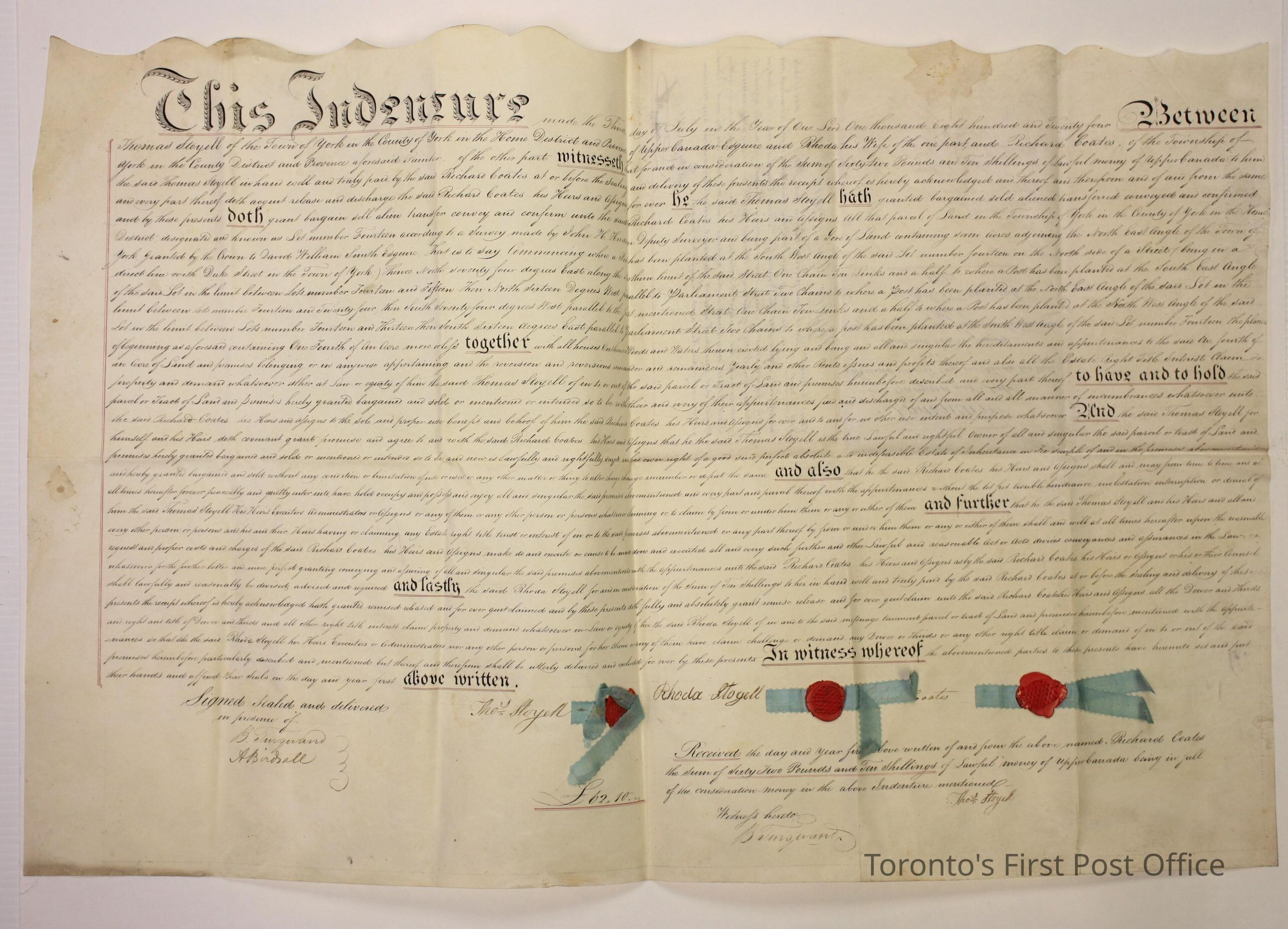 Indenture for land sale between Thomas and Rhoda Stogell and Richard Coates; signed by Rhoda Stogell, Thos. Stogell; witnessed by B. Tuguard and A. Birdsall; manuscript; red wax seal with ribbon by signatures; parchment.Update Date